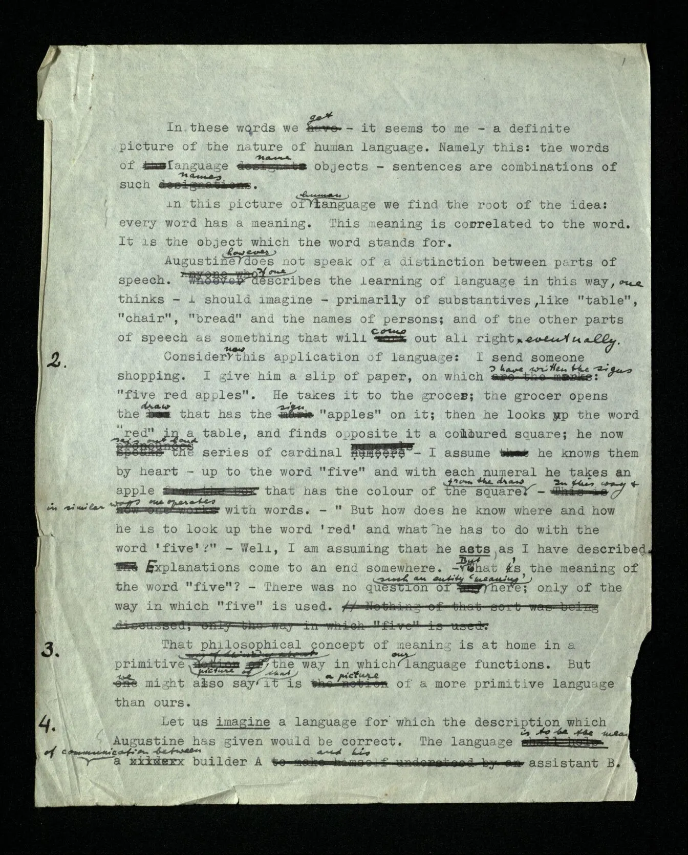 2 Consider now this application of language: I send someone shopping. I give him a slip of paper, on which I have written the signs: “five red apples”. He takes it to the grocer; the grocer opens the drawer that has the sign “apples” on it; then he looks up the word “red” in a table, and finds opposite it a coloured square; he now says out loud the series of cardinal numbers – I assume he knows them by heart – up to the word “five” and with each numeral he takes an apple that has the colour of the square from the drawer. – In this way & in similar ways one operates with words. – “But how does he know where and how he is to look up the word ‘red’ and what he has to do with the word ‘five’?” – Well, I am assuming that he acts, as I have described. Explanations come to an end somewhere. – But what’s the meaning of the word “five”? – There was no question of such an entity ‘meaning’ here; only of the way in which “five” is used.
