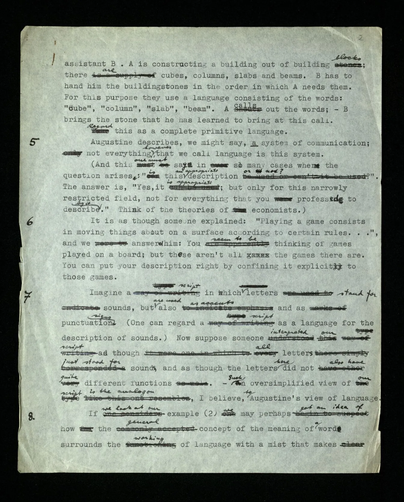 4 Let us imagine a language for which the description which Augustine has given would be correct. The language is to be the means of communication between a builder A and his assistant B. A is constructing a building out of building blocks; there are cubes, columns, slabs and beams. B has to hand him the building stones in the order in which A needs them. For this purpose they use a language consisting of the words: “cube”, “column”, “slab”, “beam”. A calls out the words; – B brings the stone that he has learned to bring at this call. Regard this as a complete primitive language.
