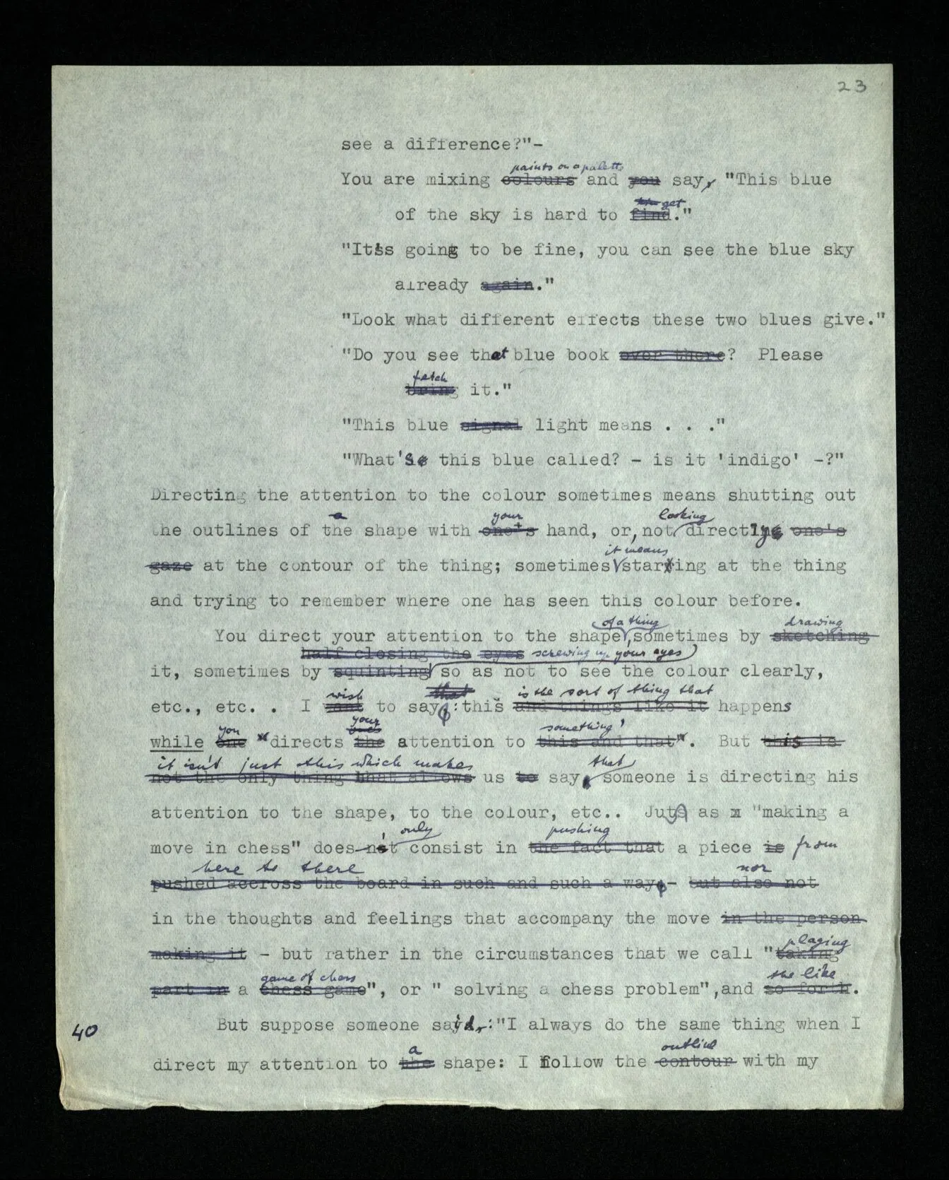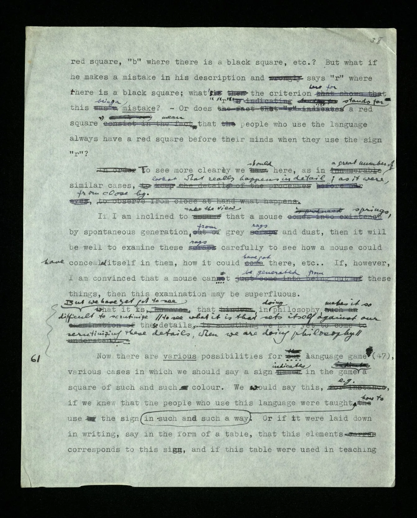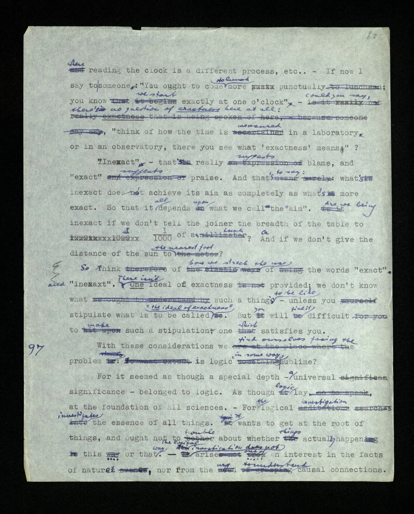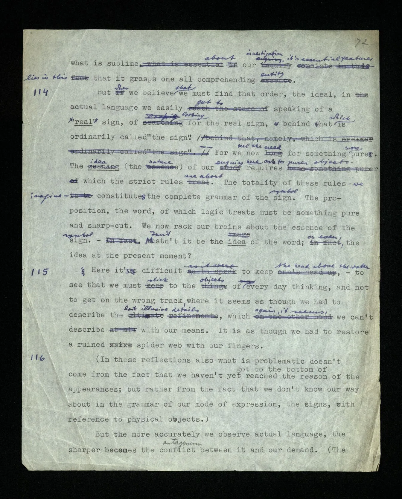 115 Here it’s difficult to keep the head above the water, – to see that we must stick to the objects of every day thinking, and not to get on the wrong track, where it seems as though we had to describe the last illusive details, which again, it seems, we can’t describe with our means. It is as though we had to restore a ruined spider web with our fingers.