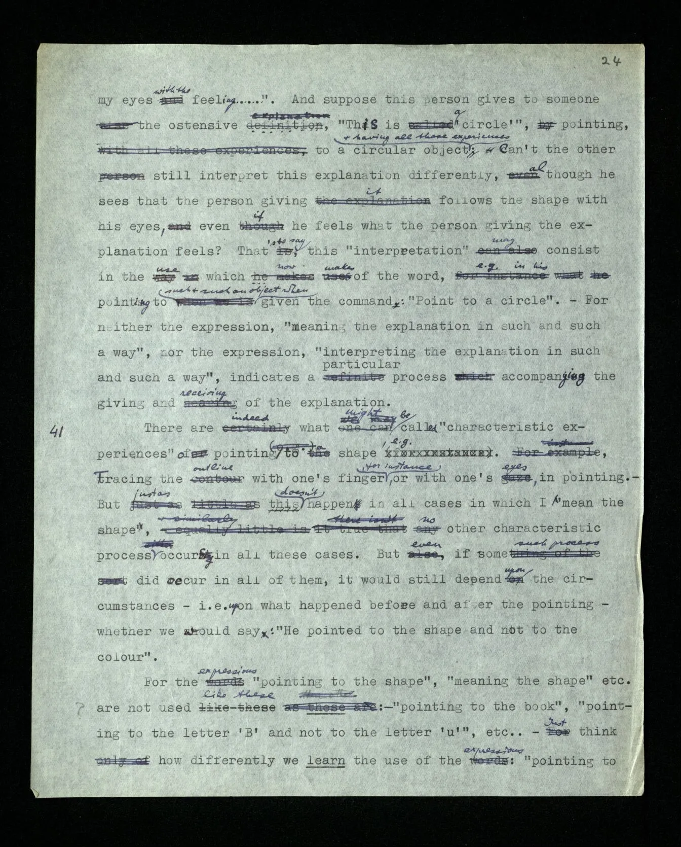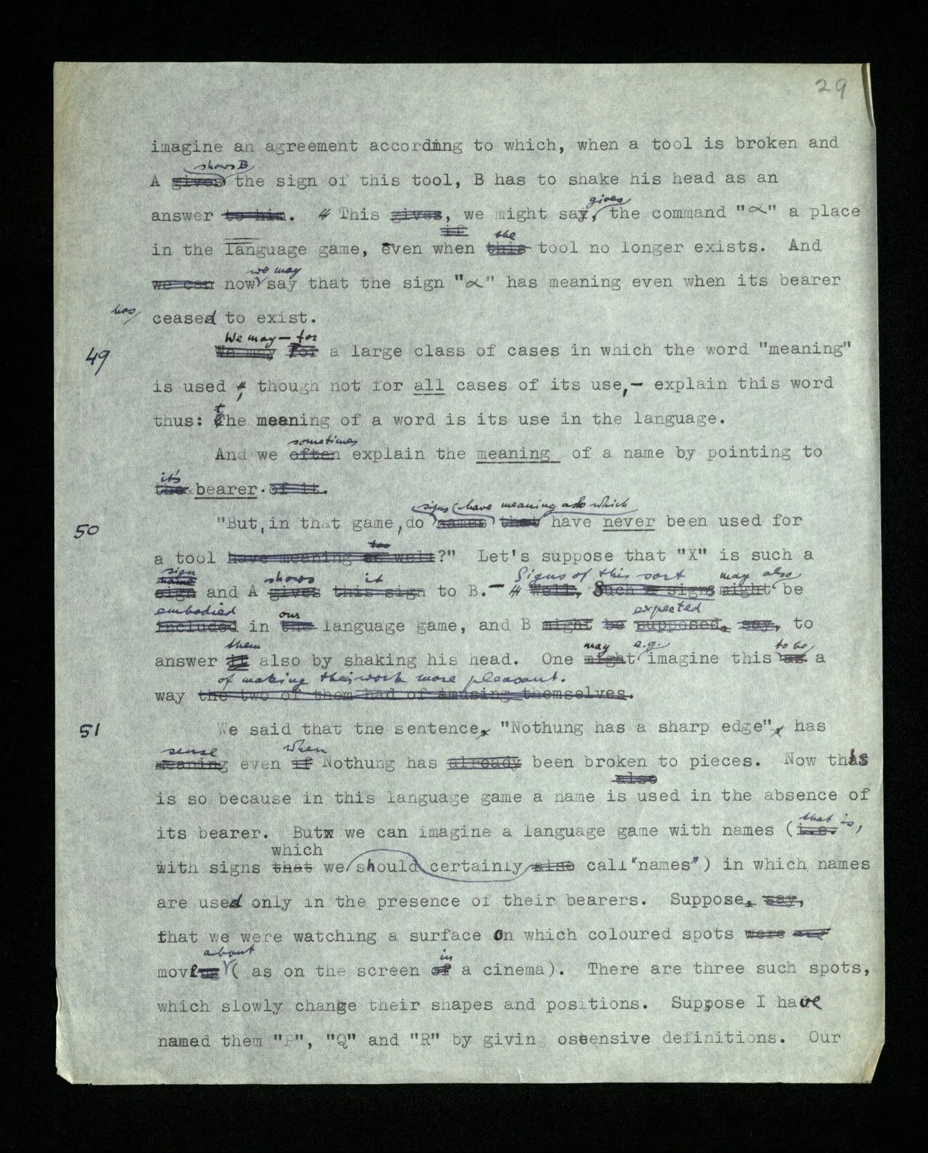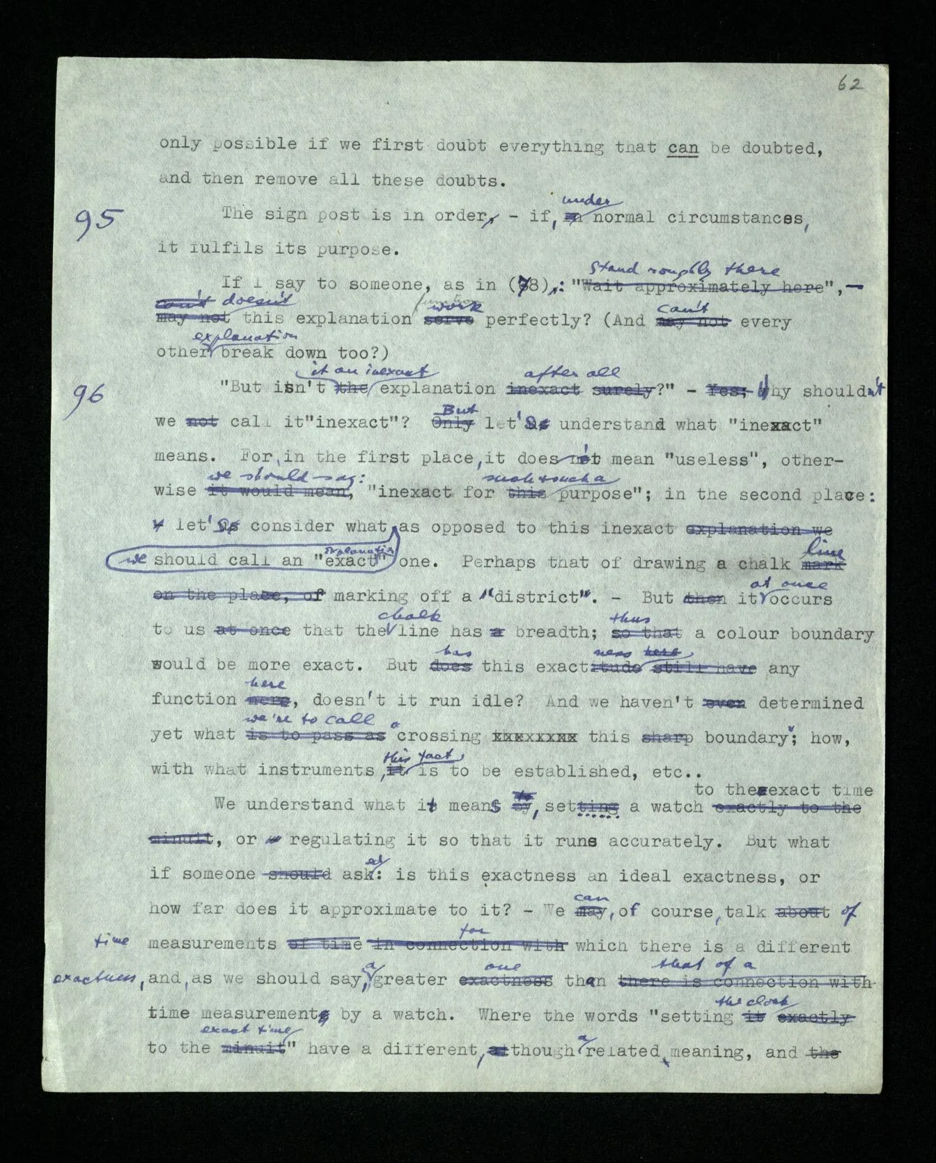 95 The sign post is in order – if, under normal circumstances, it fulfils its purpose. If I say to someone, as in (78): “Stand roughly there”, – doesn’t this explanation work perfectly? (And can’t every other explanation break down too?)