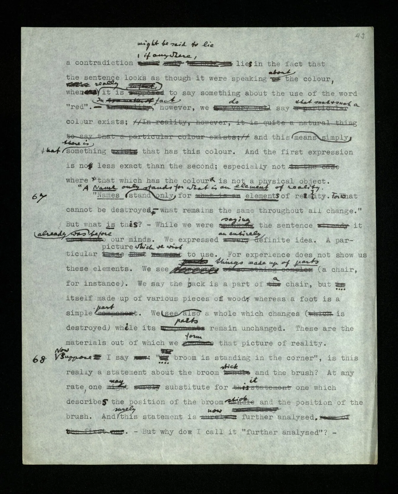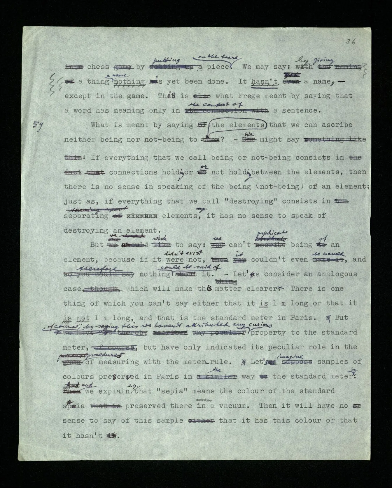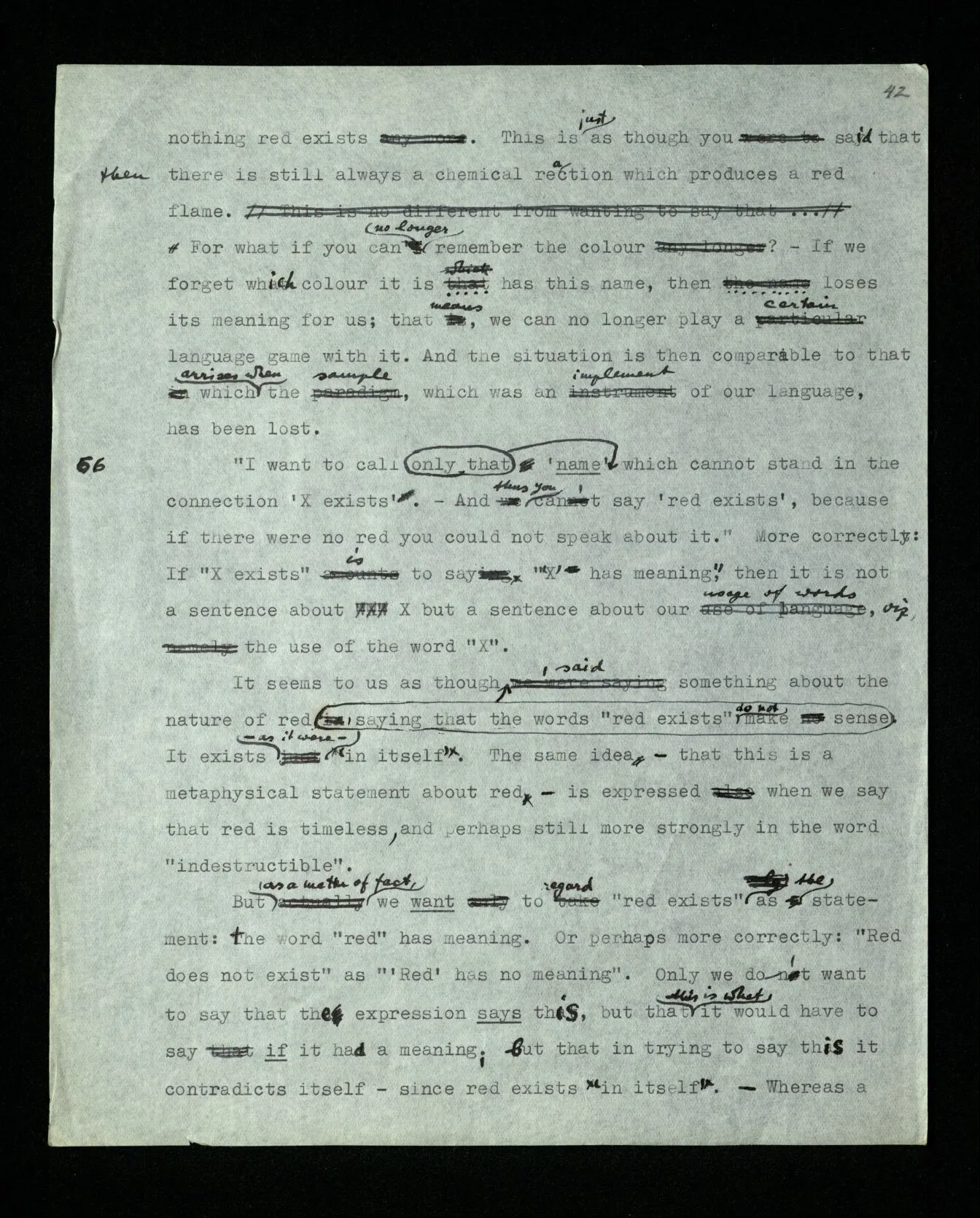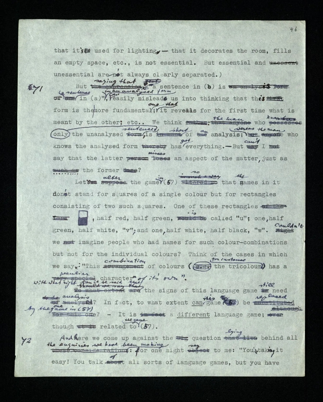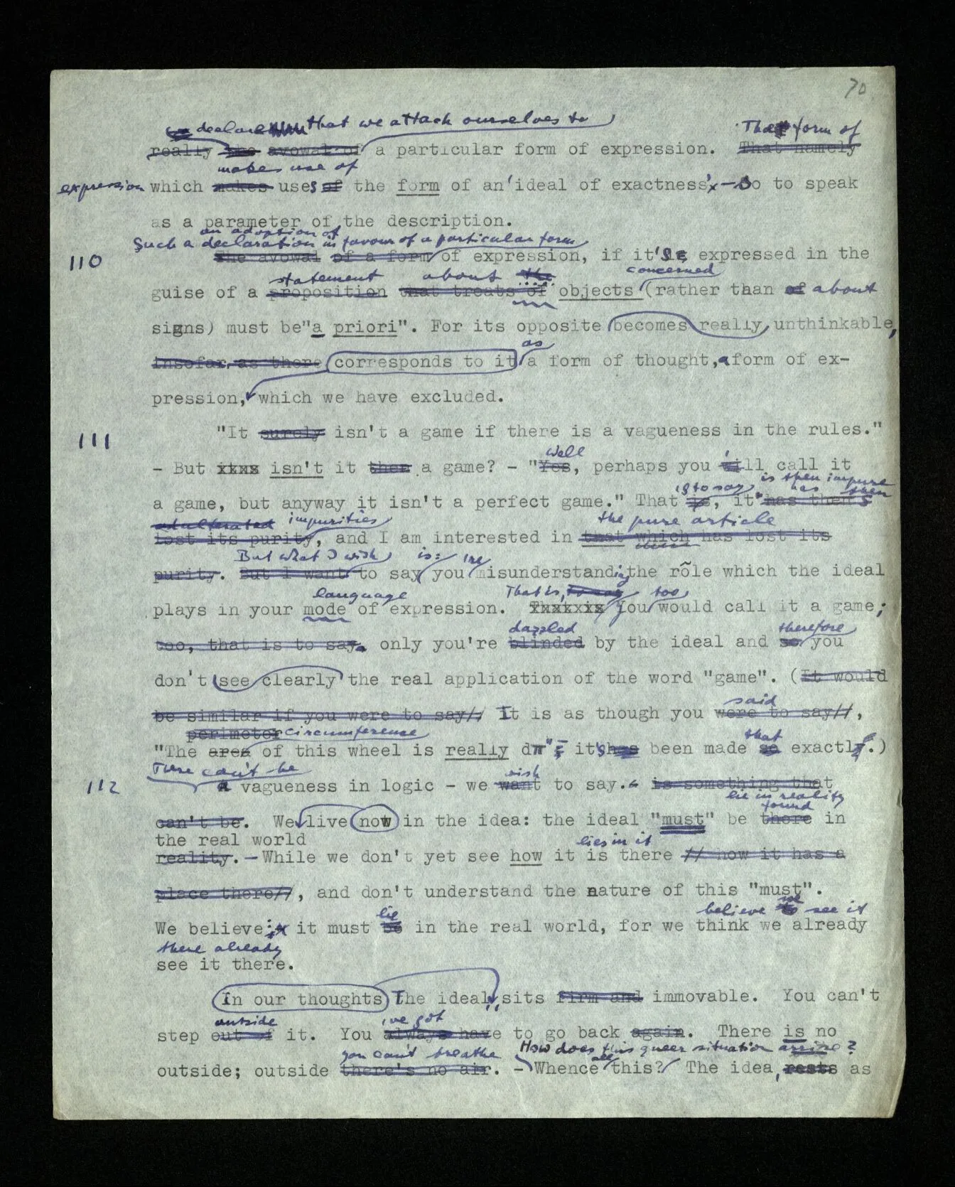110 Such a declaration in favour of a particular form of expression, if it’s expressed in the guise of a statement about the objects (rather than about signs) must be “a priori”. For its opposite really becomes unthinkable, as a form of thought, a form of expression corresponds to it, which we have excluded.