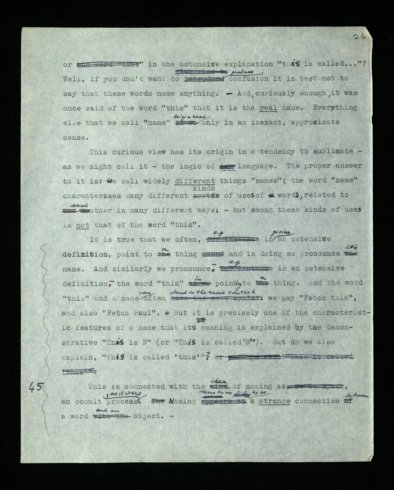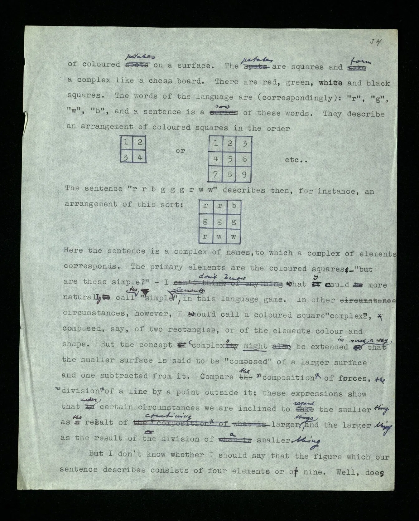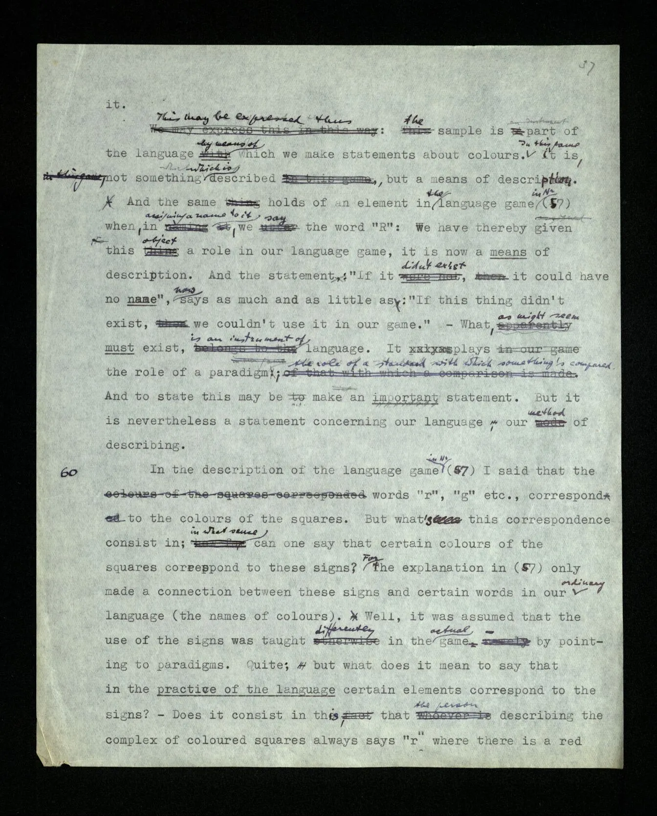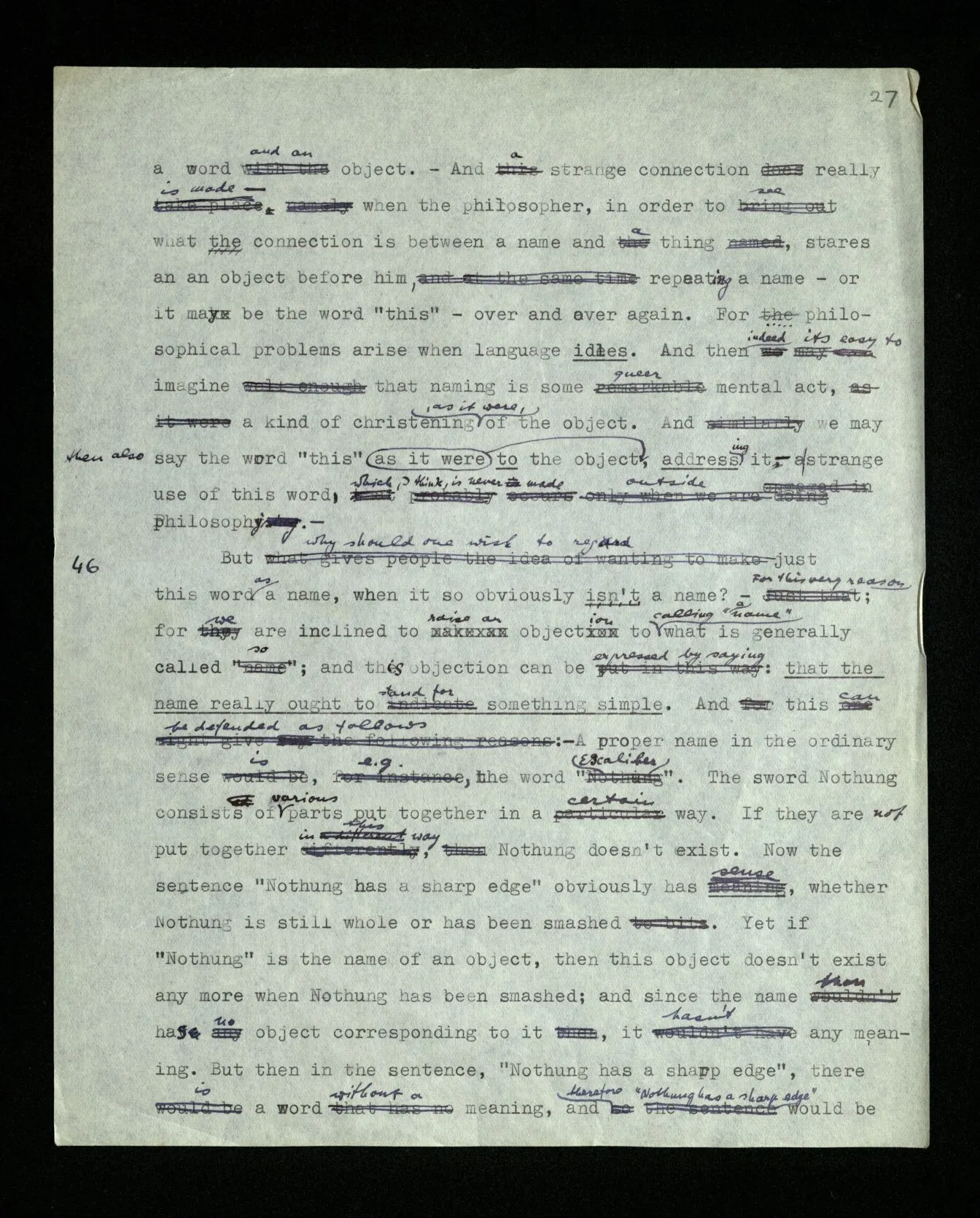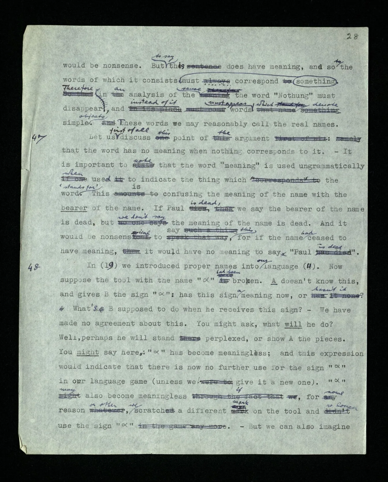 110 Such a declaration in favour of a particular form of expression, if it’s expressed in the guise of a statement about the objects (rather than about signs) must be “a priori”. For its opposite really becomes unthinkable, as a form of thought, a form of expression corresponds to it, which we have excluded.