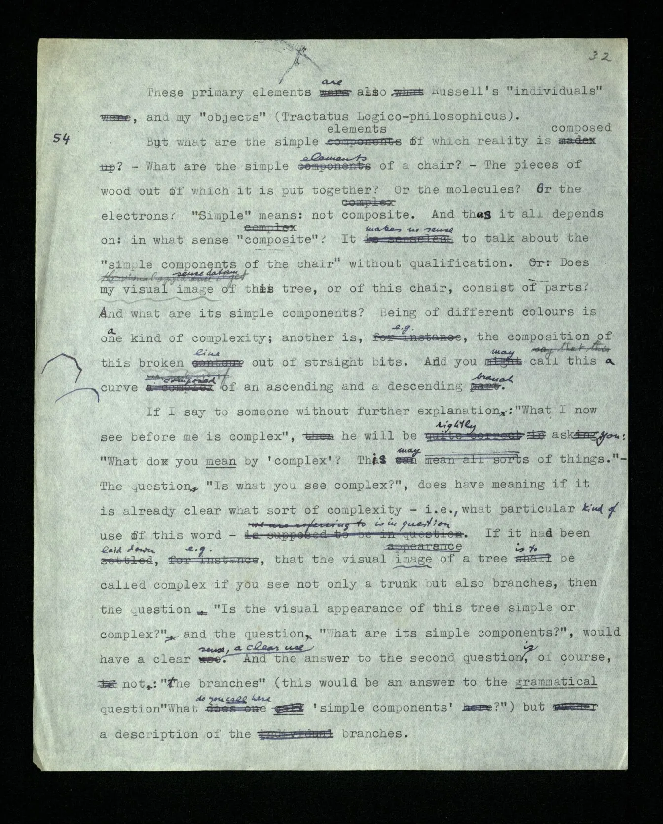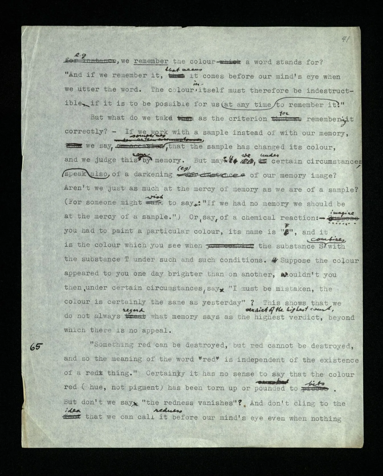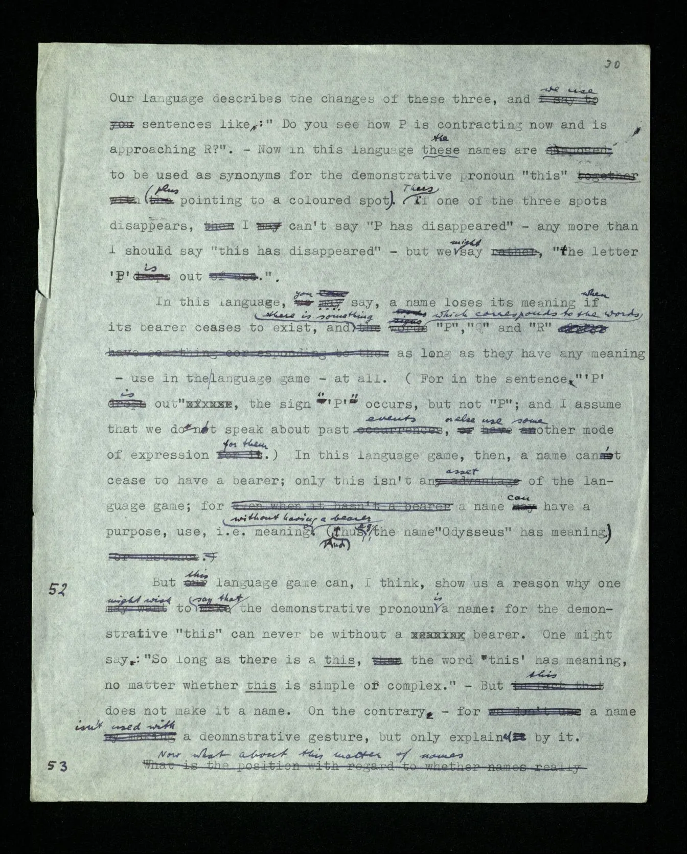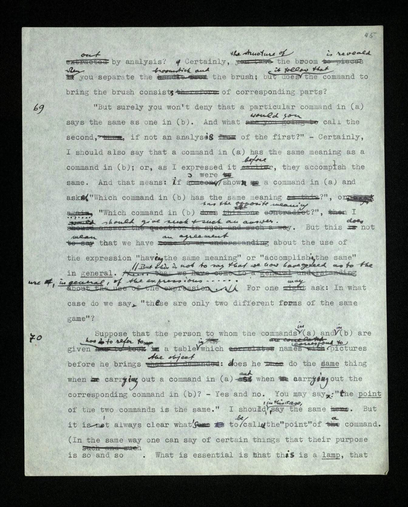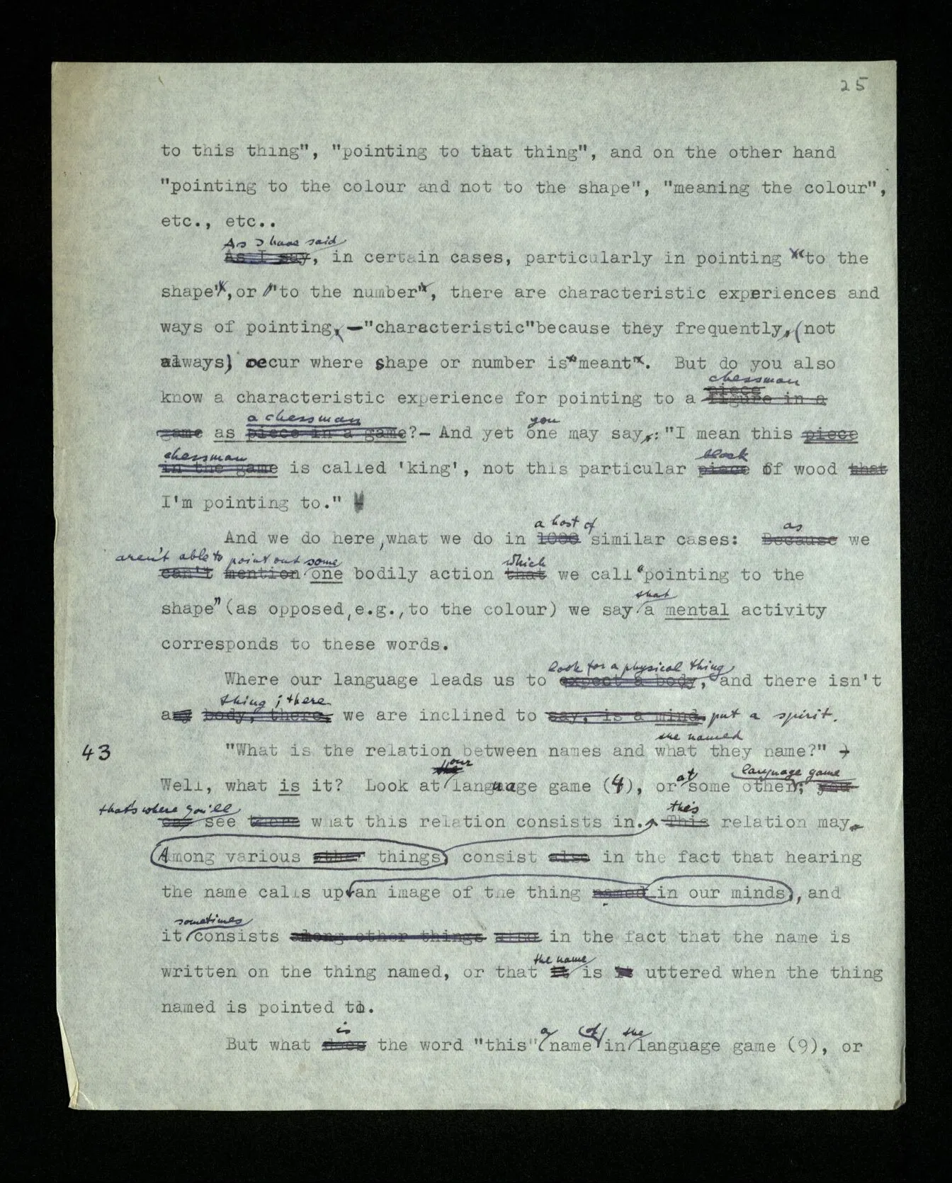 110 Such a declaration in favour of a particular form of expression, if it’s expressed in the guise of a statement about the objects (rather than about signs) must be “a priori”. For its opposite really becomes unthinkable, as a form of thought, a form of expression corresponds to it, which we have excluded.