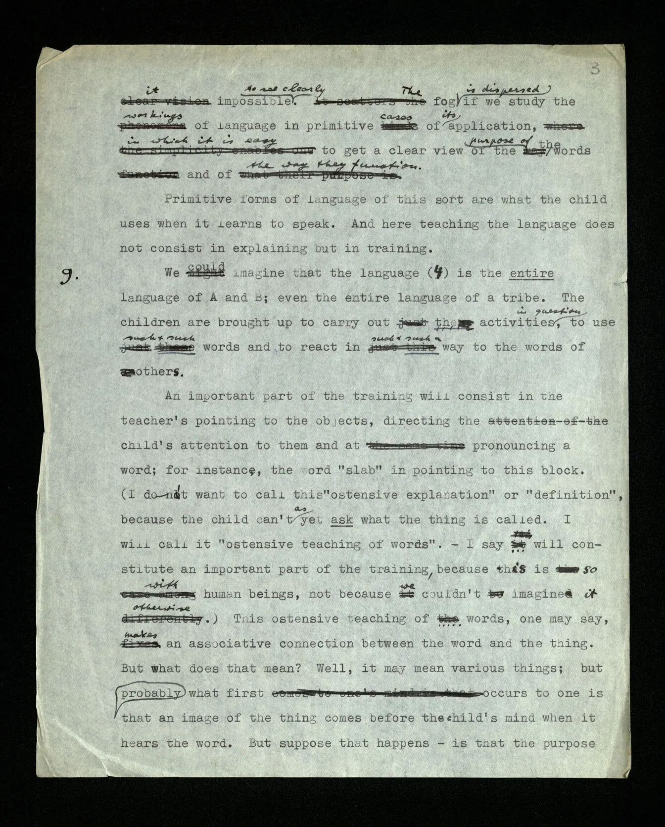 8 If we look at our example (2) we may perhaps get an idea of how the general concept of the meaning of a word surrounds the working of language with a mist that makes it impossible to see clearly. The fog is dispersed if we study the workings of language in primitive cases of its application, in which it is easy to get a clear view of the purpose of the words and of the way they function. Primitive forms of language of this sort are what the child uses when it learns to speak. And here teaching the language does not consist in explaining but in training.