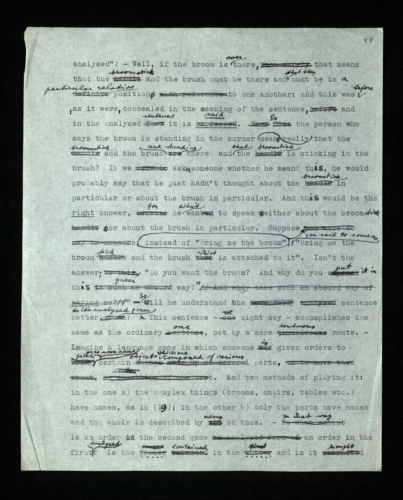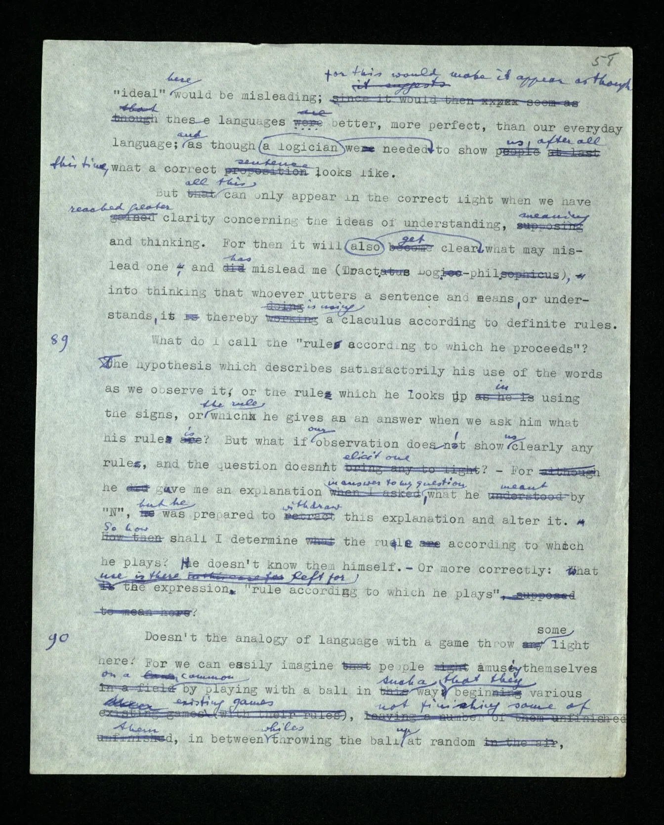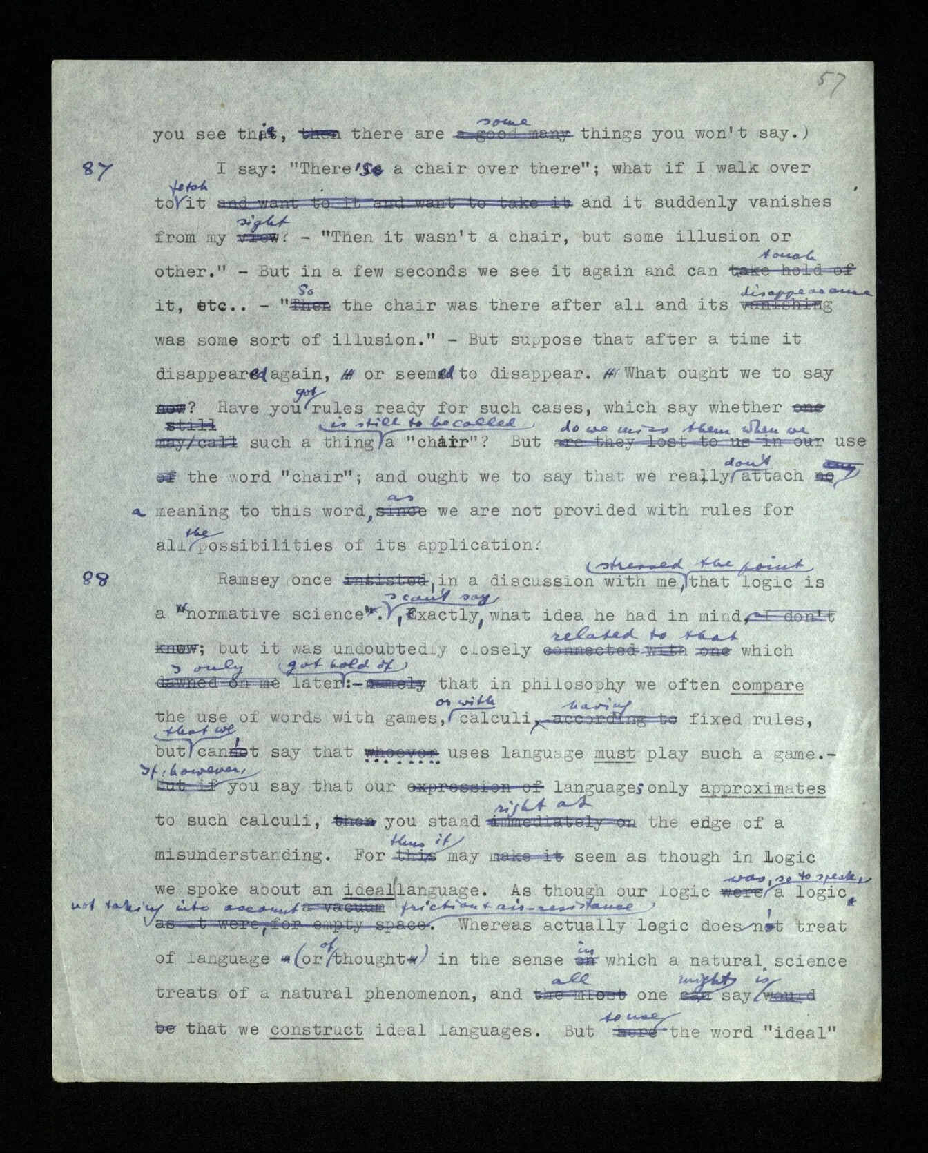 88 Ramsey once, in a discussion with me, stressed the point that logic is a ‘normative science’. I can’t say, exactly, what idea he had in mind; but it was undoubtedly closely related to that which I only later got hold of: – that in philosophy we often compare the use of words with games, or with calculi having fixed rules, but that we can’t say that whoever uses language must play such a game. – If, however, you say that our languages only approximate to such a calculi, you stand right at the edge of a misunderstanding. For thus it may seem as though in logic we spoke about an ideal language. As though our logic was, so to speak, a logic not taking into account friction & air-resistance. Whereas actually logic doesn’t treat of language (or of thought) in the sense in which a natural science treats of a natural phenomenon, and all one might say is that we construct ideal languages. But to use the word “ideal” here would be misleading; for this would make it appear as though these languages were better, more perfect, than our everyday language; and as though we needed a logician to show us, after all this time, what a correct sentence looks like. But all this can only appear in the correct light when we have reached greater clarity concerning the ideas of understanding, meaning and thinking. For then it will get clear also what may mislead one, and has misled me (Tract. Log.-Phil.), into thinking that whoever utters a sentence and means, or understands, it thereby is using a calculus according to definite rules.