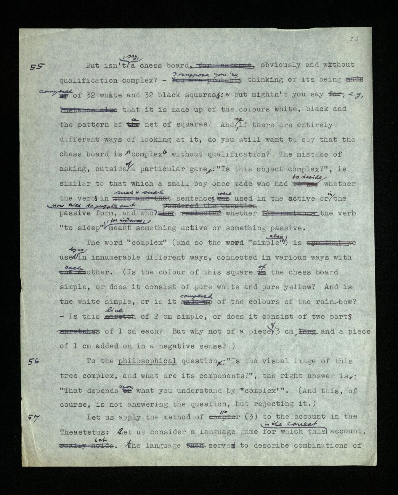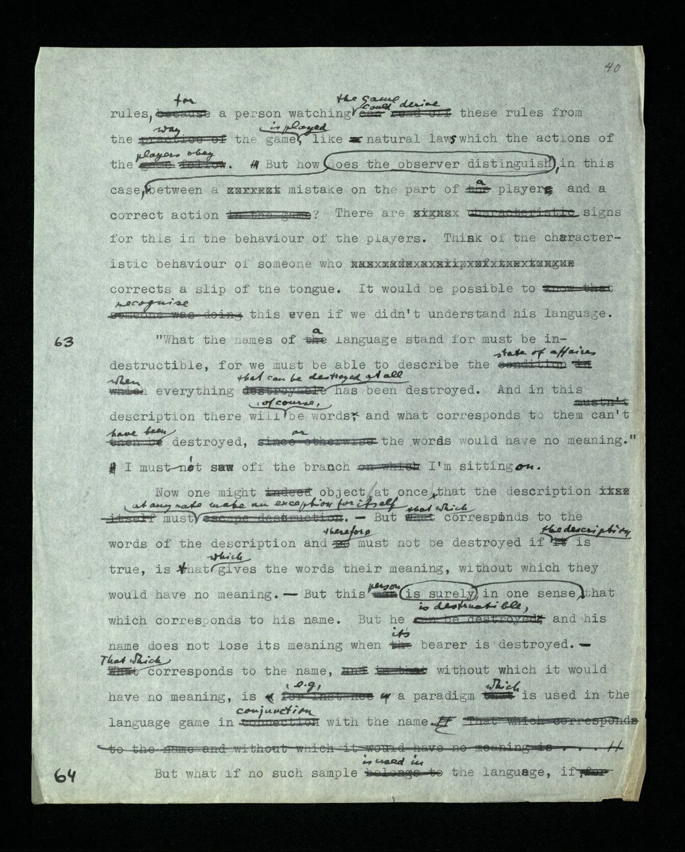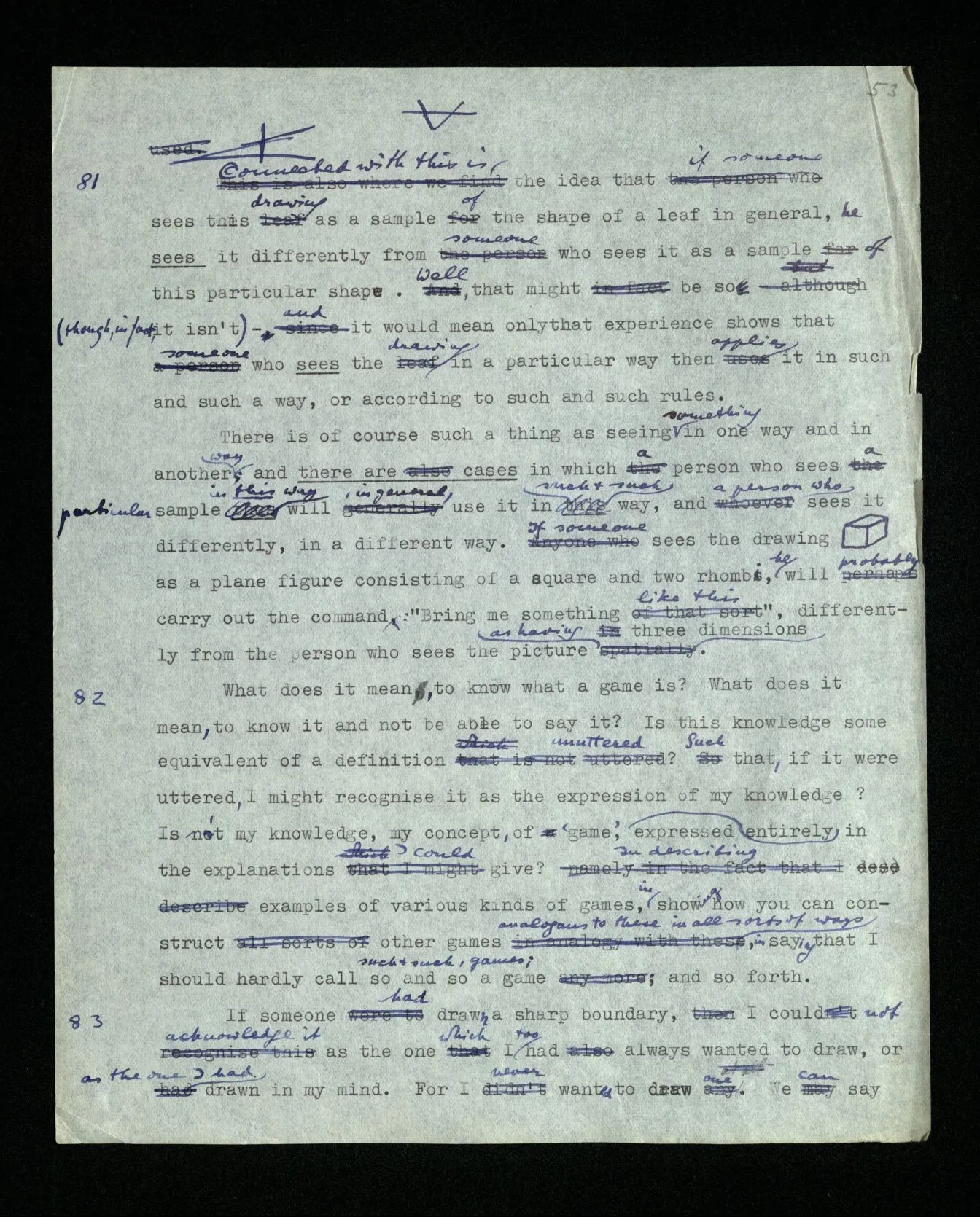 88 Ramsey once, in a discussion with me, stressed the point that logic is a ‘normative science’. I can’t say, exactly, what idea he had in mind; but it was undoubtedly closely related to that which I only later got hold of: – that in philosophy we often compare the use of words with games, or with calculi having fixed rules, but that we can’t say that whoever uses language must play such a game. – If, however, you say that our languages only approximate to such a calculi, you stand right at the edge of a misunderstanding. For thus it may seem as though in logic we spoke about an ideal language. As though our logic was, so to speak, a logic not taking into account friction & air-resistance. Whereas actually logic doesn’t treat of language (or of thought) in the sense in which a natural science treats of a natural phenomenon, and all one might say is that we construct ideal languages. But to use the word “ideal” here would be misleading; for this would make it appear as though these languages were better, more perfect, than our everyday language; and as though we needed a logician to show us, after all this time, what a correct sentence looks like. But all this can only appear in the correct light when we have reached greater clarity concerning the ideas of understanding, meaning and thinking. For then it will get clear also what may mislead one, and has misled me (Tract. Log.-Phil.), into thinking that whoever utters a sentence and means, or understands, it thereby is using a calculus according to definite rules.