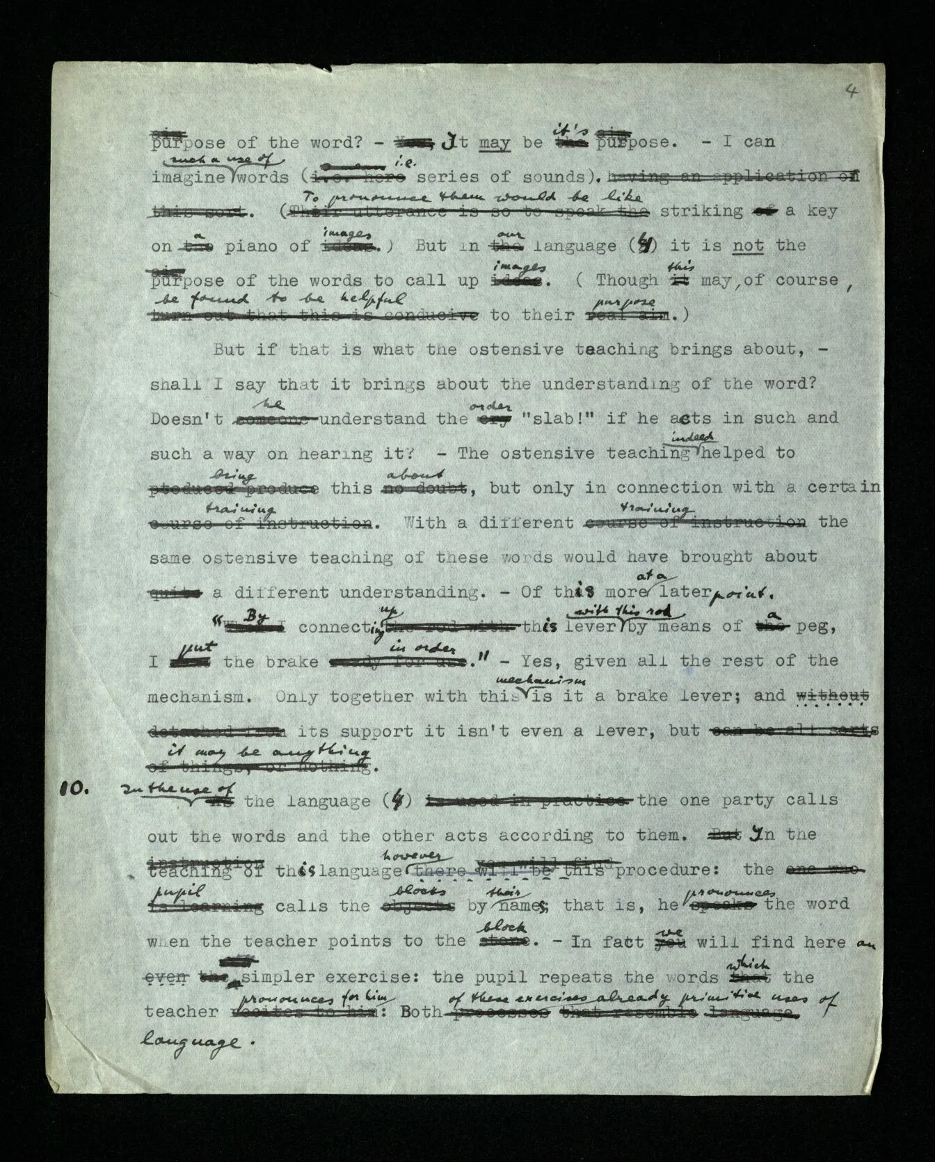 9 We could imagine that the language (4) is the entire language of A and B; even the entire language of a tribe. The children are brought up to carry out the activities in question, to use such & such words and to react in such & such a way to the words of others. An important part of the training will consist in the teacher’s pointing to the objects, directing the child’s attention to them and pronouncing a word; for instance, the word ‘slab’ in pointing to this block. (I don’t want to call this “ostensive explanation” or “definition”, because the child can’t as yet ask what the thing is called. I will call it “ostensive teaching of words”. – I say it will constitute an important part of the training, because this is so with human beings, not because we couldn’t imagine it otherwise.) This ostensive teaching of the words, one might say, makes an associative connection between the word and the thing. But what does that mean? Well, it may mean various things; but what first occurs to one is probably that an image of the thing comes before the child’s mind when it hears the word. But suppose that happens – is that the purpose of the word? – It may be its purpose. – I can imagine such a use of words (i.e. series of sounds). (To pronounce them would be like striking a key on a piano of images.) But in our language (4) it is not the purpose of the words to call up images. (Though this may, of course, be found to be helpful to their purpose.) But if that is what the ostensive teaching brings about, – shall I say that it brings about the understanding of the word? Doesn’t he understand the order “slab!” if he acts in such and such a way on hearing it? – The ostensive teaching indeed helped to bring this about, but only in connection with a certain training. With a different training the same ostensive teaching of these words would have brought about a different understanding. – Of this more at a later point. “By connecting up this lever with this rod by means of a peg, I put the brake in order.” – Yes, given all the rest of the mechanism. Only together with this mechanism is it a brake lever; and without its support it isn’t even a lever, but it may be anything.