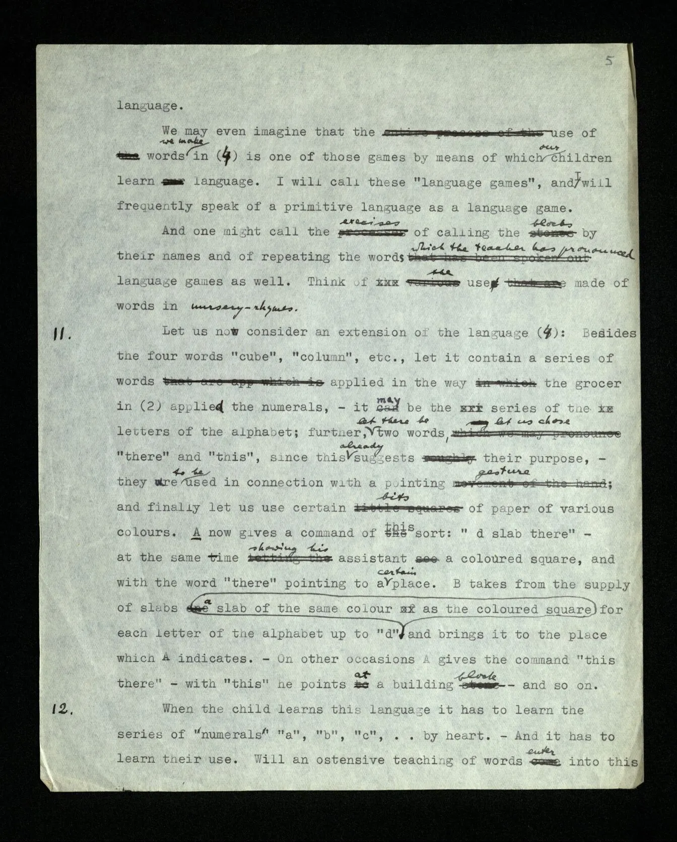 11 Let us now consider an extension of the language (4): Besides the four words “cube”, “column” etc., let it contain a series of words applied in the way the grocer in (2) applied the numerals, – it may be the series of the letters of the alphabet; further, let there be two words, let us choose “there” and “this”, since this already suggests their purpose, – they are to be used in connection with a pointing gesture; and finally let us use certain bits of paper of various colours. A now gives a command of this sort: “d slab there” – at the same time showing his assistant a coloured square, and with the word “there” pointing to a certain place. B takes from the supply of slabs for each letter of the alphabet up to “d” a slab of the same colour as the coloured square and brings it to the place which A indicates. – On other occasions A gives the command “this there” – with “this” he points at a building block – and so on.