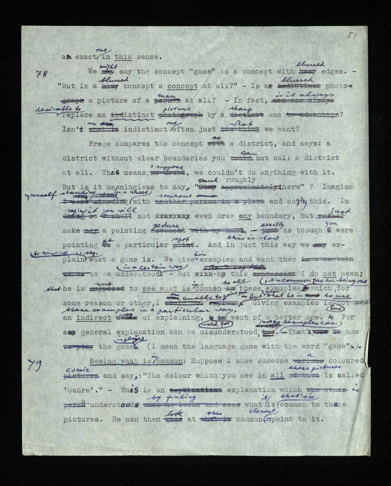 111 “It isn’t a game if there is a vagueness in the rules.” – But isn’t it a game? – “Well, perhaps you’ll call it a game, but anyway it isn’t a perfect game.” That’s to say, it has then impurities, and I am interested in the pure article. But what I want to say is: you’re misunderstanding the role which the ideal plays in your mode of expression. That is, you too would call it a game; only you’re dazzled by the ideal and therefore you don’t clearly see the real application of the word “game”. (It is as though you said, “The circumference of this wheel is really dπ” – it’s been made that exact.)