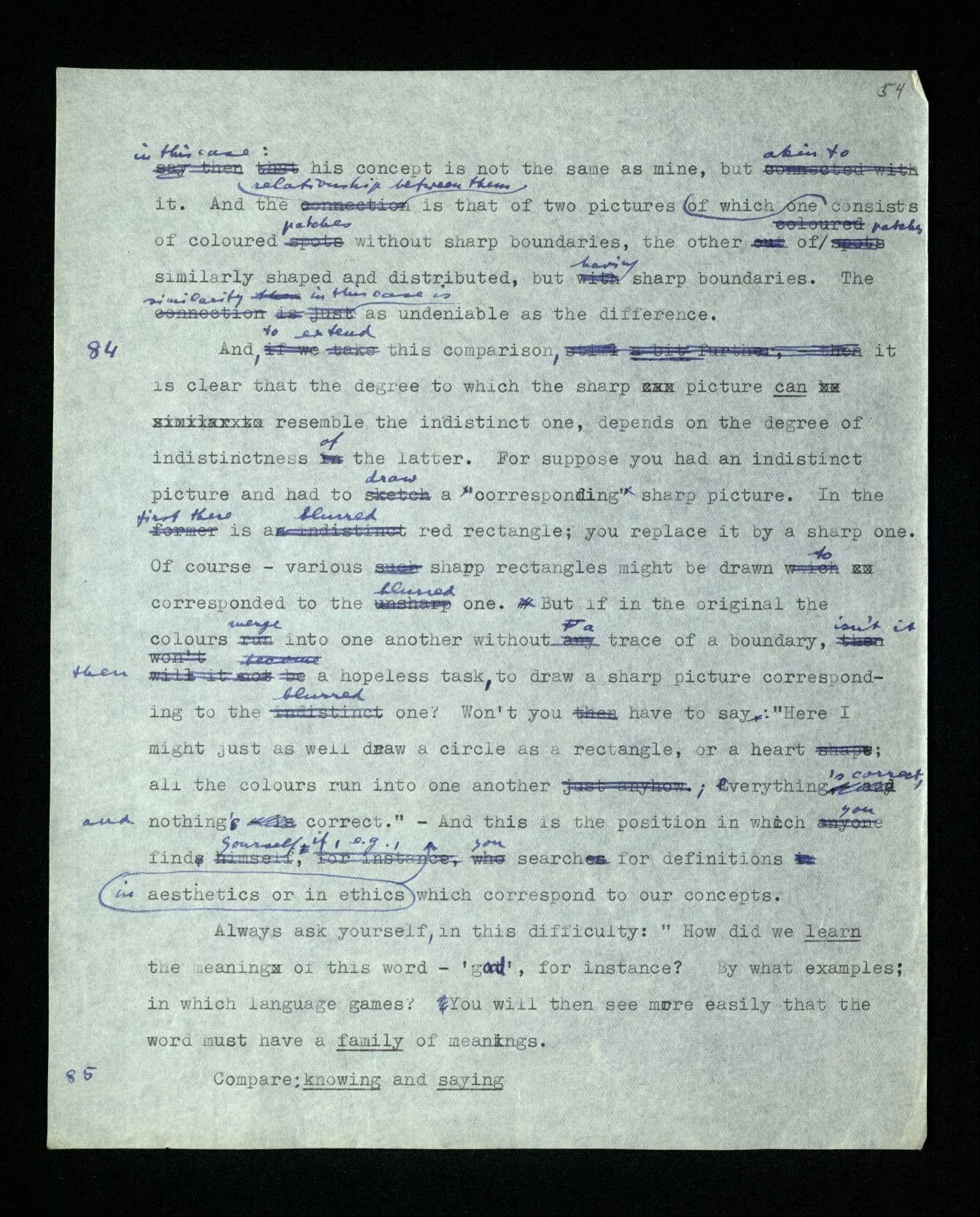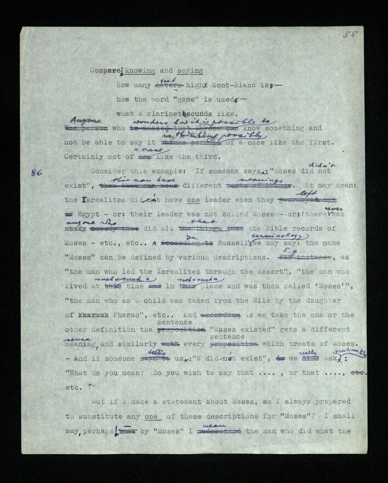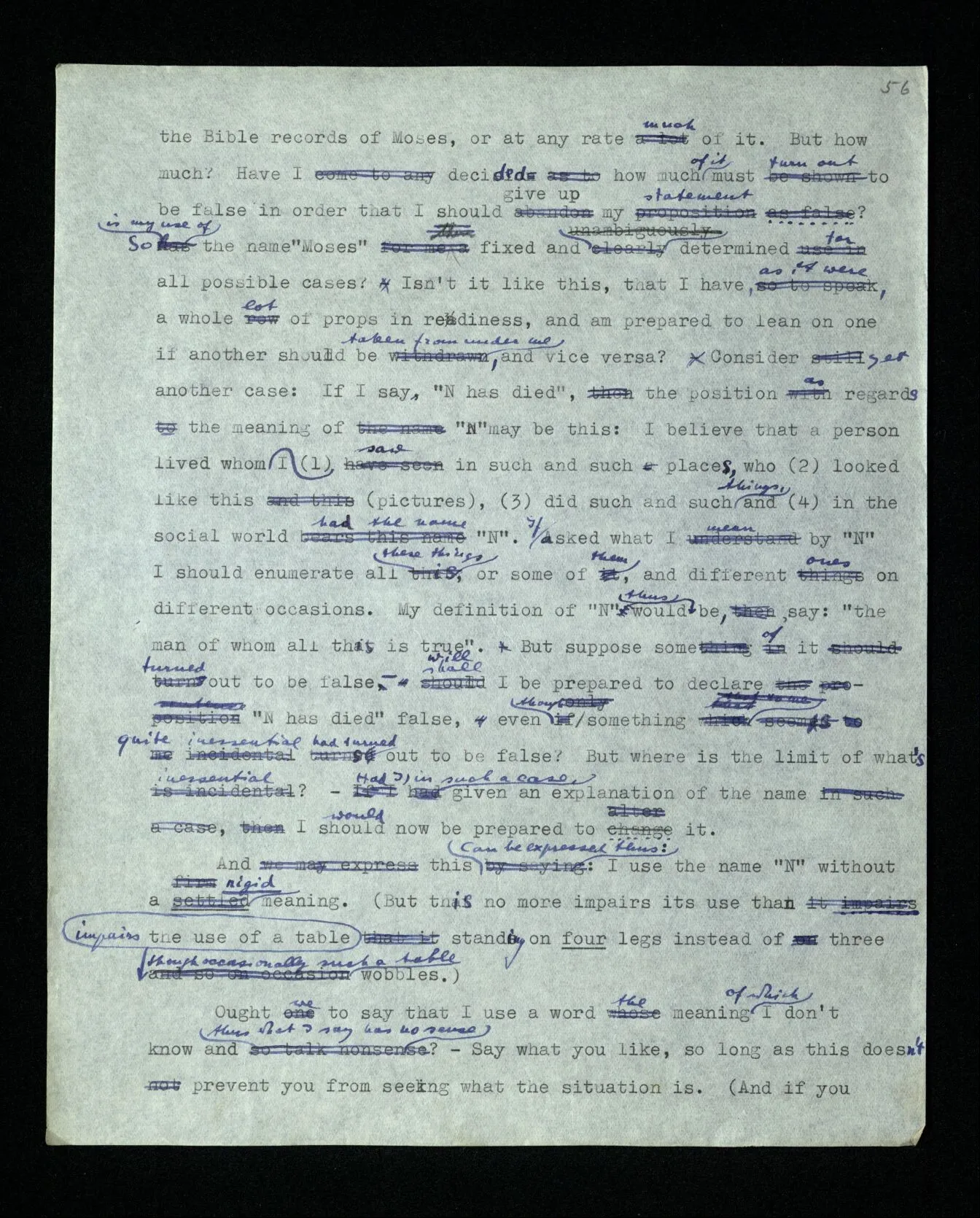 86 Consider this example: If someone says: “Moses did not exist”, this can have different meanings. It may mean: the Israelites didn’t have one leader when they left Egypt – or: their leader was not called Moses – or: there never was anyone who did all that the Bible records of Moses – etc., etc.. In Russell’s terminology we may say: the name “Moses” can be defined by various descriptions. E.g., as “the man who as a child was taken from the Nile by the daughter of Pharao”, etc.. And as we take the one or the other definition the sentence “Moses existed” gets a different meaning, and similarly every sentence which treats of Moses. – And if someone tells us: “N didn’t exist”, we really ask questions like: “What do you mean? Do you wish to say that …, or that …, etc.?” But if I make a statement about Moses, am I always prepared to substitute any one of these descriptions for “Moses”? I shall say, perhaps– by “Moses” I mean the man who did what the Bible records of Moses, or at any rate much of it. But how much? Have I decided how much of it must turn out to be false in order that I should give up my statement as false? So is my use of the name “Moses” fixed and determined for all possible cases? Isn’t it like this, that I have, as it were, a whole lot of props in readiness, and am prepared to lean on one if another should be taken from under me, and vice versa? Consider yet another case: If I say, “N has died”, the position as regards the meaning of “N” may be this: I believe that a person lived whom (1) I saw in such and such places, who (2) looked like this (pictures), (3) did such and such things, and (4) in the social world had the name “N”. If asked what I mean by “N” I should enumerate all these things, or some of them, and different ones on different occasions. My definition of “N” would thus be, say: “the man of whom all this is true”. But suppose some of it turned out to be false– shall I be prepared to declare “N has died” false, even though something that to me seems quite inessential had turned out to be false? But where is the limit of what’s inessential? – Had I, in such a case, given an explanation of the name, I should now be prepared to change it. And this can be expressed thus: I use the name “N” without a rigid meaning. (But this no more impairs its use than standing on four legs instead of three impairs the use of a table though occasionally such a table wobbles.) Ought we to say that I use a word the meaning of which I don’t know and thus what I say has no sense? – Say what you like, so long as this does not prevent you from seeing what the situation is. (And if you see this, there are some things you won’t say.)