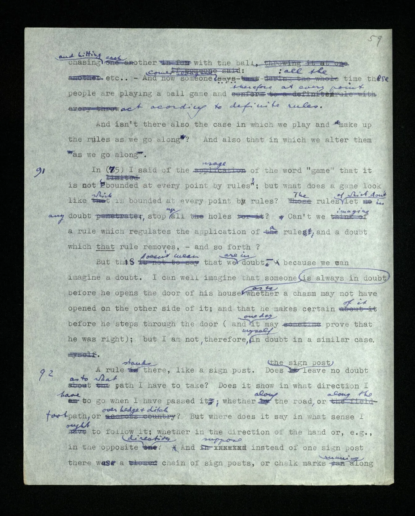 91 In (75) I said of the usage of the word “game” that it is not ‘bounded at every point by rules’; but what does a game look like which is bounded at every point by rules? The rules of which don’t let in any doubt, stop up all the holes? Can’t we imagine a rule which regulates the application of a rule; and a doubt which that rule removes, – and so forth? But this doesn’t mean that we are in doubt– because we can imagine a doubt. I can well imagine that someone before he opens the door of his house is always in doubt as to whether a chasm may not have opened on the other side of it; and that he makes certain of it before he steps through the door (and one day it may prove that he was right); but I am not, therefore, myself in doubt in a similar case.