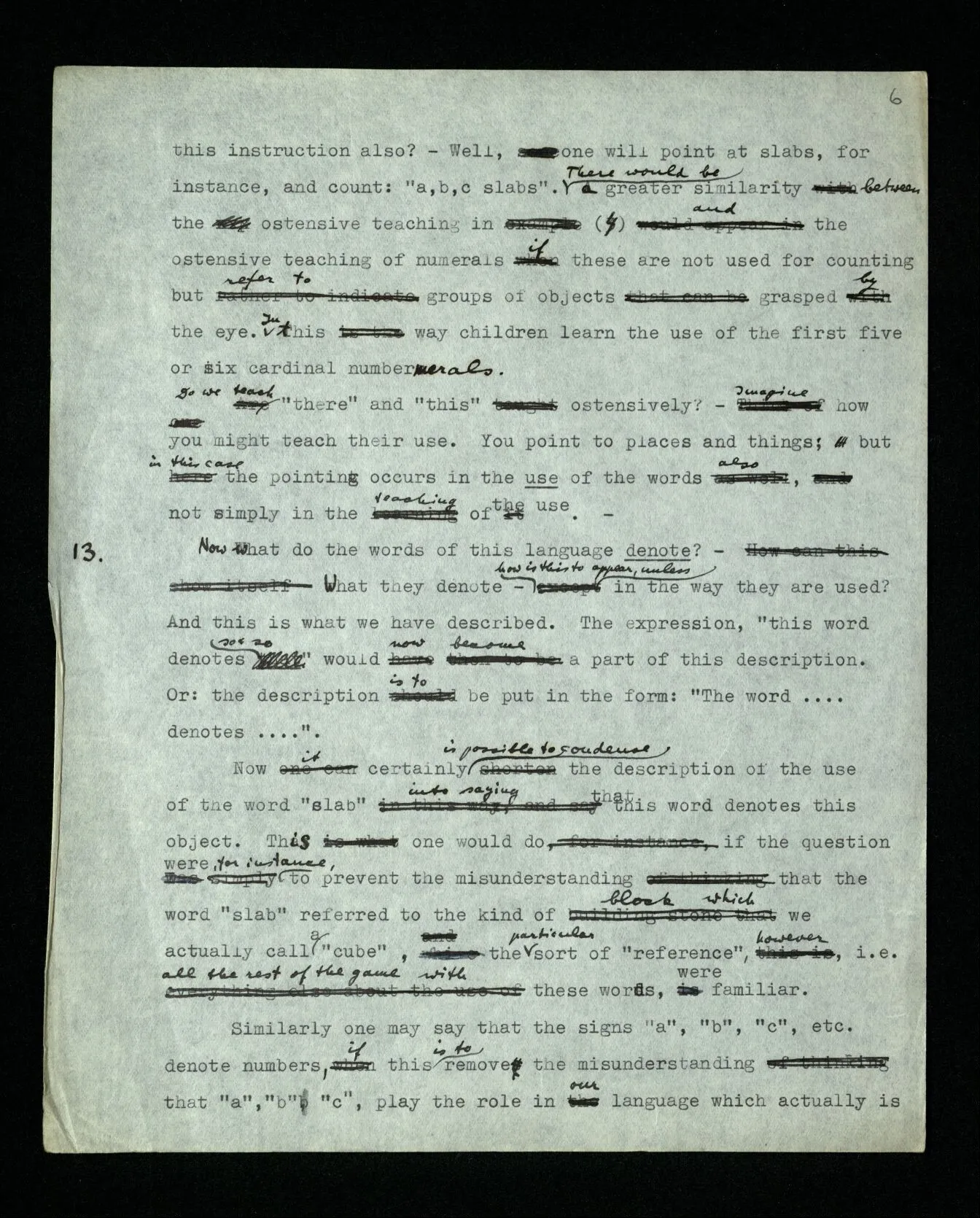 13 Now what do the words of this language denote? – What they denote – how is this to appear, unless in the way they are used? And this is what we have described. The expression, “this word denotes so & so” would now become a part of this description. Or: the description is to be put in the form: “The word … denotes …”. Now it certainly is possible to condense the description of the use of the word “slab” into saying that this word denotes this object. This one would do if the question were, for instance, to prevent the misunderstanding that the word “slab” referred to the kind of block which we actually call a “cube”, the particular sort of “reference”, however, i.e. all the rest of the game with these words, were familiar. Similarly one might say that the signs “a”, “b”, “c”, etc. denote numbers, if this is to remove the misunderstanding that “a”, “b”, “c”, play the role in our language which actually is played by “cube”, “column”, “slab”. And one can say also that “c” denotes this number and not that, – when this is to explain, say, that the letters are to be used in the order “a”, “b”, “c”, “d” etc., and not “a”, “b”, “d”, “c”. But by assimilating in this way descriptions of the uses of words to one another, their uses don’t become more similar. For, as we have seen, their uses are of widely different sorts.