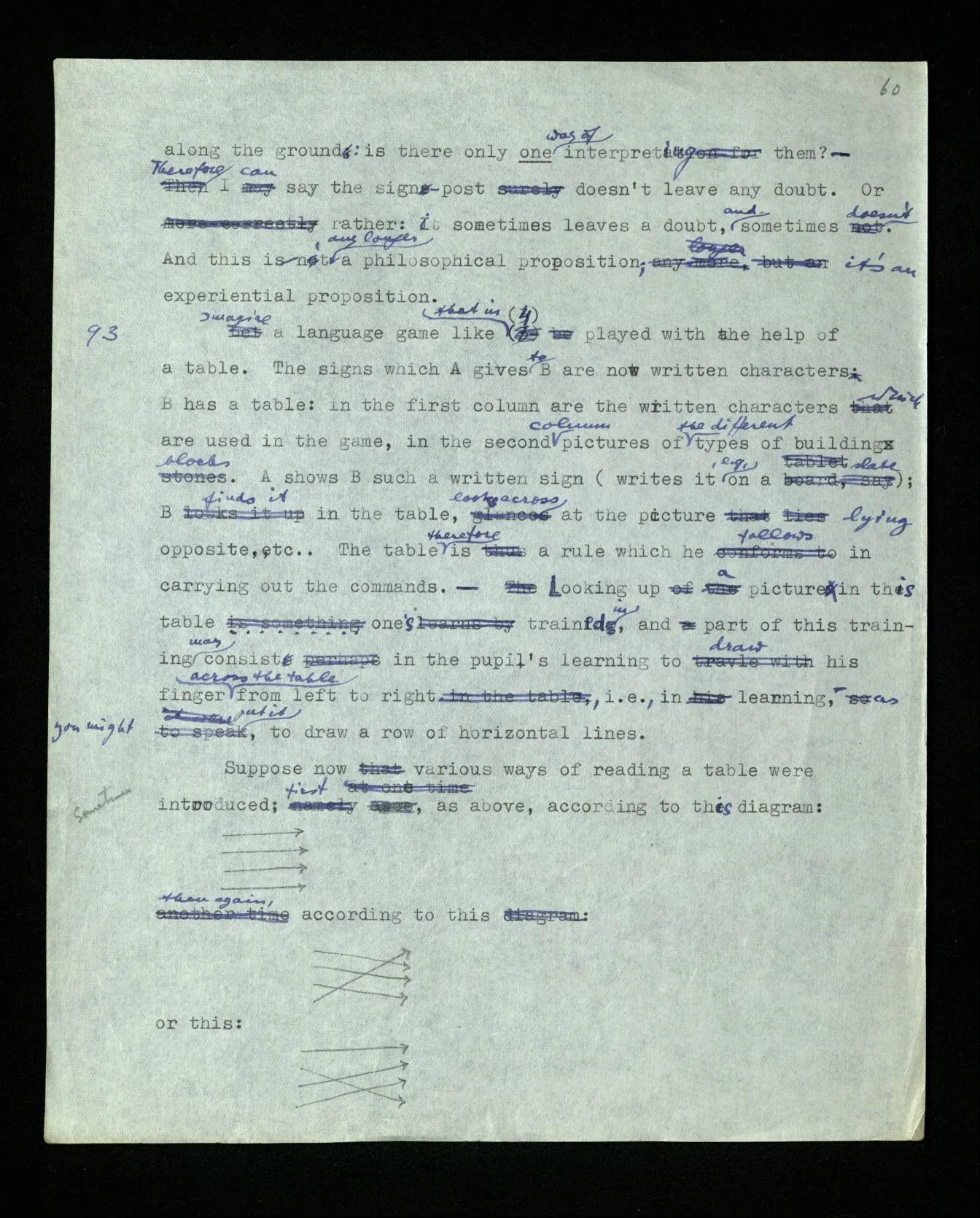 93 Imagine a language game like that in (4) played with the help of a table. The signs which A gives to B are now written characters. B has a table: in the first column are the written characters which are used in the game, in the second column pictures of the different types of building blocks. A shows B such a written sign (writes it, e.g., on a slate); B finds it in the table, looks across at the picture lying opposite, etc.. The table therefore is a rule which he follows in carrying out the commands. – Looking up a picture in this table is something one’s trained in, and part of this training may consist in the pupil’s learning to draw his finger across the table from left to right, i.e., in learning, as you might put it, to draw a row of horizontal lines. Suppose now various ways of reading a table were introduced; first, as above, according to this diagram: