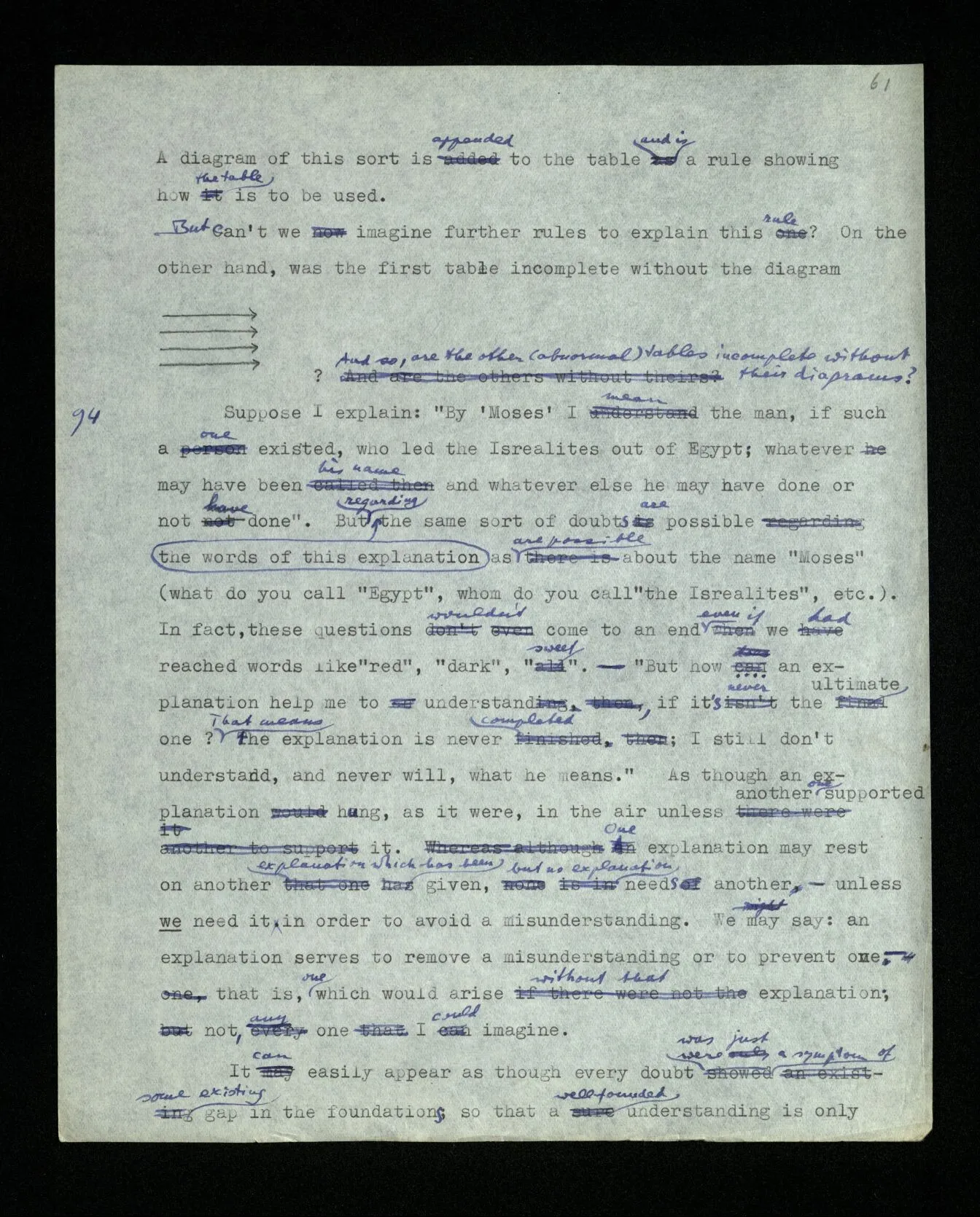 94 Suppose I explain: “By ‘Moses’ I mean the man, if such a one existed, who led the Israelites out of Egypt; whatever may have been his name and whatever else he may have done or not have done”. But regarding the words of this explanation the same sort of doubts are possible as are possible about the name “Moses” (what do you call “Egypt”, whom do you call “the Israelites”, etc.). In fact, these questions wouldn’t come to an end even if we had reached words like “red”, “dark”, “sweet”. – “But how can an explanation help me to understand, if it’s never the ultimate one? That means the explanation is never completed; I still don’t understand, and never will, what he means.” As though an explanation hung, as it were, in the air unless another one supported it. One explanation may rest on another explanation which has been given, but no explanation needs another – unless we need it in order to avoid a misunderstanding. We may say: an explanation serves to remove a misunderstanding or to prevent one– that is, one which would arise without that explanation; not, any one I could imagine.It can easily appear as though every doubt were just a symptom of some existing gap in the foundations, so that a well-founded understanding is only possible if we first doubt everything that can be doubted, and then remove all these doubts.