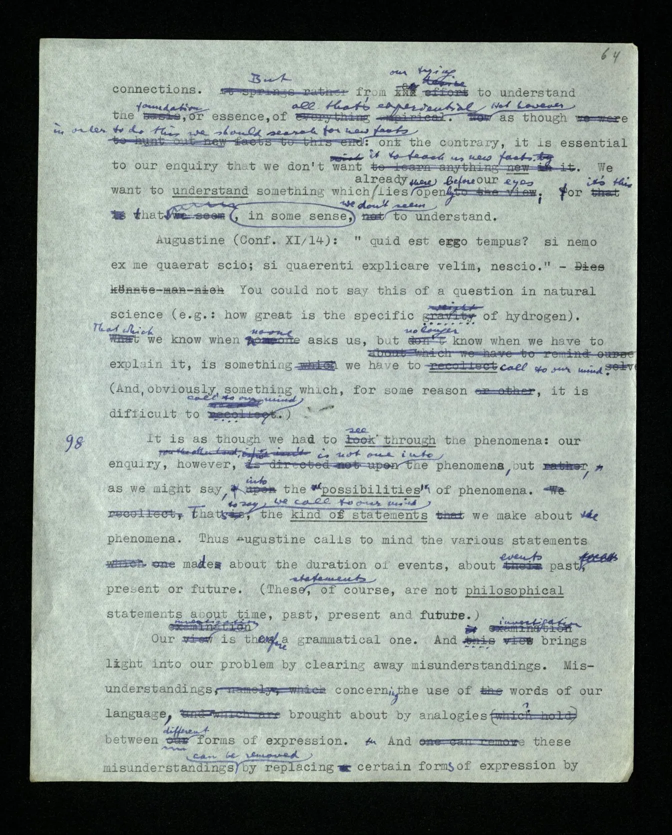 97 With these considerations we find ourselves facing the problem: is logic, in some way, sublime? For it seemed as though a special depth – a universal significance – belonged to logic. As though logic lay at the foundation of all sciences. – For the logical investigation investigates the essence of all things. It wants to get at the root of things, and ought not to trouble about whether things actually happen this way or that way. – The logical investigation does not arise from an interest in the facts of nature nor from the urge to understand causal connections. But from our trying to understand the foundation, or essence, of all that’s experiential. Not however as though in order to do this we should search for new facts: on the contrary, it is essential to our enquiry that we don’t want it to teach us new facts. We want to understand something which already lies there openly before our eyes; for it’s this that, in some sense, we don’t seem to understand. Augustine (Confessiones XI/14): “quid est ergo tempus? si nemo ex me quaerat scio; si quaerenti explicare velim, nescio.” – You could not say this of a question in natural science (e.g.: how great is the specific gravity of hydrogen). That which we know when no one asks us, but no longer know when we have to explain it, is something we have to call to our mind. (And, obviously, something which, for some reason, it is difficult to call to our mind.)