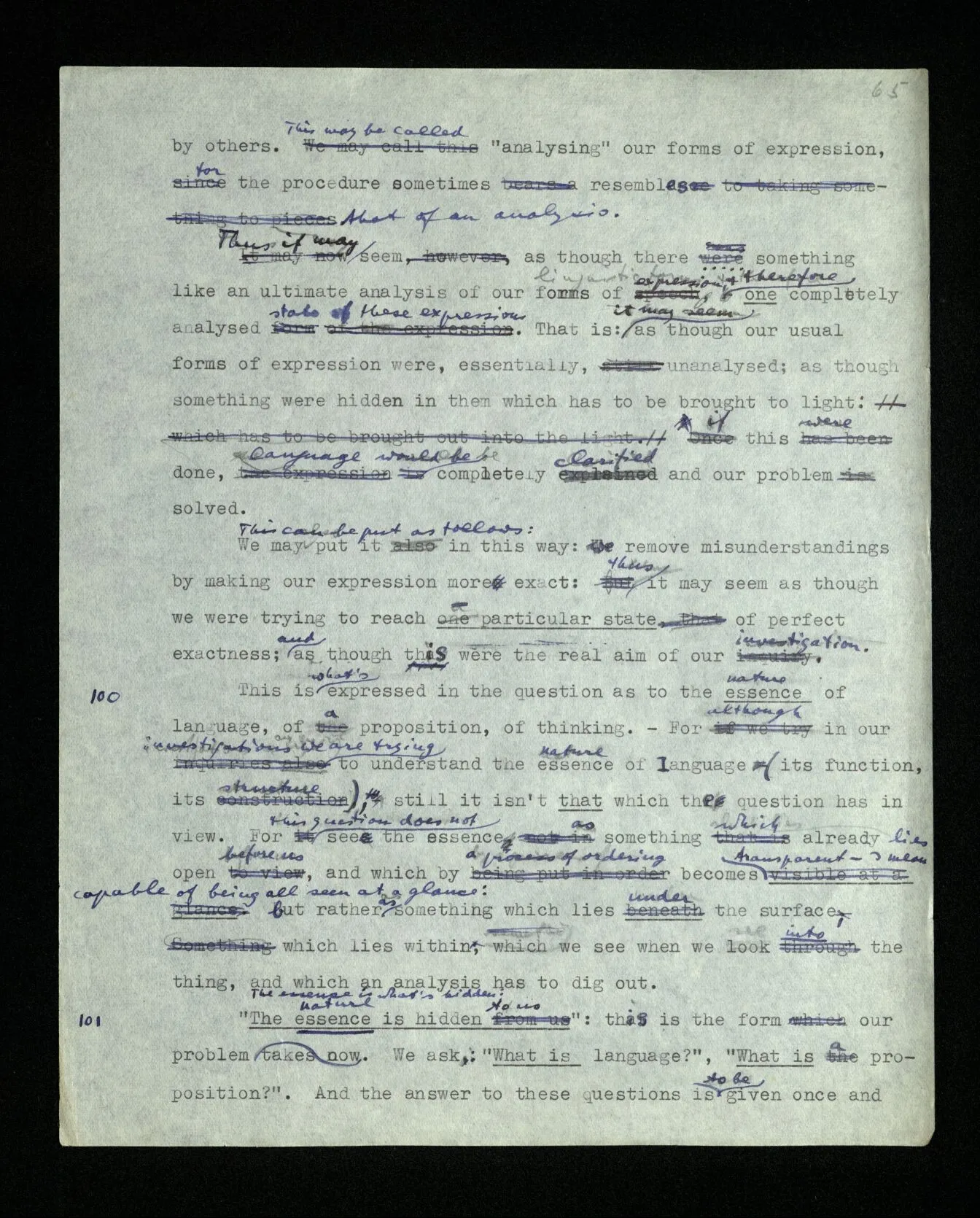 100 This is what’s expressed in the question as to the essence of language, of a proposition, of thinking. – For although in our investigations we are trying to understand the essence of language (its function, its construction), still it isn’t that which the question has in view. For this question does not see the essence as something which already lies open before us, and which by a process of ordering becomes transparent – I mean capable of being all seen at a glance: but rather as something which lies under the surface, which lies within, which we see when we see into the thing, and which an analysis has to dig out.