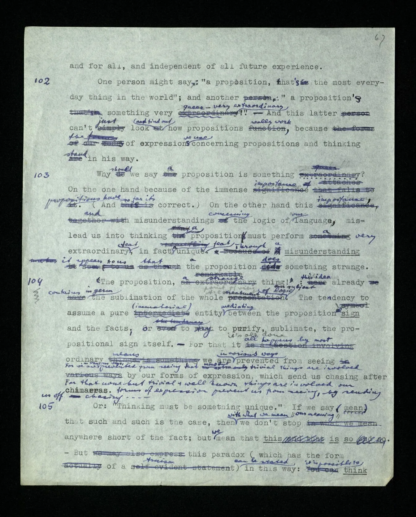 102 One person might say: “a proposition, that’s the most everyday thing in the world”; and another: “a proposition’s something very queer – very extraordinary!” – And this latter can’t just look and find out how propositions really work, because the expressions we use concerning propositions and thinking stand in his way.