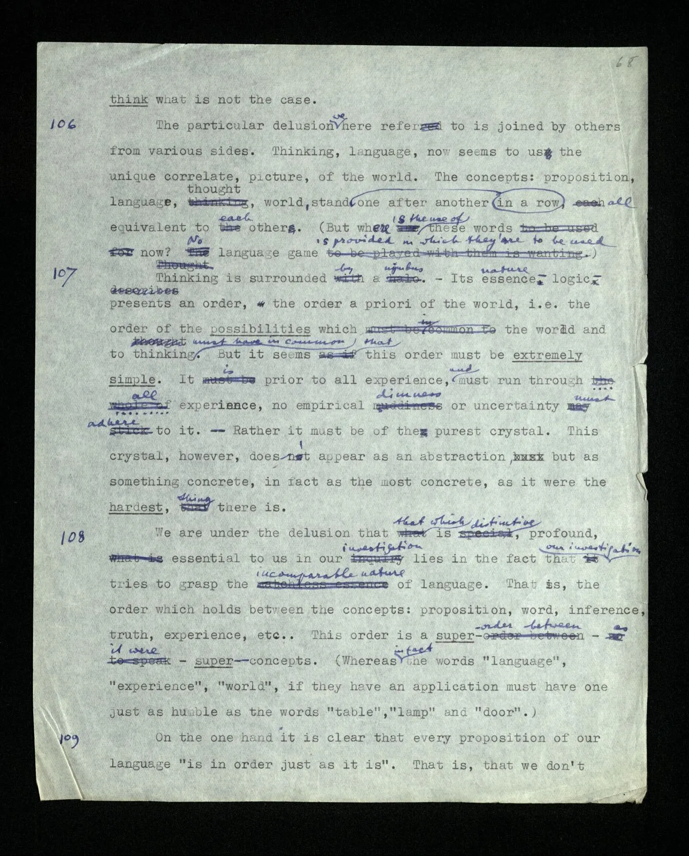 107 Thinking is surrounded by a nimbus. – Its essence– logic– presents an order, the order a priori of the world, i.e. the order of the possibilities which the world and thinking must have in common. But it seems that this order must be extremely simple. It is prior to all experience, and must run through the whole of experience, no empirical dimness or uncertainty must adhere to it. – Rather it must be of the purest crystal. This crystal, however, doesn’t appear as an abstraction, but as something concrete, in fact as the most concrete, as it were the hardest, thing there is.