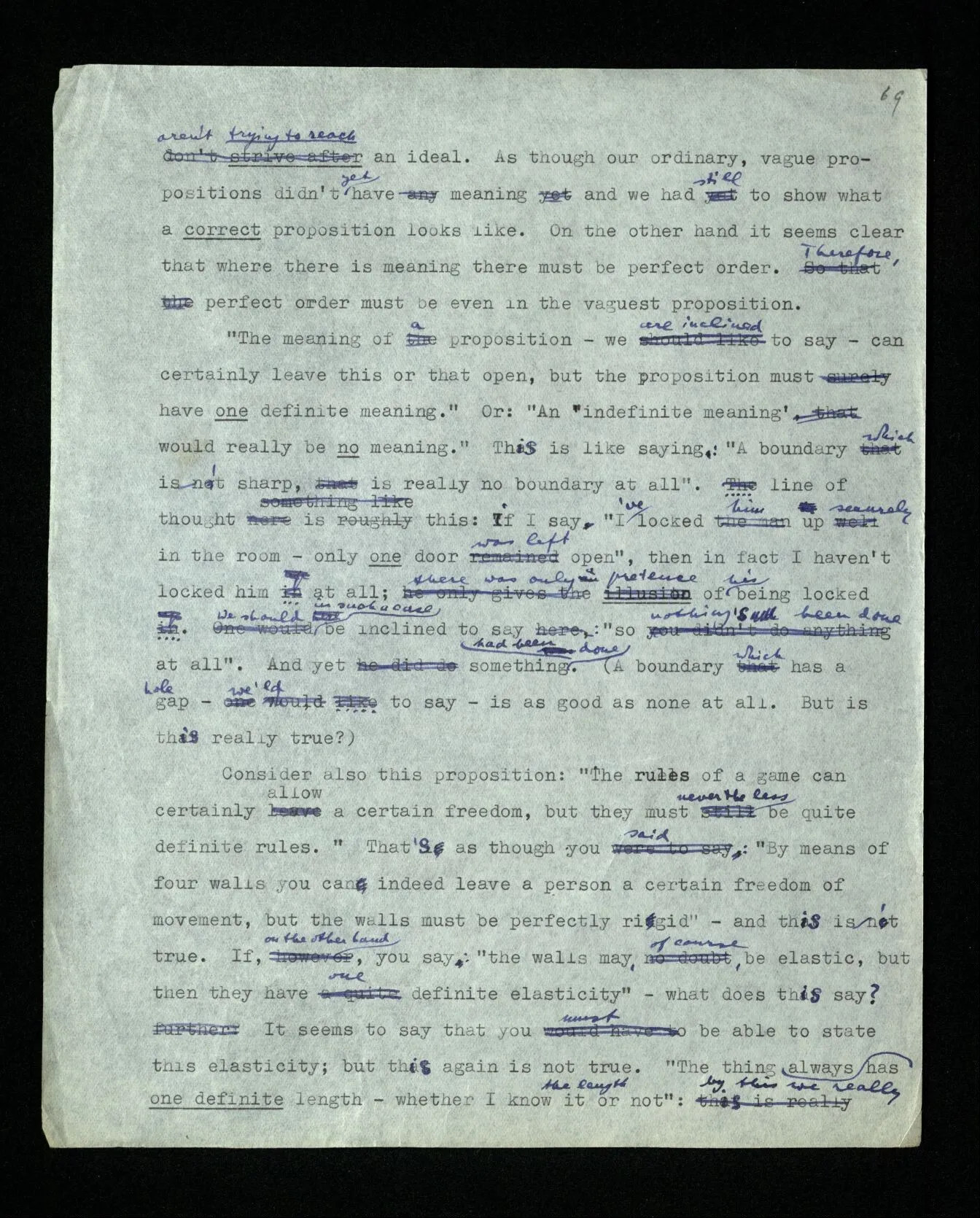 109 On the one hand it is clear that every proposition of our language “is in order just as it is”. That is, that we aren’t trying to reach an ideal. As though our ordinary, vague propositions didn’t yet have meaning and we had still to show what a correct proposition looks like. On the other hand it seems clear that where there is meaning there must be perfect order. Therefore perfect order must be even in the vaguest proposition. “The meaning of a proposition – we are inclined to say – can certainly leave this or that open, but the proposition must have one definite meaning.” Or: “An ‘indefinite meaning’ would really be no meaning.” This is like saying: “A boundary which isn’t sharp, is really no boundary at all”. The line of thought is this: if I say “I’ve locked him up securely in the room – only one door was left open”, then in fact I haven’t locked him in at all; there was only a pretence of his being locked in. We should in such a case be inclined to say: “so nothing’s been done at all”. And yet something had been done. (A boundary which has a hole – we’d like to say – is as good as none at all. But is this really true?) Consider also this proposition: “The rules of a game can certainly allow a certain freedom, but they must nevertheless be quite definite rules.” That’s as though you said: “By means of four walls you can indeed leave a person a certain freedom of movement, but the walls must be perfectly rigid” – and this isn’t true. If, on the other hand, you say: “the walls may, of course, be elastic, but then they have one definite elasticity” – what does this say? It seems to say that you must be able to state this elasticity; but this again is not true. “The thing has always one definite length – whether I know it or not”: by this we really declare that we attach ourselves to a particular expression. The form of expression which uses the form of an ‘ideal of exactness’– so to speak as a parameter of the description.