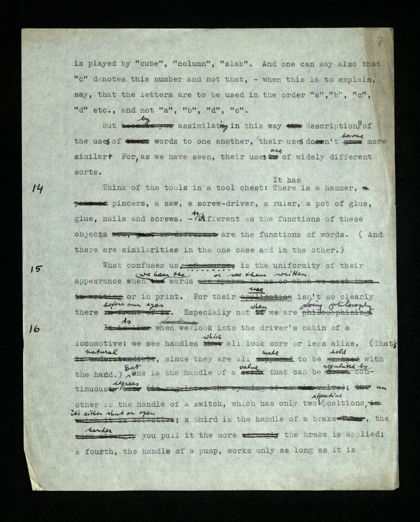 14 Think of the tools in a tool chest: There is a hammer, pincers, a saw, a screw-driver, a ruler, a pot of glue, glue, nails and screws. – As different as the functions of these objects are the functions of words. (And there are similarities in the one case and in the other.)