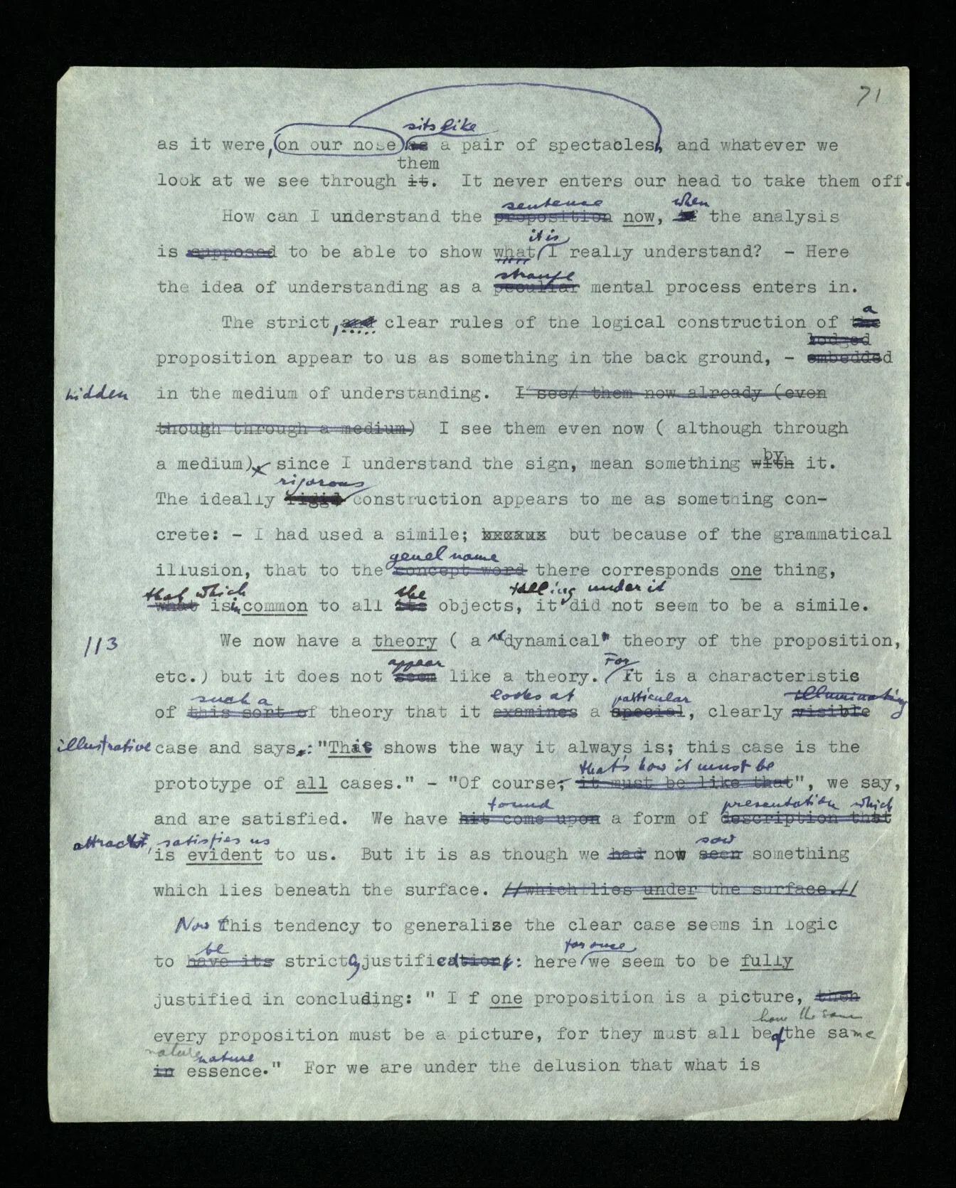 112 There can’t be a vagueness in logic – we wish to say. We now live in the idea: the ideal “must” found in the real world. – While we don’t yet see how it is there, and don’t understand the nature of this “must”. We believe: it must lie in the real world, for we think we already see it there. The ideal, in our thoughts, sits immovable. You can’t step outside it. You’ve always got to go back. There is no outside; outside you can’t breathe. – Whence all this? The idea,as it were, sits like a pair of spectacles on our nose, and whatever we look at we see through them. It never enters our head to take them off. How can I understand the sentence now, when the analysis is to be able to show what it is I really understand? – Here the idea of understanding as a strange mental process enters in. The strict, and clear rules of the logical construction of a proposition appear to us as something in the background, – hidden in the medium of understanding. I see them even now (although through a medium) since I understand the sign, mean something by it. The ideally rigorous construction appears to me as something concrete: – I had used a simile; but because of the grammatical illusion, that to the general name there corresponds one thing, that which is in common to all the objects falling under it, it did not seem to be a simile.
