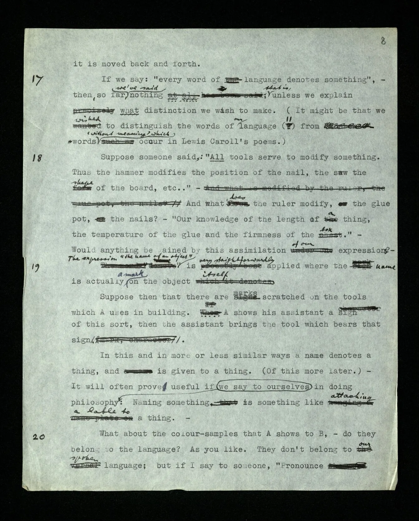 18 Suppose someone said: “All tools serve to modify something. Thus the hammer modifies the position of the nail, the saw the shape of the board, etc..” – And what does the ruler modify, the glue pot, the nails? – “Our knowledge of the length of a thing, the temperature of the glue and the firmness of the box.” – Would anything be gained by this assimilation of our expressions? –