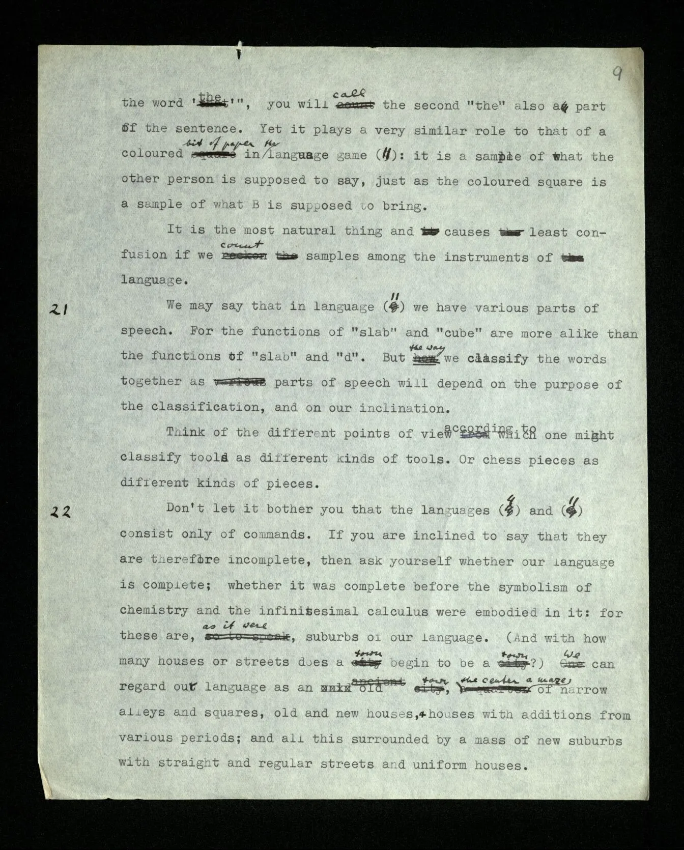 21 We may say that in language (11) we have various parts of speech. For the functions of “slab” and “cube” are more alike than the functions of “slab” and “d”. But the way we classify the words together as parts of speech will depend on the purpose of the classification, and on our inclination. Think of the different points of view according to which one might classify tools as different kinds of tools. Or chess pieces as different kinds of pieces.