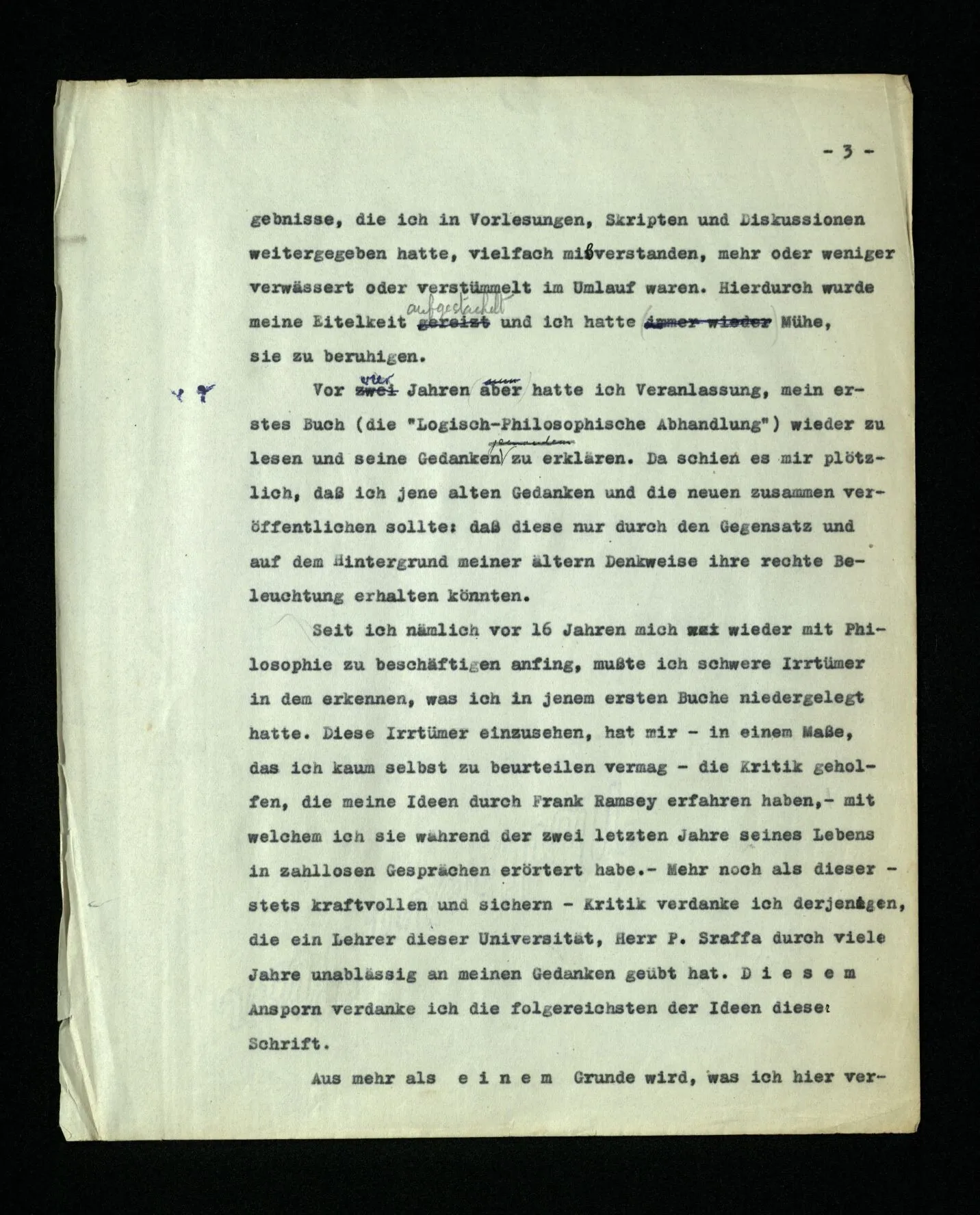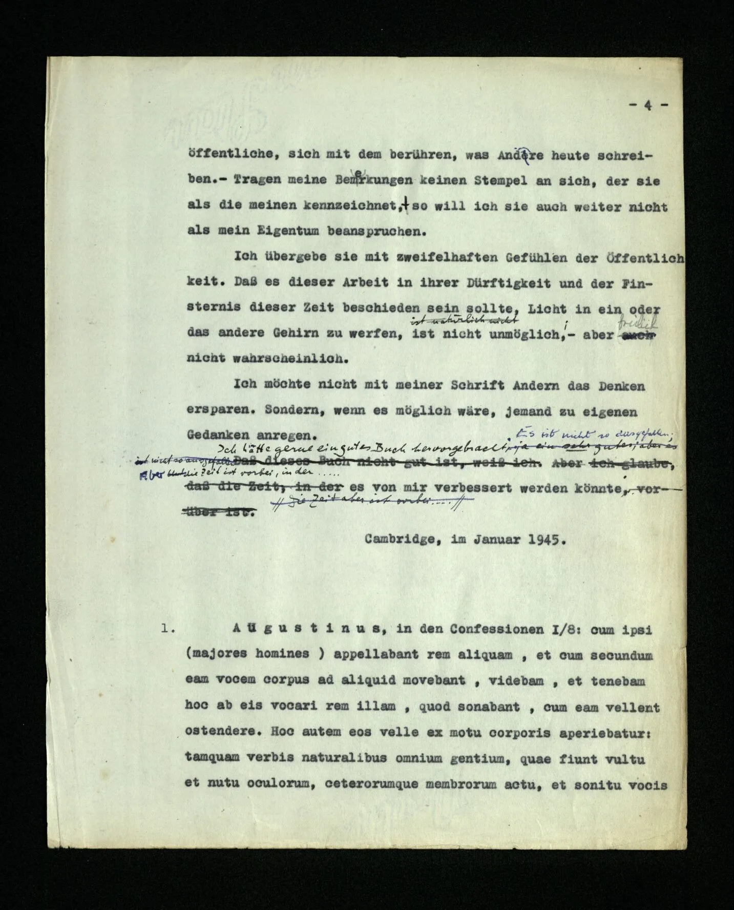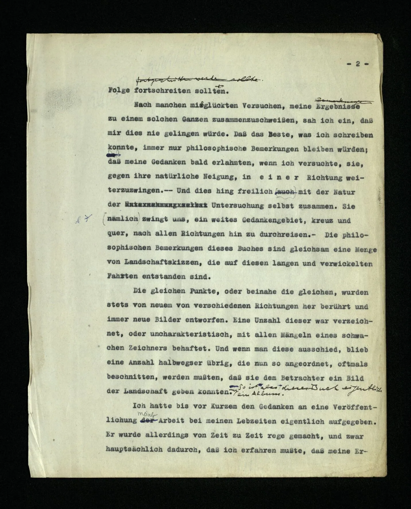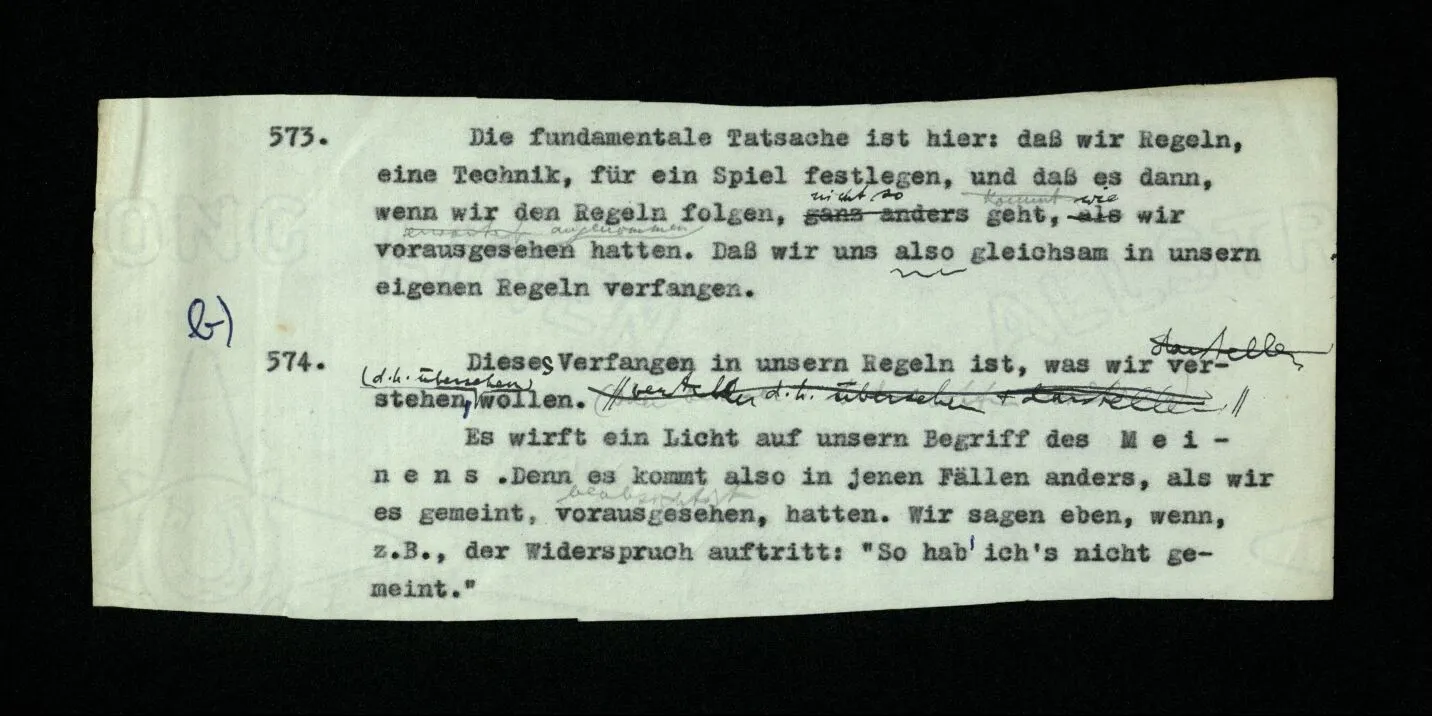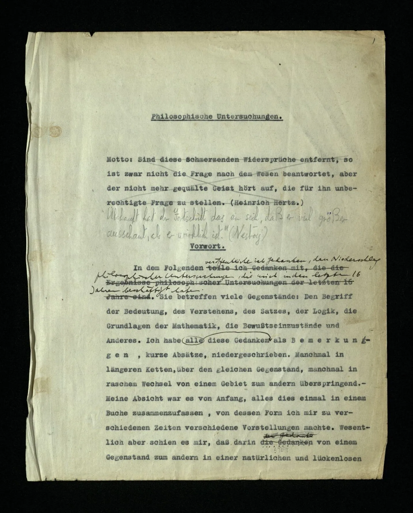 In dem Folgenden veröffentliche ich Gedanken, den Niederschlag philosophischer Untersuchungen, die mich in den letzten 16 Jahren beschäftigt haben. Sie betreffen viele Gegenstände: Den Begriff der Bedeutung, des Verstehens, des Satzes, der Logik, die Grundlagen der Mathematik, die Bewußtseinszustände und Anderes. Ich habe diese Gedanken alle als Bemerkungen, kurze Absätze, niedergeschrieben. Manchmal in längeren Ketten, über den gleichen Gegenstand, manchmal in raschem Wechsel von einem Gebiet zum andern überspringend. – Meine Absicht war es von Anfang, alles dies einmal in einem Buche zusammenzufassen, von dessen Form ich mir zu verschiedenen Zeiten verschiedene Vorstellungen machte. Wesentlich aber schien es mir, daß darin die Gedanken von einem Gegenstand zum andern in einer natürlichen und lückenlosen Folge fortschreiten sollten. Nach manchen mißglückten Versuchen, meine Ergebnisse zu einem solchen Ganzen zusammenzuschweißen, sah ich ein, daß mir dies nie gelingen würde. Daß das beste, was ich schreiben konnte, immer nur philosophische Bemerkungen bleiben würden; daß meine Gedanken bald erlahmten, wenn ich versuchte, sie, gegen ihre natürliche Neigung, in einer Richtung weiterzuzwingen. ‒ ‒ Und dies hing freilich mit der Natur der Untersuchung selbst zusammen. Sie (nämlich) zwingt uns, ein weites Gedankengebiet, kreuz und quer, nach allen Richtungen hin zu durchreisen. – Die philosophischen Bemerkungen dieses Buches sind gleichsam eine Menge von Landschaftskizzen, die auf diesen langen und verwickelten Fahrten entstanden sind. Die gleichen Punkte, oder beinahe die gleichen, wurden stets von neuem von verschiedenen Richtungen her berührt und immer neue Bilder entworfen. Eine Unzahl dieser war verzeichnet, oder uncharakteristisch, mit allen Mängeln eines schwachen Zeichners behaftet. Und wenn man diese ausschied, blieb eine Anzahl halbwegser übrig, die nun so angeordnet, oftmals beschnitten, werden mußten, daß sie dem Betrachter ein Bild der Landschaft geben konnten.– So ist also dieses Buch eigentlich nur ein Album. Ich hatte bis vor kurzem den Gedanken an eine Veröffentlichung meiner Arbeit bei meinen Lebzeiten eigentlich aufgegeben. Er wurde allerdings von Zeit zu Zeit rege gemacht, und zwar hauptsächlich dadurch, daß ich erfahren mußte, daß meine Ergebnisse, die ich in Vorlesungen, Skripten und Diskussionen weitergegeben hatte, vielfach mißverstanden, mehr oder weniger verwässert, oder verstümmelt im Umlauf waren. Hierdurch wurde meine Eitelkeit aufgestachelt und ich hatte Mühe, sie zu beruhigen. Vor vier Jahren aber hatte ich Veranlassung, mein erstes Buch (die “Logisch-philosophische Abhandlung”) wieder zu lesen und seine Gedanken zu erklären. Da schien es mir plötzlich, daß ich jene alten Gedanken und die neuen zusammen veröffentlichen sollte: daß diese nur durch den Gegensatz, und auf dem Hintergrund meiner ältern Denkweise, ihre rechte Beleuchtung erhalten könnten. Seit ich nämlich vor 16 Jahren mich wieder mit Philosophie zu beschäftigen anfing, mußte ich schwere Irrtümer in dem erkennen, was ich in jenem ersten Buche niedergelegt hatte. Diese Irrtümer einzusehen, hat mir – in einem Maße, das ich kaum selbst zu beurteilen vermag – die Kritik geholfen, die meine Ideen durch Frank Ramsey erfahren haben,– mit welchem ich sie, während der zwei letzten Jahre seines Lebens in zahllosen Gesprächen erörtert habe. – Mehr noch als dieser – stets kraftvollen und sichern – Kritik verdanke ich derjenigen, die ein Lehrer dieser Universität, Herr P. Sraffa, durch viele Jahre, unablässig an meinen Gedanken geübt hat. Diesem Ansporn verdanke ich die folgereichsten der Ideen dieser Schrift. Aus mehr als einem Grunde wird, was ich hier veröffentliche, sich mit dem berühren, was Andre heute schreiben. – Tragen meine Bemerkungen keinen Stempel an sich, der sie als die meinen kennzeichnet, so will ich sie auch weiter nicht als mein Eigentum beanspruchen. Ich übergebe sie mit zweifelhaften Gefühlen der Öffentlichkeit. Daß es dieser Arbeit in ihrer Dürftigkeit und der Finsternis dieser Zeit beschieden sein sollte, Licht in ein oder das andere Gehirn zu werfen, ist nicht unmöglich,– aber freilich nicht wahrscheinlich. Ich möchte nicht mit meiner Schrift Andern das Denken ersparen. Sondern, wenn es möglich wäre, jemand zu eigenen Gedanken anregen. Ich hätte gerne ein gutes Buch hervorgebracht. Es ist nicht so ausgefallen; Aber die Zeit ist vorbei, in der es von mir verbessert werden könnte. Cambridge, im Januar 1945.