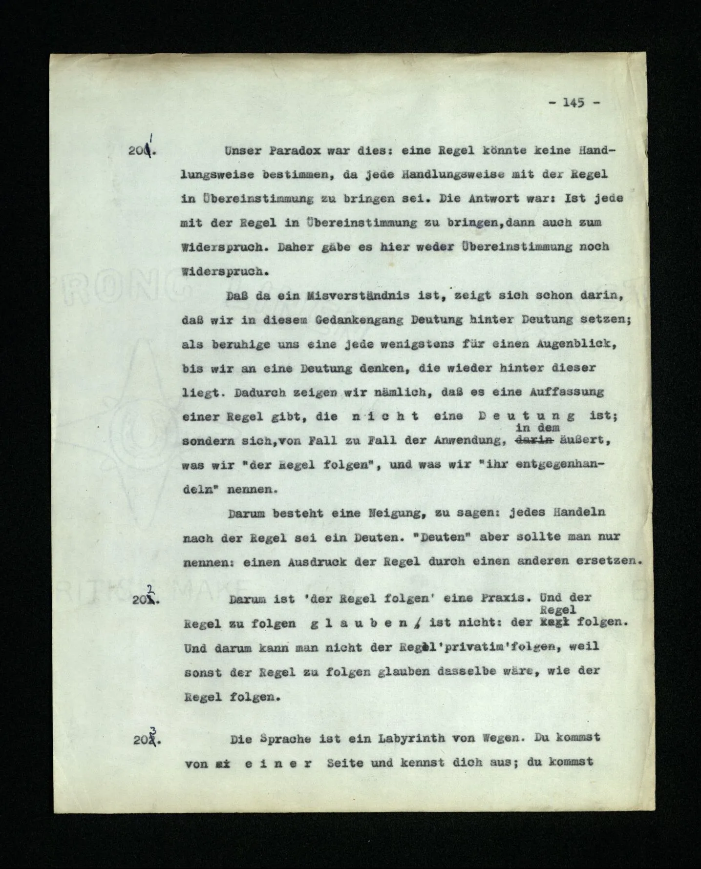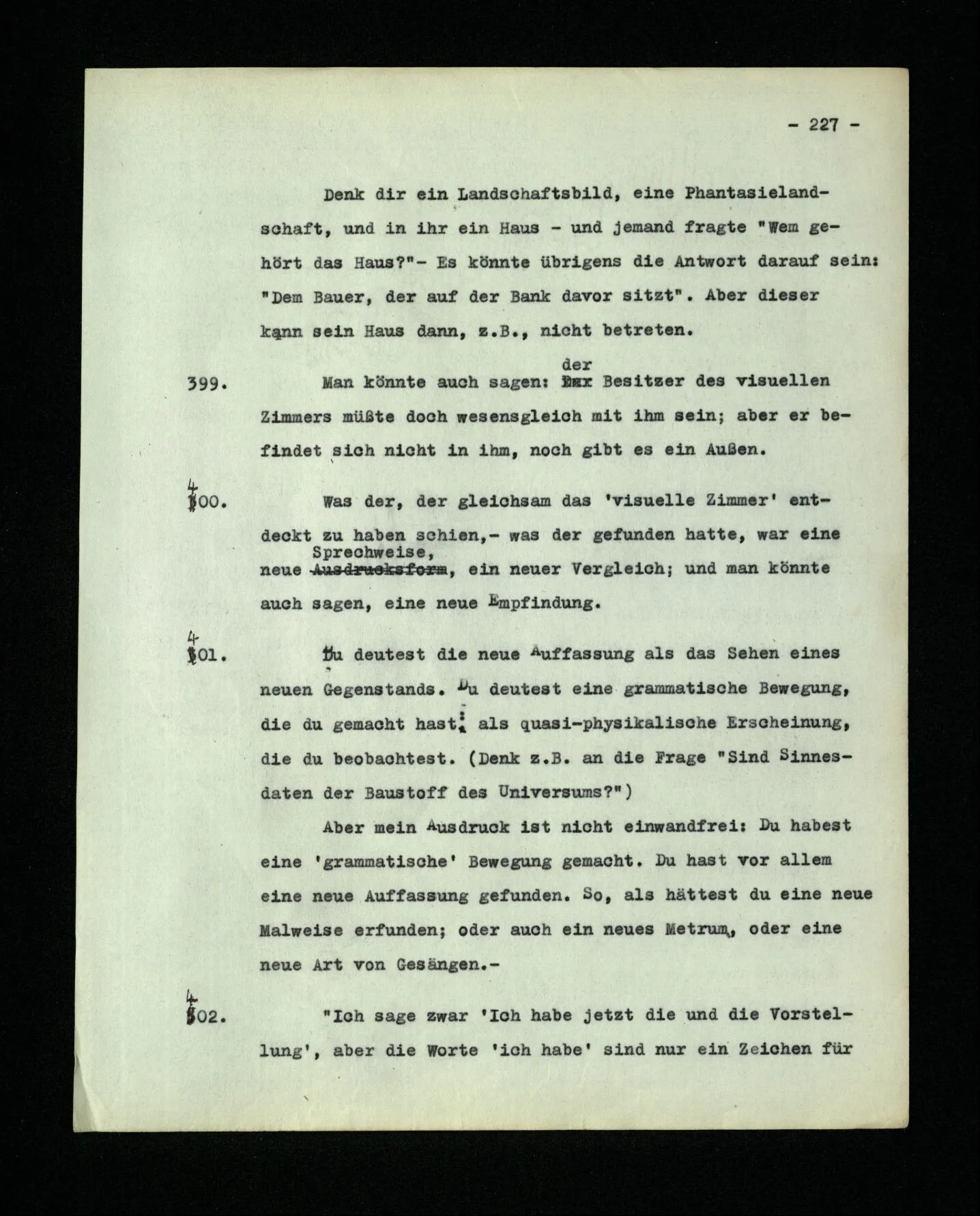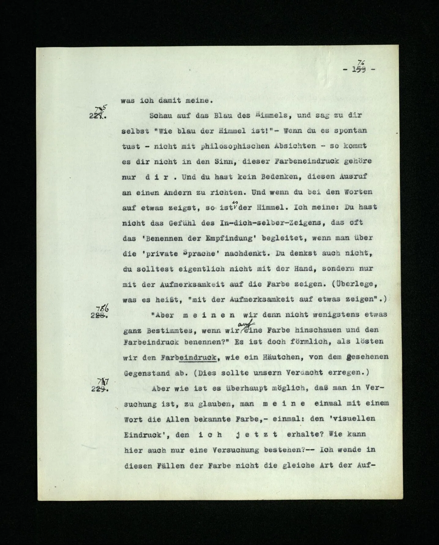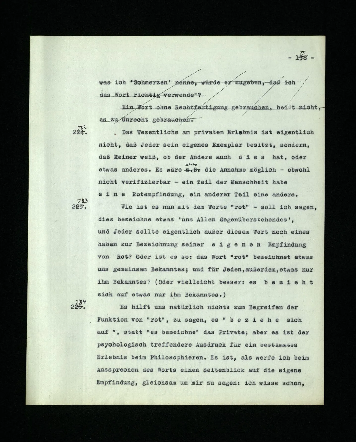 In dem Folgenden veröffentliche ich Gedanken, den Niederschlag philosophischer Untersuchungen, die mich in den letzten 16 Jahren beschäftigt haben. Sie betreffen viele Gegenstände: Den Begriff der Bedeutung, des Verstehens, des Satzes, der Logik, die Grundlagen der Mathematik, die Bewußtseinszustände und Anderes. Ich habe diese Gedanken alle als Bemerkungen, kurze Absätze, niedergeschrieben. Manchmal in längeren Ketten, über den gleichen Gegenstand, manchmal in raschem Wechsel von einem Gebiet zum andern überspringend. – Meine Absicht war es von Anfang, alles dies einmal in einem Buche zusammenzufassen, von dessen Form ich mir zu verschiedenen Zeiten verschiedene Vorstellungen machte. Wesentlich aber schien es mir, daß darin die Gedanken von einem Gegenstand zum andern in einer natürlichen und lückenlosen Folge fortschreiten sollten. Nach manchen mißglückten Versuchen, meine Ergebnisse zu einem solchen Ganzen zusammenzuschweißen, sah ich ein, daß mir dies nie gelingen würde. Daß das beste, was ich schreiben konnte, immer nur philosophische Bemerkungen bleiben würden; daß meine Gedanken bald erlahmten, wenn ich versuchte, sie, gegen ihre natürliche Neigung, in einer Richtung weiterzuzwingen. ‒ ‒ Und dies hing freilich mit der Natur der Untersuchung selbst zusammen. Sie (nämlich) zwingt uns, ein weites Gedankengebiet, kreuz und quer, nach allen Richtungen hin zu durchreisen. – Die philosophischen Bemerkungen dieses Buches sind gleichsam eine Menge von Landschaftskizzen, die auf diesen langen und verwickelten Fahrten entstanden sind. Die gleichen Punkte, oder beinahe die gleichen, wurden stets von neuem von verschiedenen Richtungen her berührt und immer neue Bilder entworfen. Eine Unzahl dieser war verzeichnet, oder uncharakteristisch, mit allen Mängeln eines schwachen Zeichners behaftet. Und wenn man diese ausschied, blieb eine Anzahl halbwegser übrig, die nun so angeordnet, oftmals beschnitten, werden mußten, daß sie dem Betrachter ein Bild der Landschaft geben konnten.– So ist also dieses Buch eigentlich nur ein Album. Ich hatte bis vor kurzem den Gedanken an eine Veröffentlichung meiner Arbeit bei meinen Lebzeiten eigentlich aufgegeben. Er wurde allerdings von Zeit zu Zeit rege gemacht, und zwar hauptsächlich dadurch, daß ich erfahren mußte, daß meine Ergebnisse, die ich in Vorlesungen, Skripten und Diskussionen weitergegeben hatte, vielfach mißverstanden, mehr oder weniger verwässert, oder verstümmelt im Umlauf waren. Hierdurch wurde meine Eitelkeit aufgestachelt und ich hatte Mühe, sie zu beruhigen. Vor vier Jahren aber hatte ich Veranlassung, mein erstes Buch (die “Logisch-philosophische Abhandlung”) wieder zu lesen und seine Gedanken zu erklären. Da schien es mir plötzlich, daß ich jene alten Gedanken und die neuen zusammen veröffentlichen sollte: daß diese nur durch den Gegensatz, und auf dem Hintergrund meiner ältern Denkweise, ihre rechte Beleuchtung erhalten könnten. Seit ich nämlich vor 16 Jahren mich wieder mit Philosophie zu beschäftigen anfing, mußte ich schwere Irrtümer in dem erkennen, was ich in jenem ersten Buche niedergelegt hatte. Diese Irrtümer einzusehen, hat mir – in einem Maße, das ich kaum selbst zu beurteilen vermag – die Kritik geholfen, die meine Ideen durch Frank Ramsey erfahren haben,– mit welchem ich sie, während der zwei letzten Jahre seines Lebens in zahllosen Gesprächen erörtert habe. – Mehr noch als dieser – stets kraftvollen und sichern – Kritik verdanke ich derjenigen, die ein Lehrer dieser Universität, Herr P. Sraffa, durch viele Jahre, unablässig an meinen Gedanken geübt hat. Diesem Ansporn verdanke ich die folgereichsten der Ideen dieser Schrift. Aus mehr als einem Grunde wird, was ich hier veröffentliche, sich mit dem berühren, was Andre heute schreiben. – Tragen meine Bemerkungen keinen Stempel an sich, der sie als die meinen kennzeichnet, so will ich sie auch weiter nicht als mein Eigentum beanspruchen. Ich übergebe sie mit zweifelhaften Gefühlen der Öffentlichkeit. Daß es dieser Arbeit in ihrer Dürftigkeit und der Finsternis dieser Zeit beschieden sein sollte, Licht in ein oder das andere Gehirn zu werfen, ist nicht unmöglich,– aber freilich nicht wahrscheinlich. Ich möchte nicht mit meiner Schrift Andern das Denken ersparen. Sondern, wenn es möglich wäre, jemand zu eigenen Gedanken anregen. Ich hätte gerne ein gutes Buch hervorgebracht. Es ist nicht so ausgefallen; Aber die Zeit ist vorbei, in der es von mir verbessert werden könnte. Cambridge, im Januar 1945.