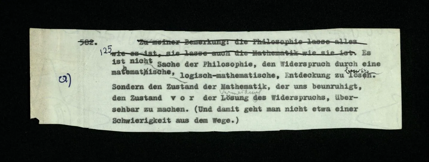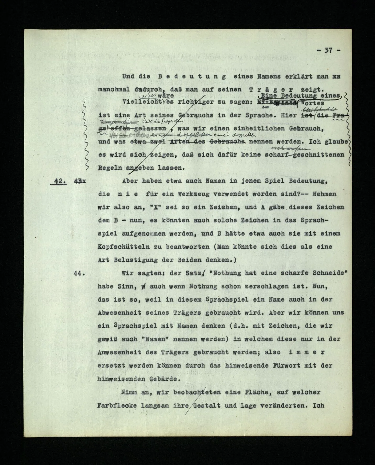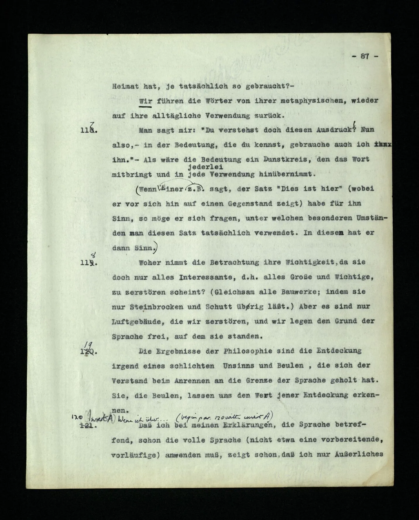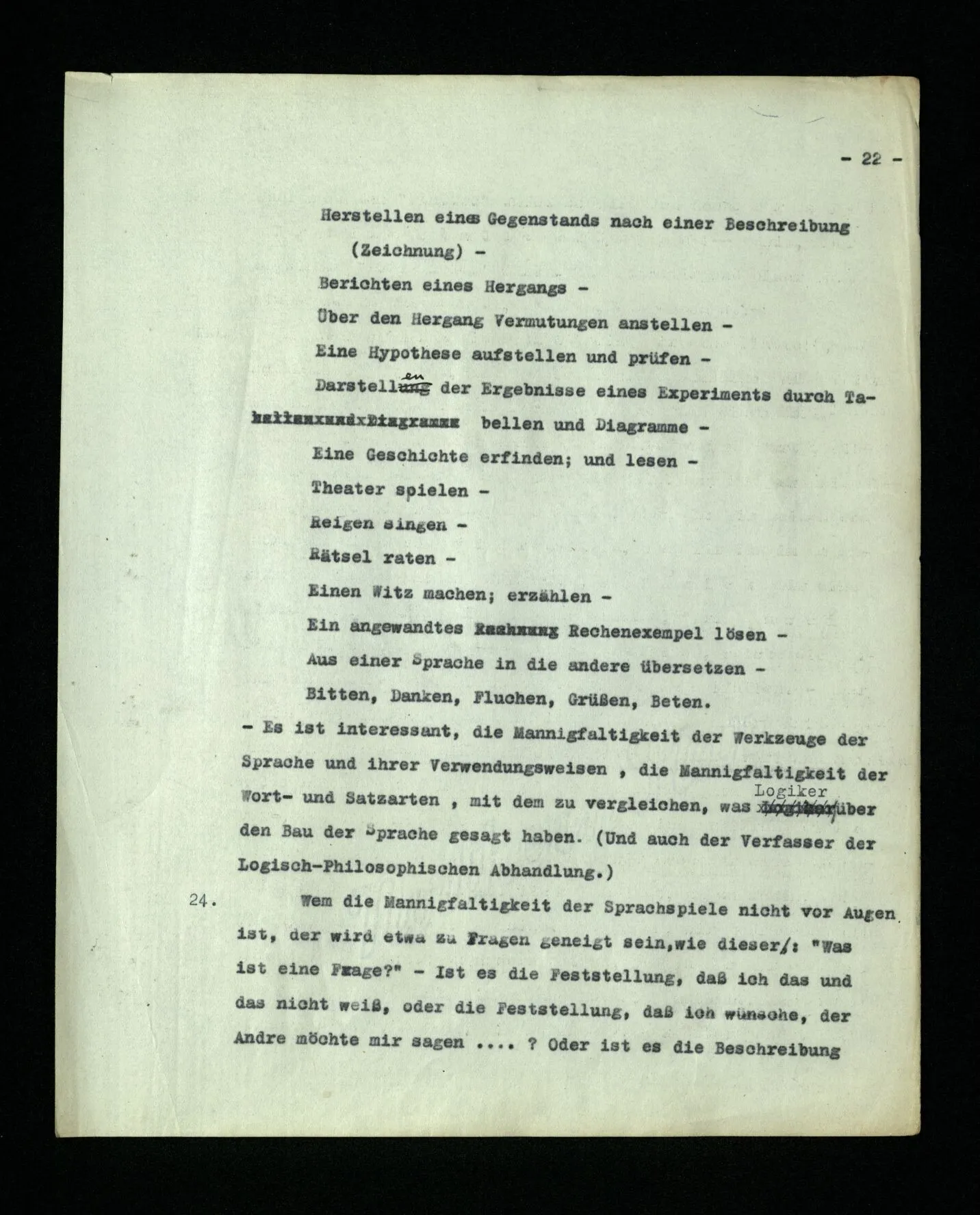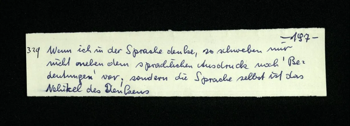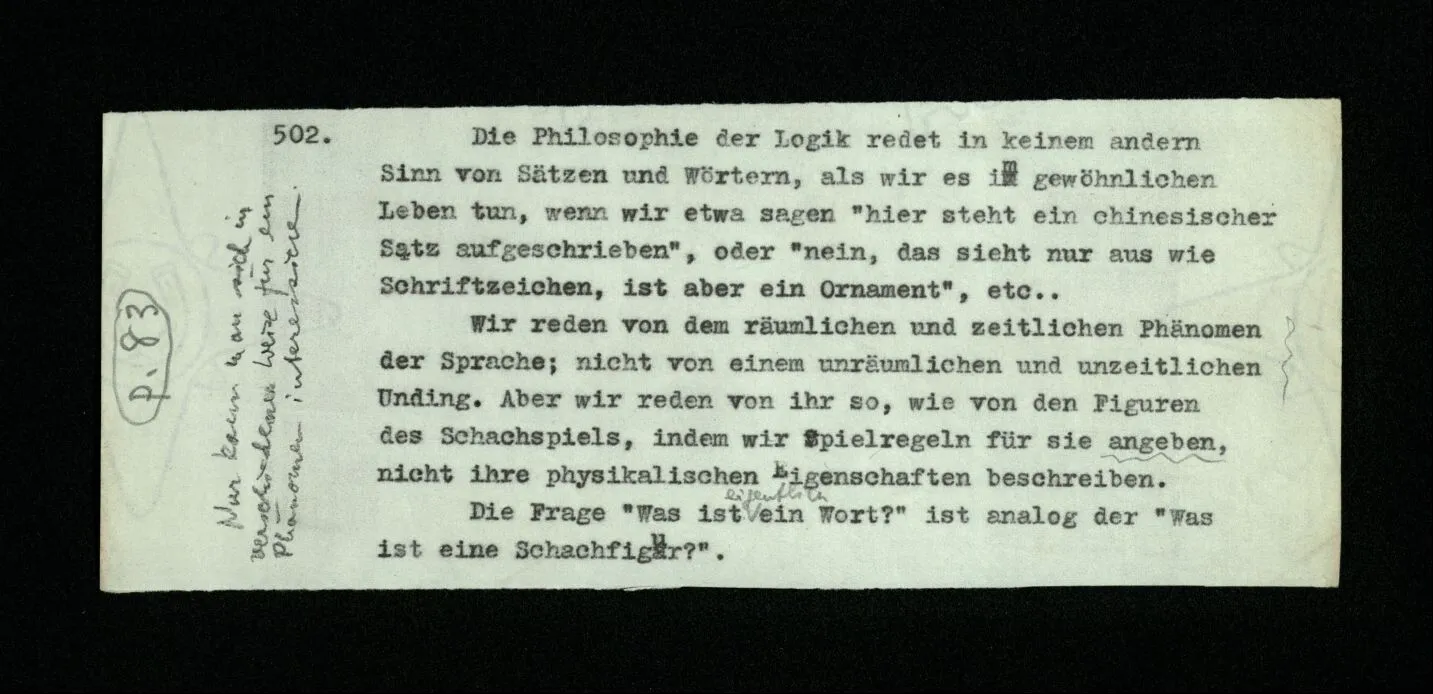 – Es ist interessant, die Mannigfaltigkeit der Werkzeuge der Sprache und ihrer Verwendungsweisen, die Mannigfaltigkeit der Wort- und Satzarten, mit dem zu vergleichen, was Logiker über den Bau der Sprache gesagt haben. (Und auch der Verfasser der Logisch-philosophischen Abhandlung.)