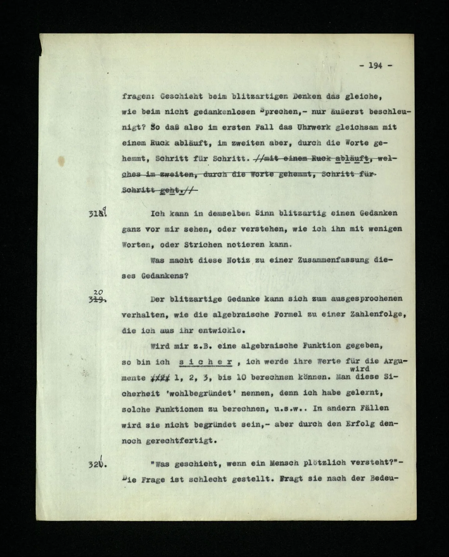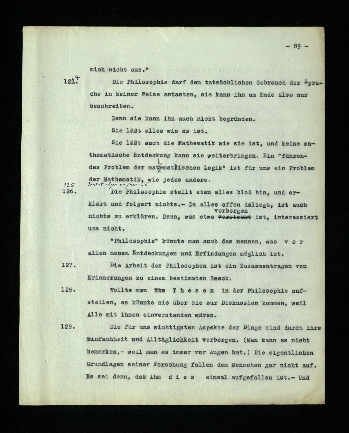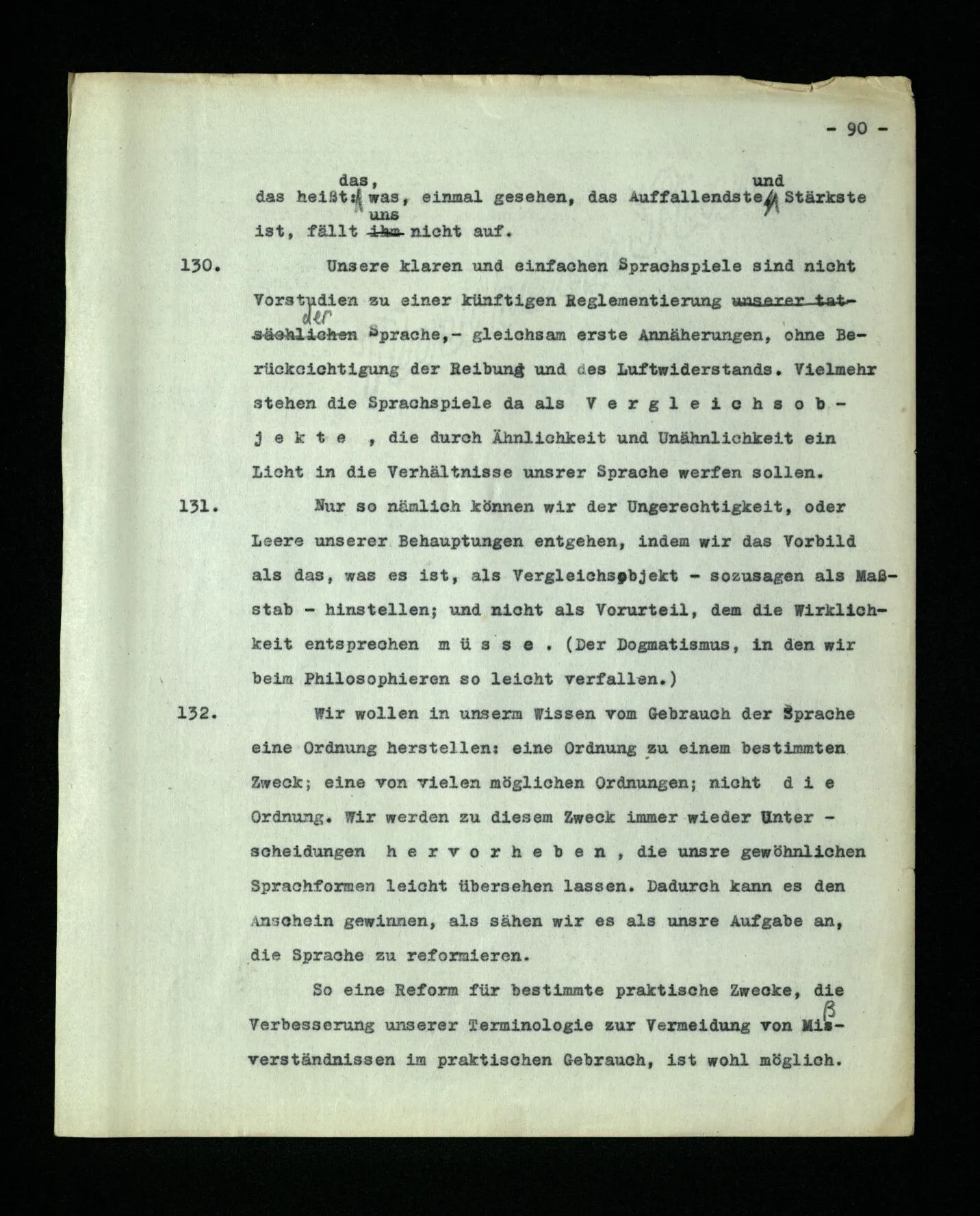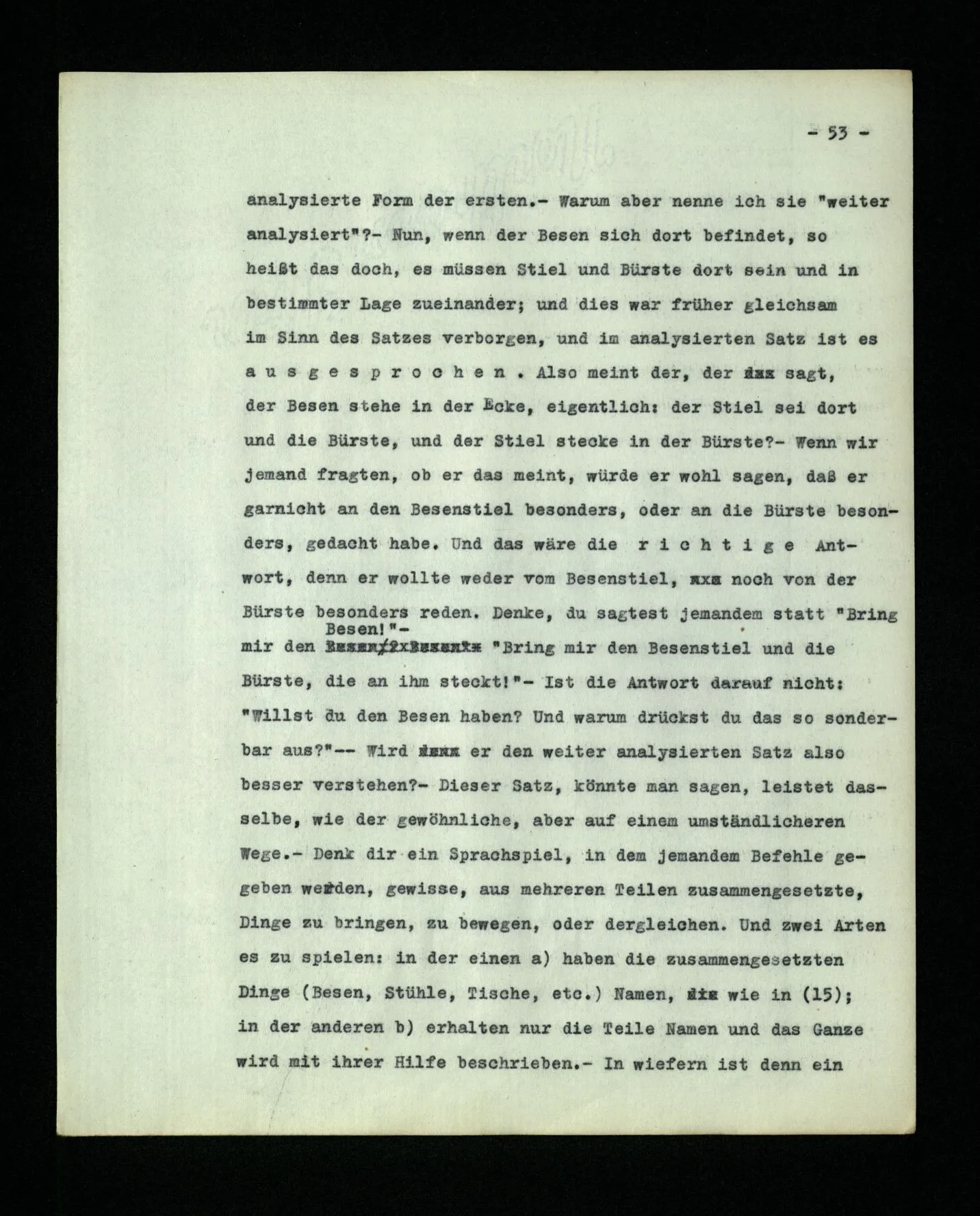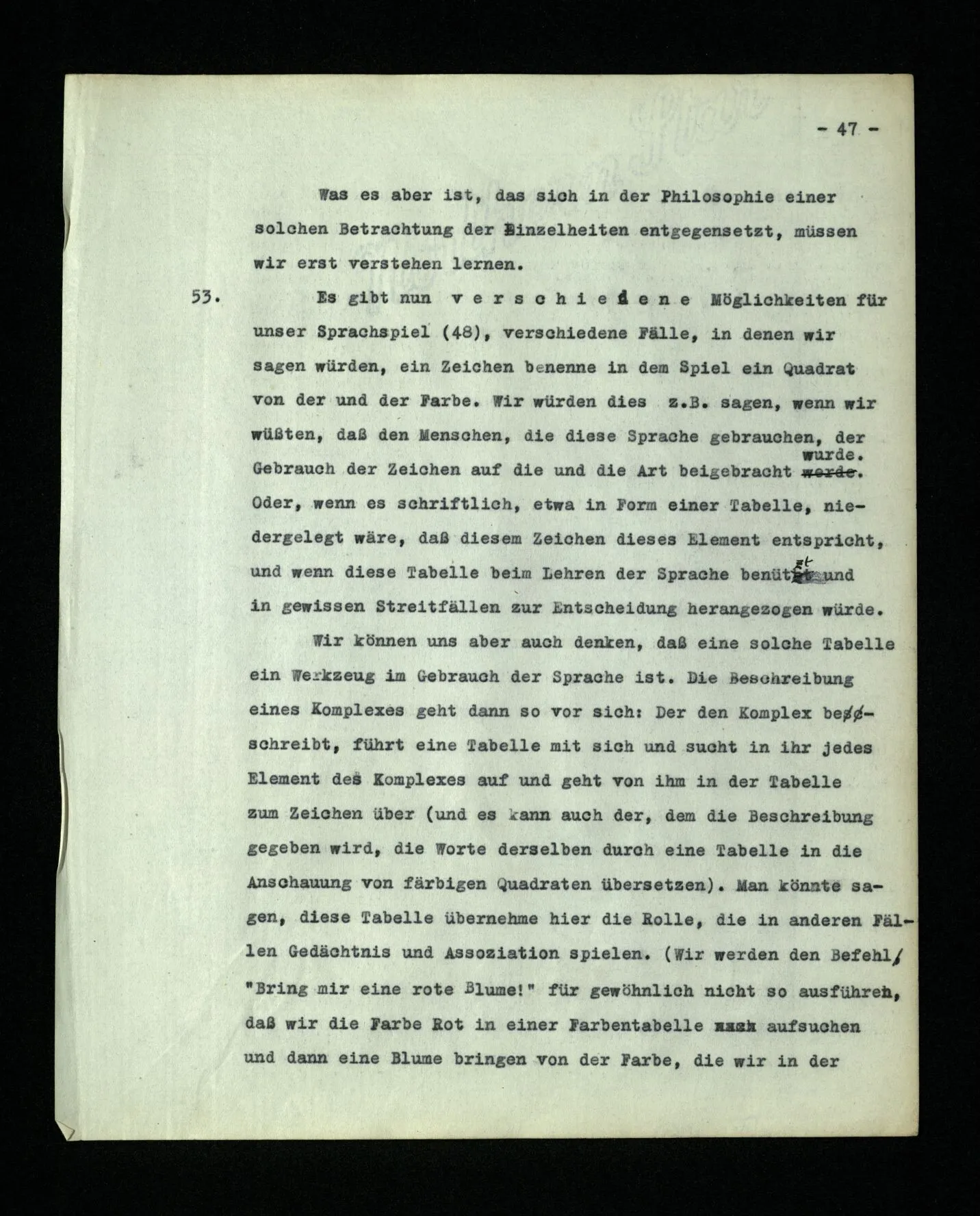– Es ist interessant, die Mannigfaltigkeit der Werkzeuge der Sprache und ihrer Verwendungsweisen, die Mannigfaltigkeit der Wort- und Satzarten, mit dem zu vergleichen, was Logiker über den Bau der Sprache gesagt haben. (Und auch der Verfasser der Logisch-philosophischen Abhandlung.)