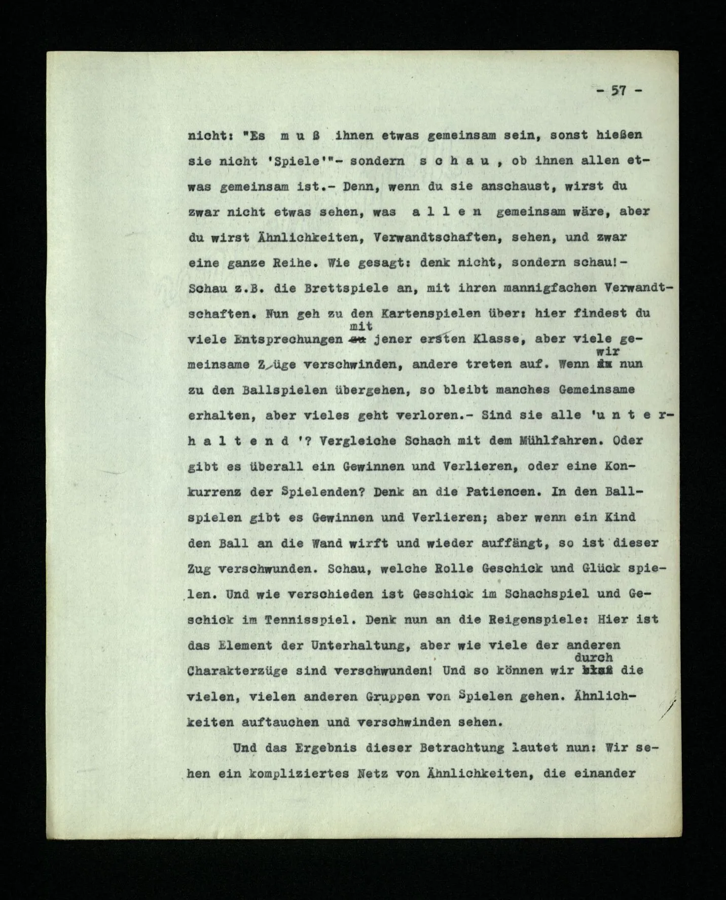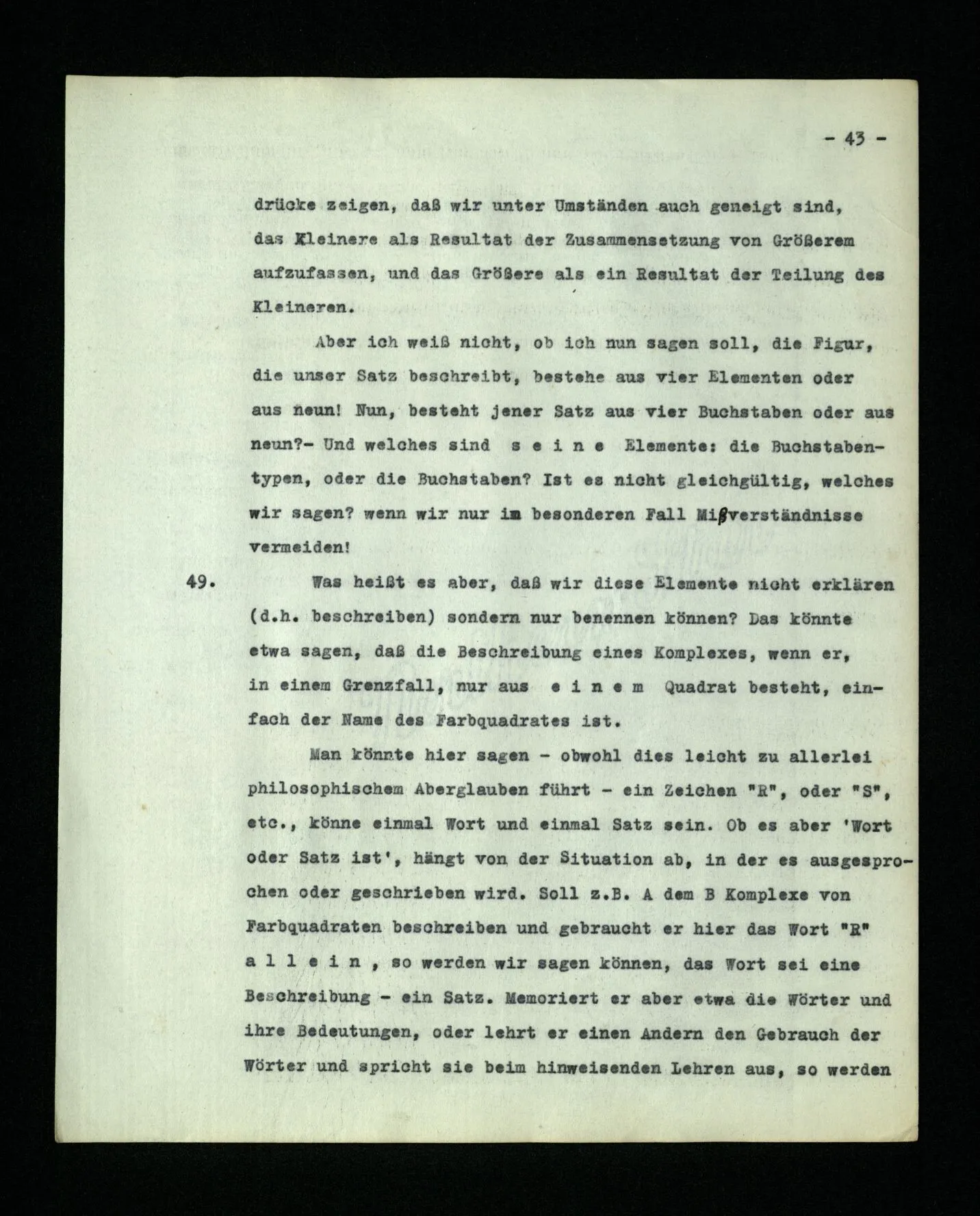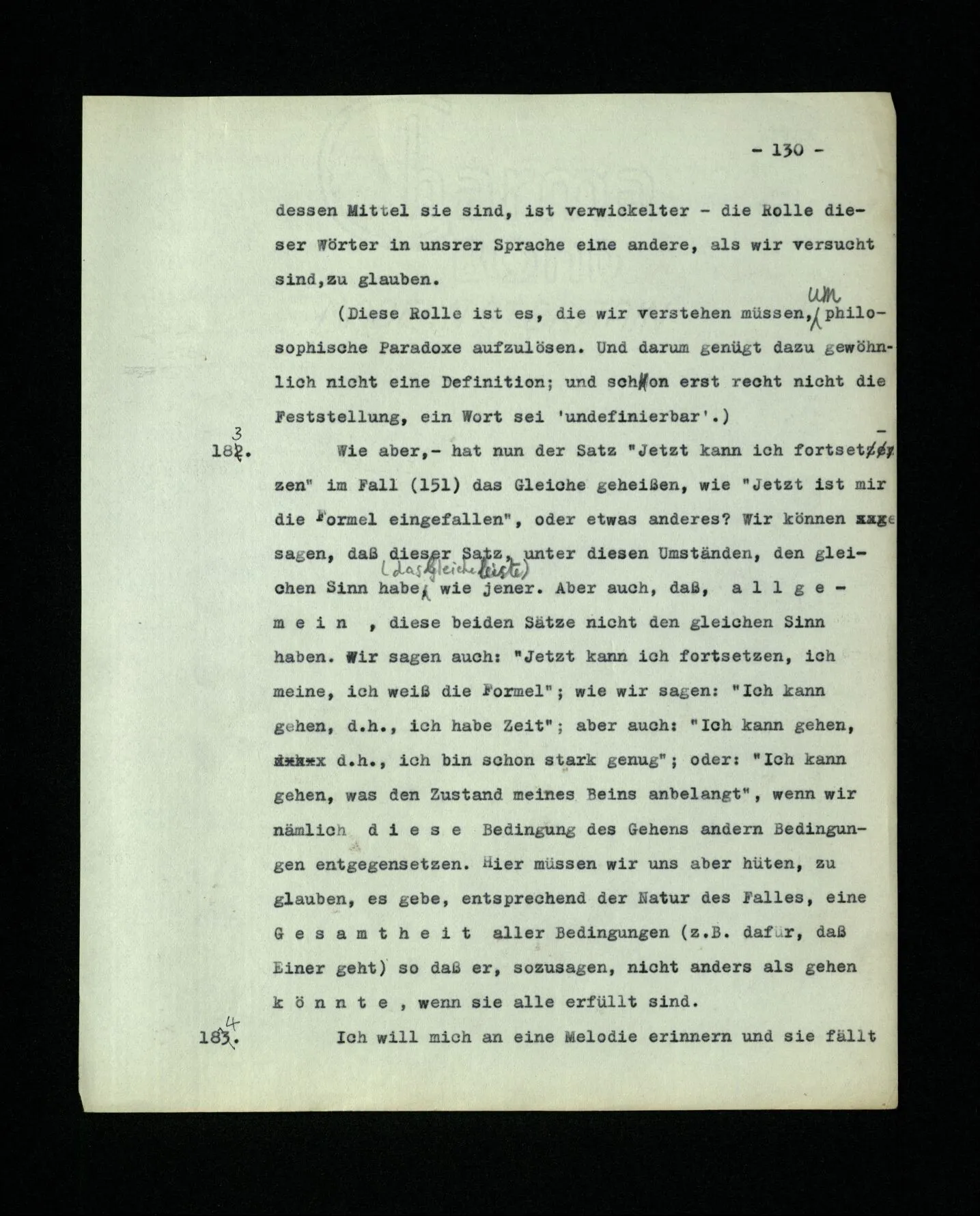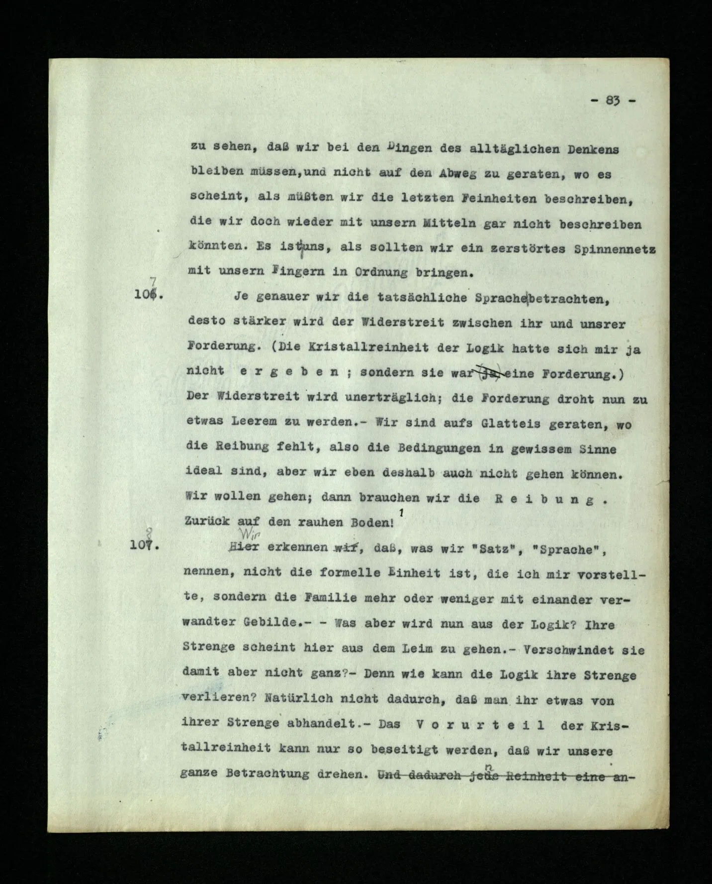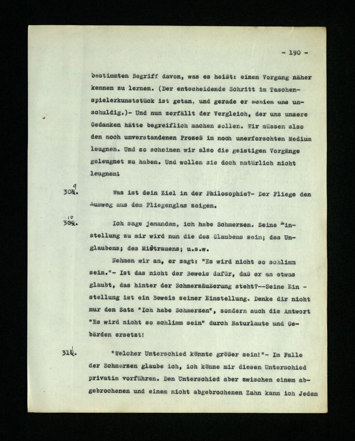 – Es ist interessant, die Mannigfaltigkeit der Werkzeuge der Sprache und ihrer Verwendungsweisen, die Mannigfaltigkeit der Wort- und Satzarten, mit dem zu vergleichen, was Logiker über den Bau der Sprache gesagt haben. (Und auch der Verfasser der Logisch-philosophischen Abhandlung.)