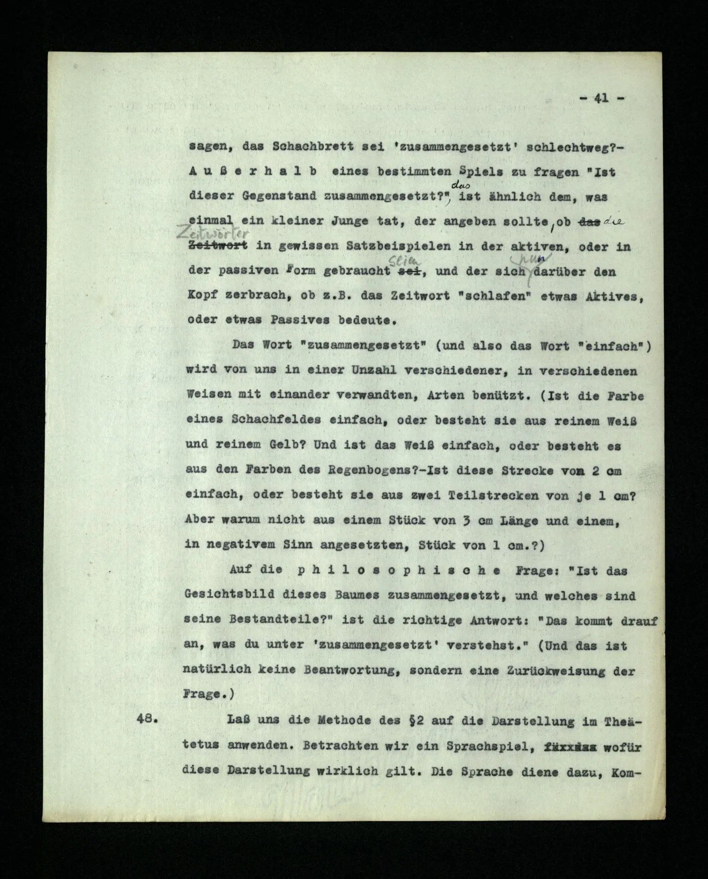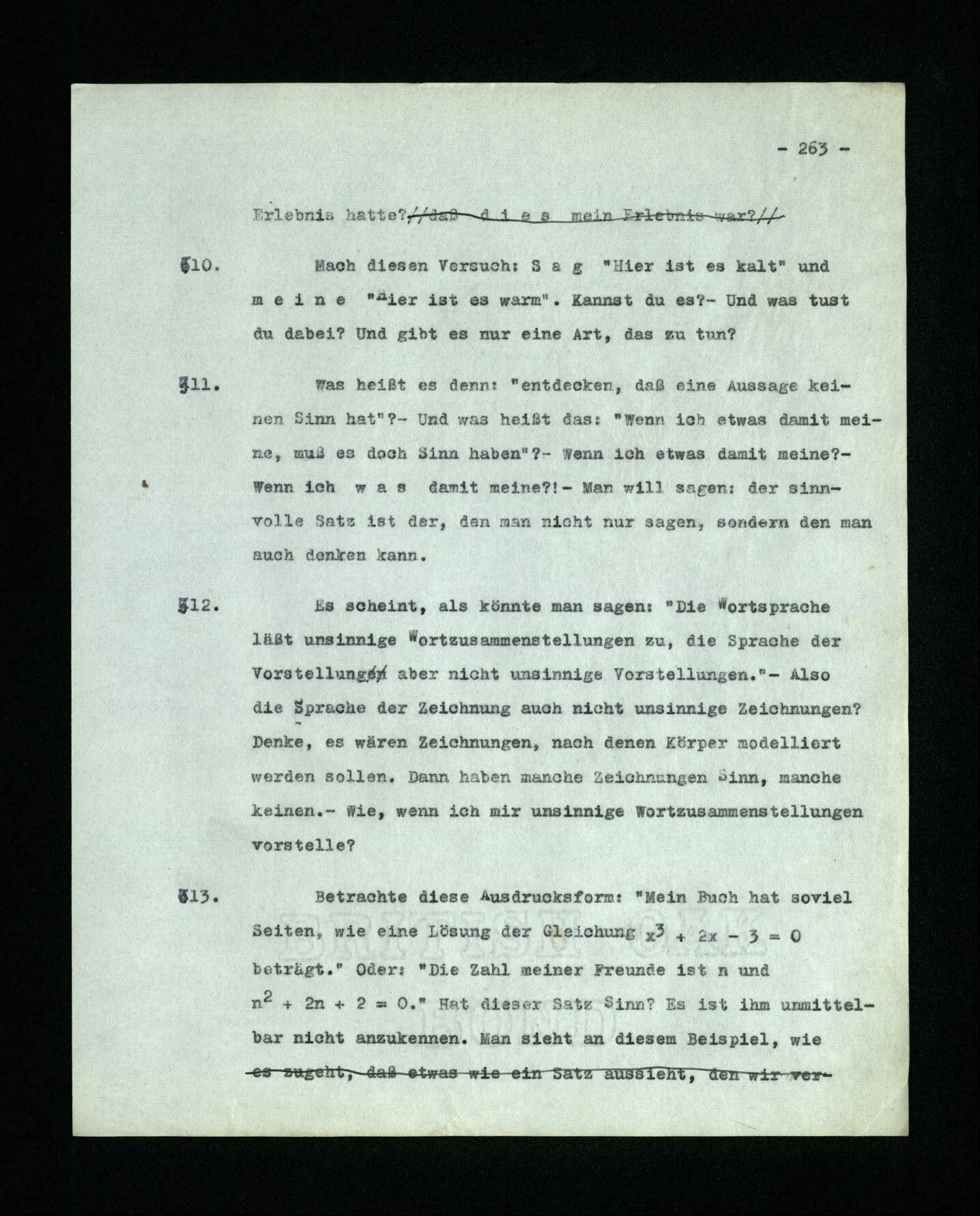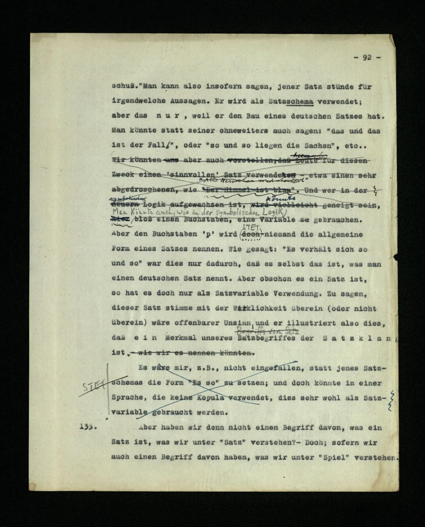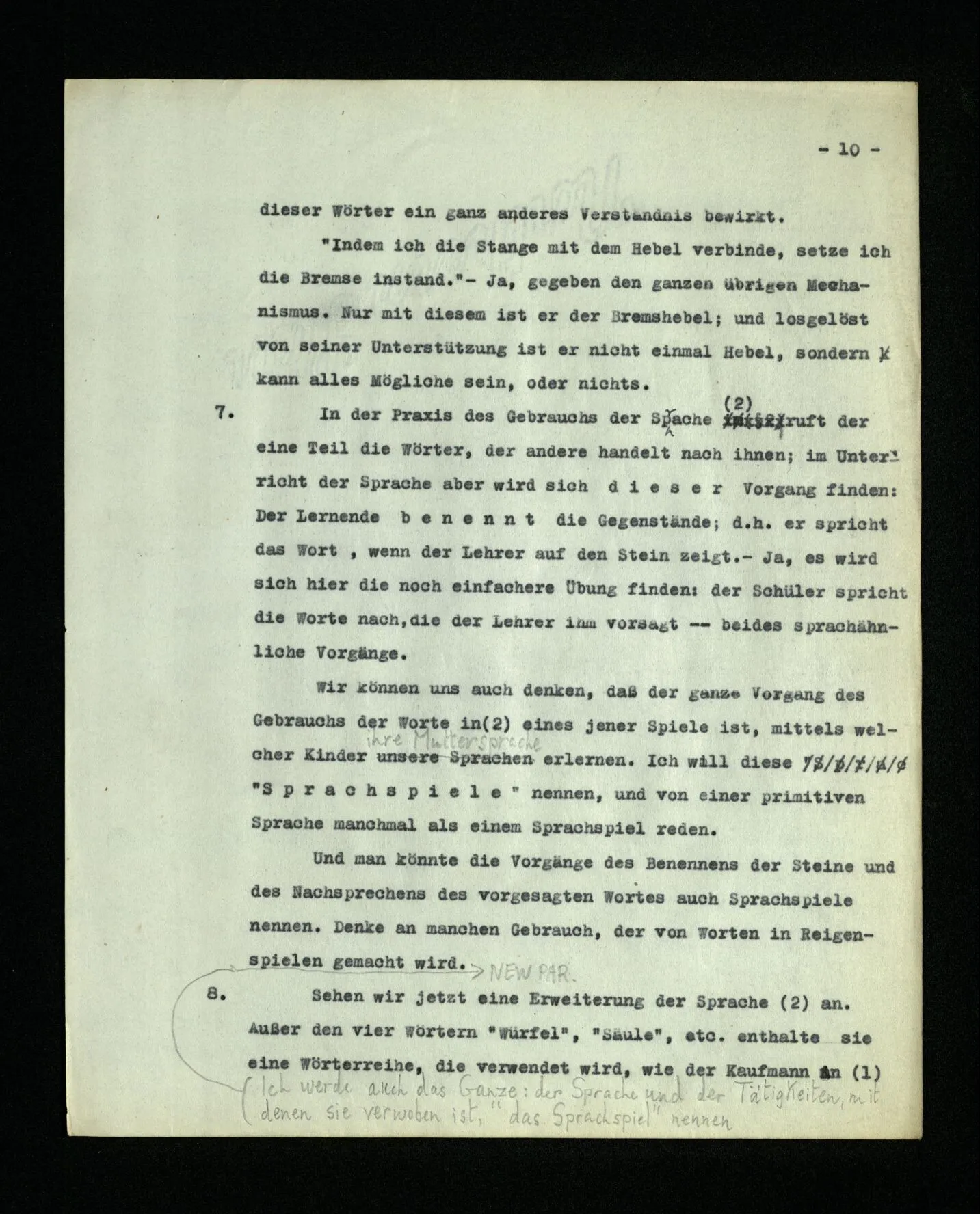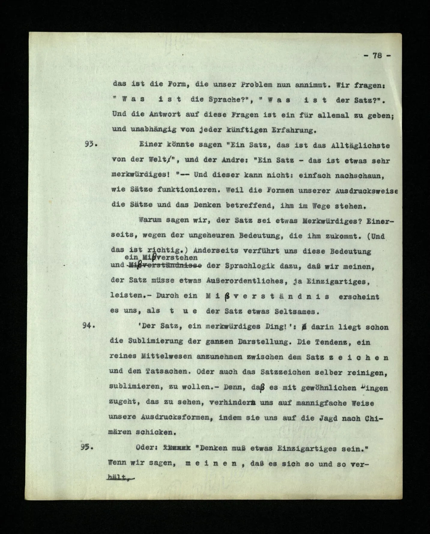 – Es ist interessant, die Mannigfaltigkeit der Werkzeuge der Sprache und ihrer Verwendungsweisen, die Mannigfaltigkeit der Wort- und Satzarten, mit dem zu vergleichen, was Logiker über den Bau der Sprache gesagt haben. (Und auch der Verfasser der Logisch-philosophischen Abhandlung.)