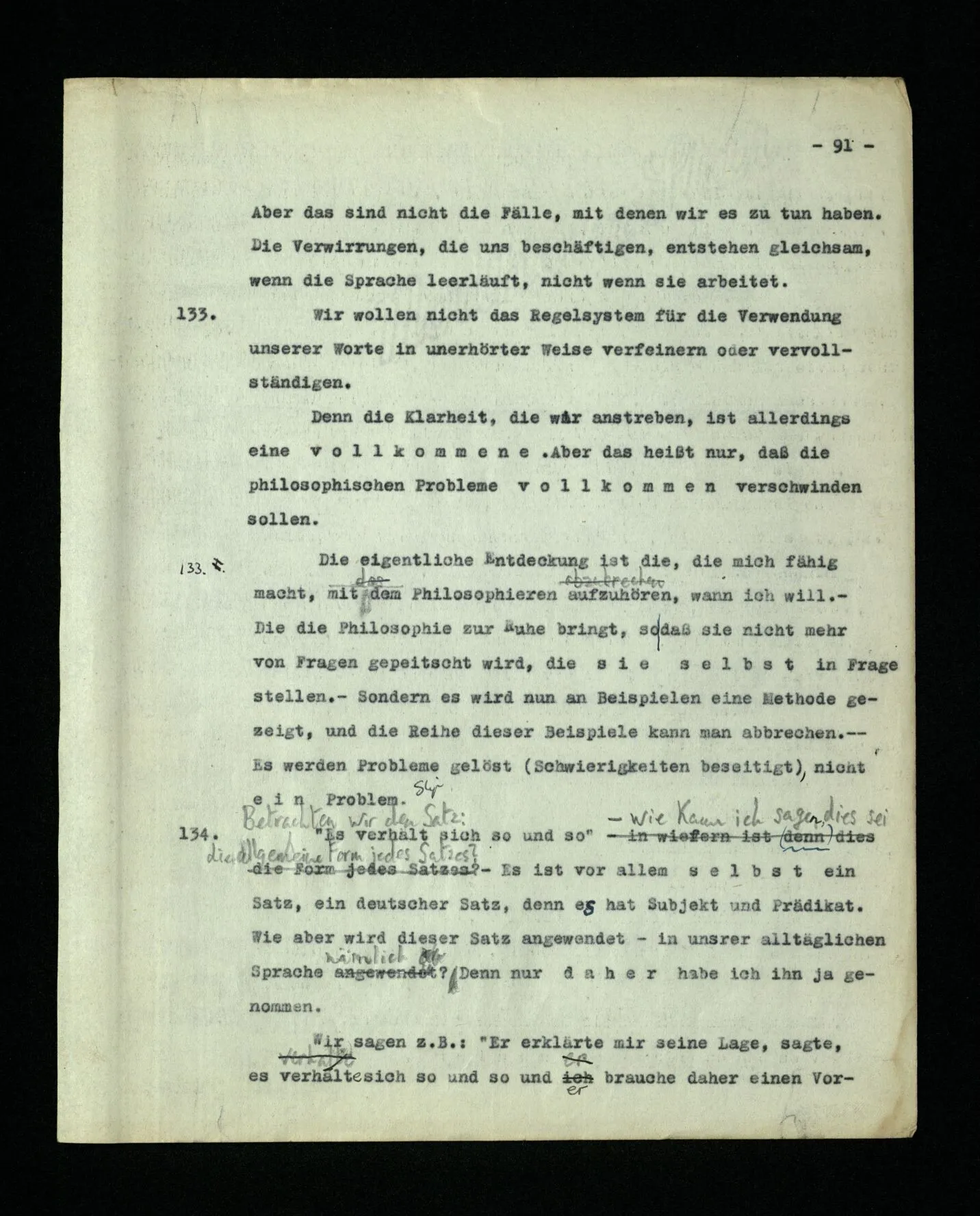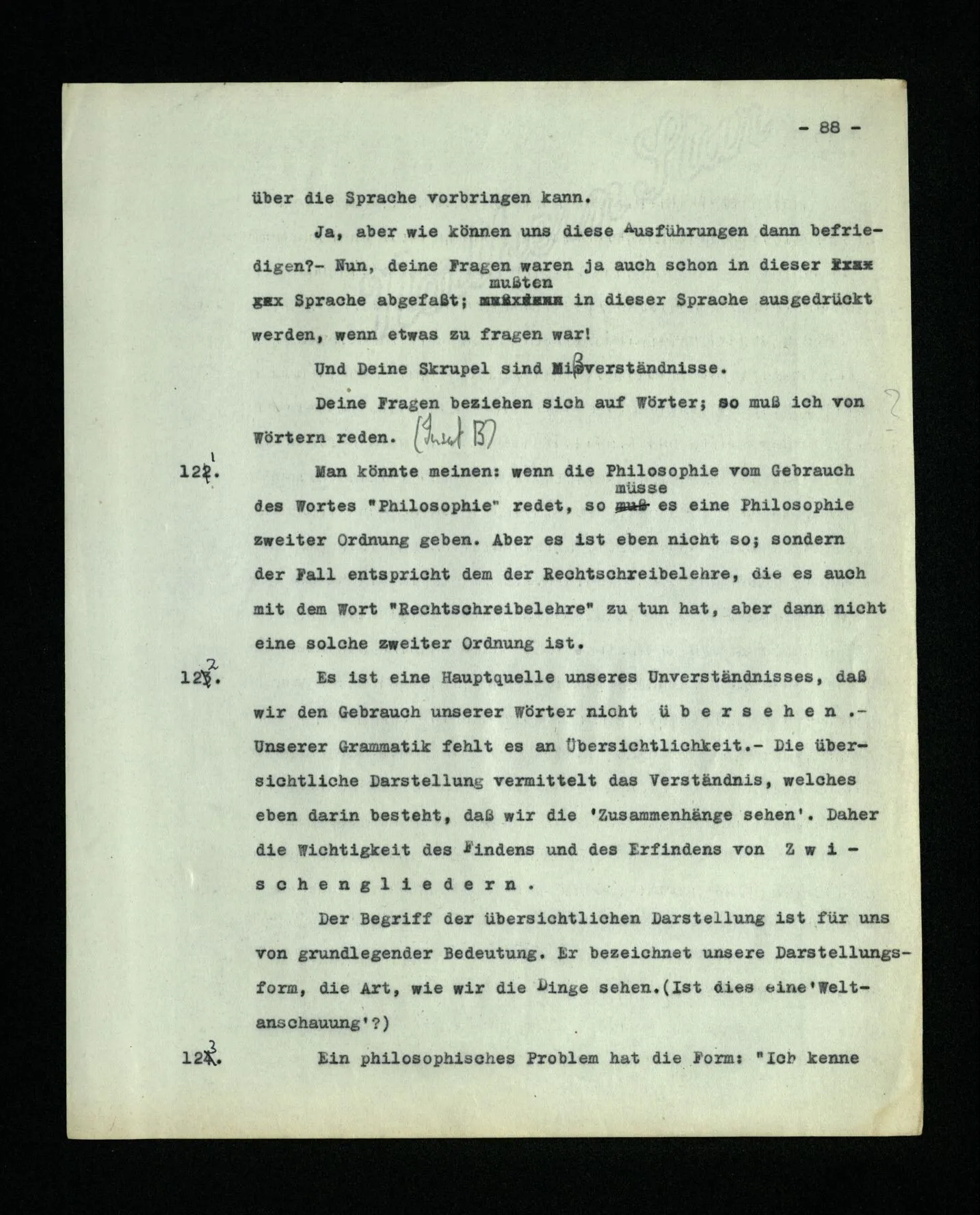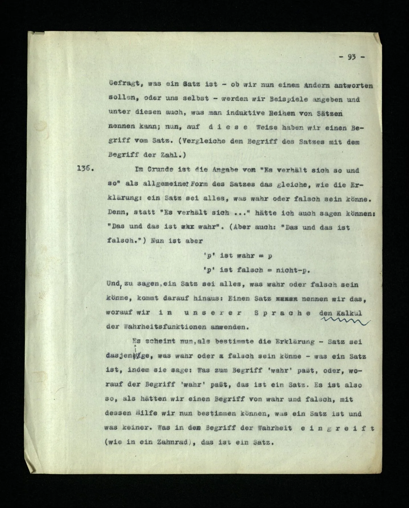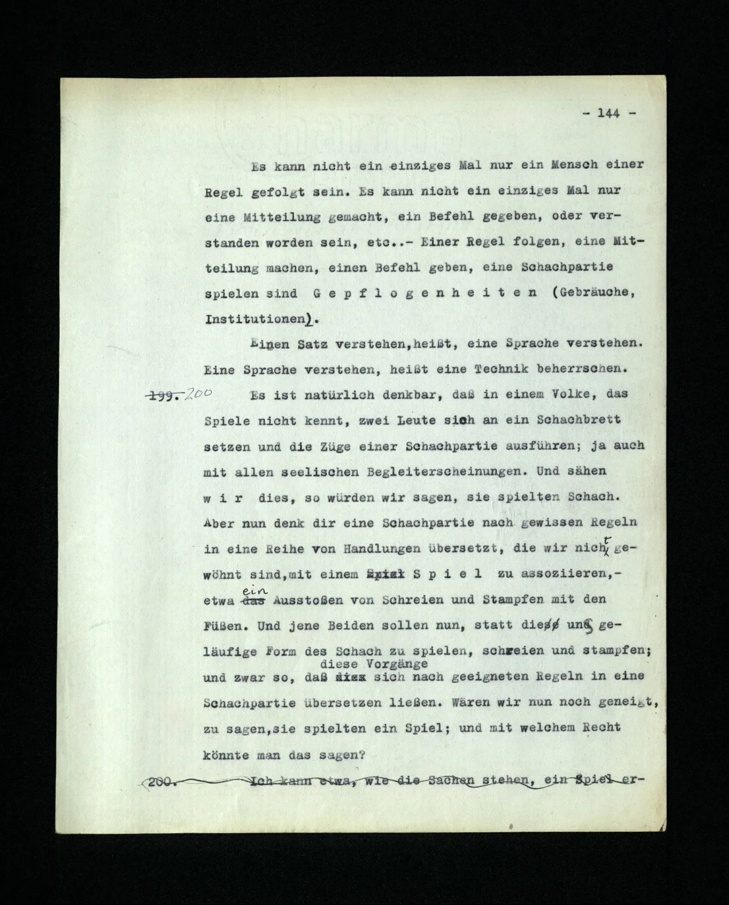 – Es ist interessant, die Mannigfaltigkeit der Werkzeuge der Sprache und ihrer Verwendungsweisen, die Mannigfaltigkeit der Wort- und Satzarten, mit dem zu vergleichen, was Logiker über den Bau der Sprache gesagt haben. (Und auch der Verfasser der Logisch-philosophischen Abhandlung.)