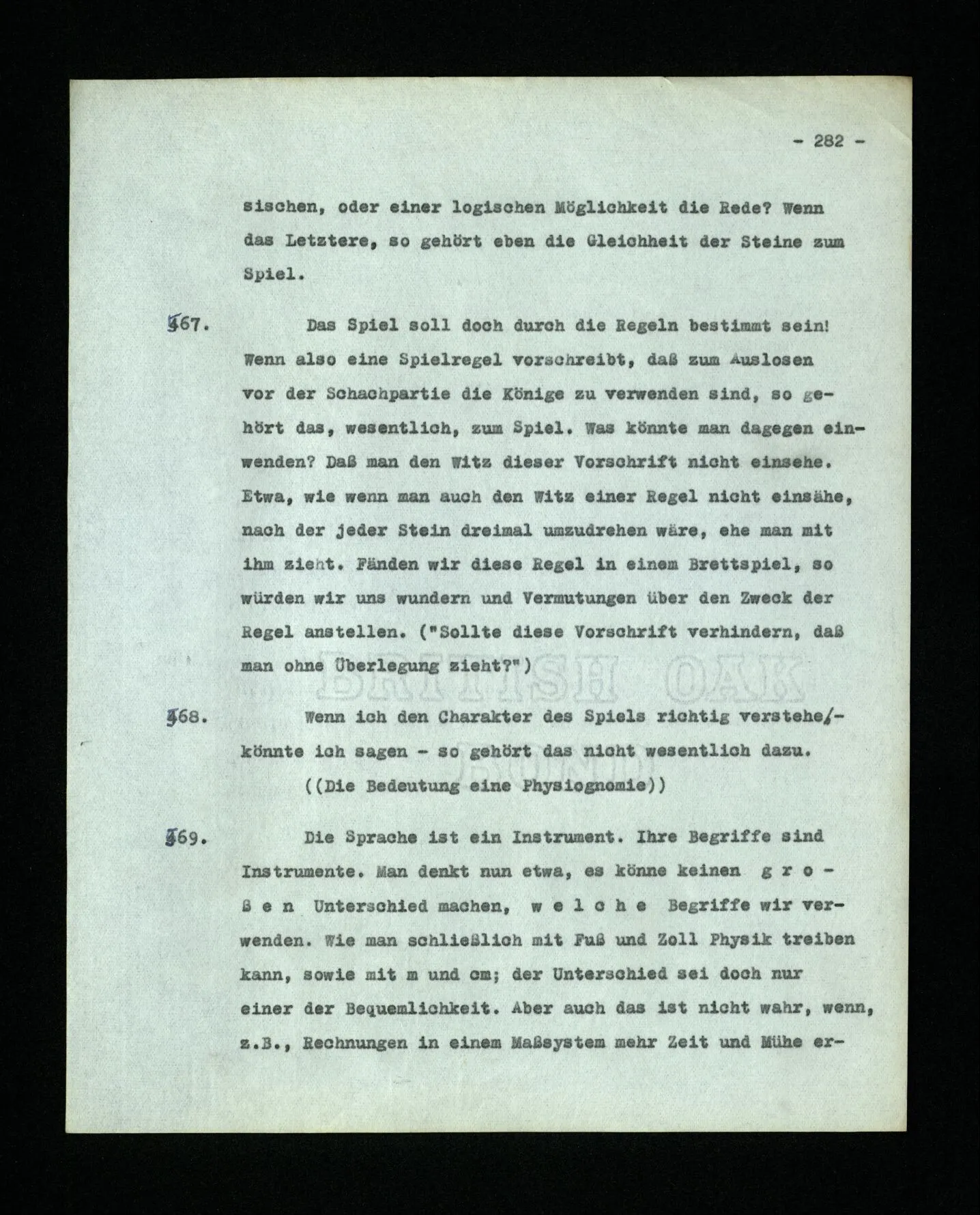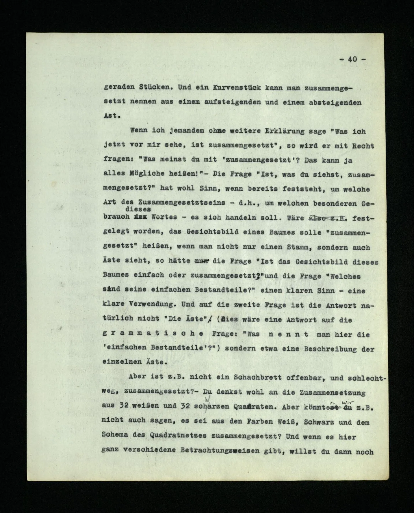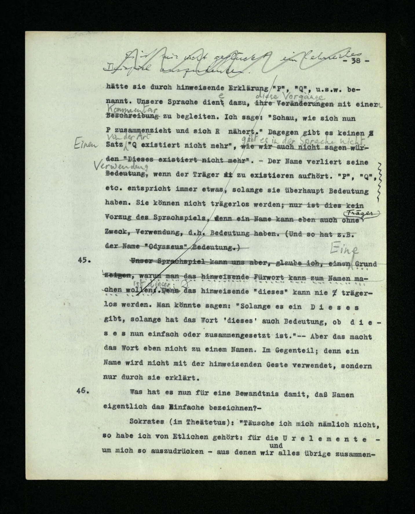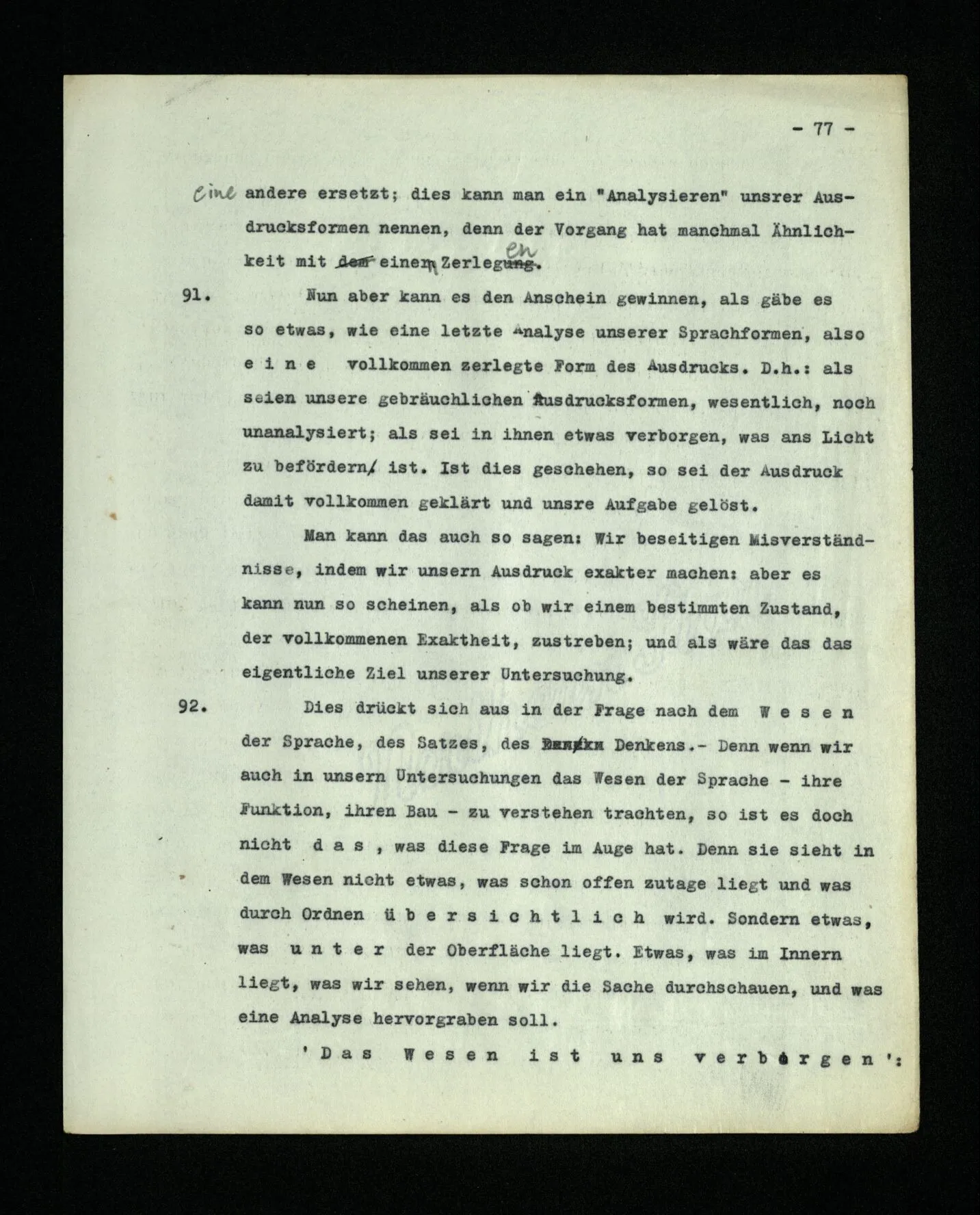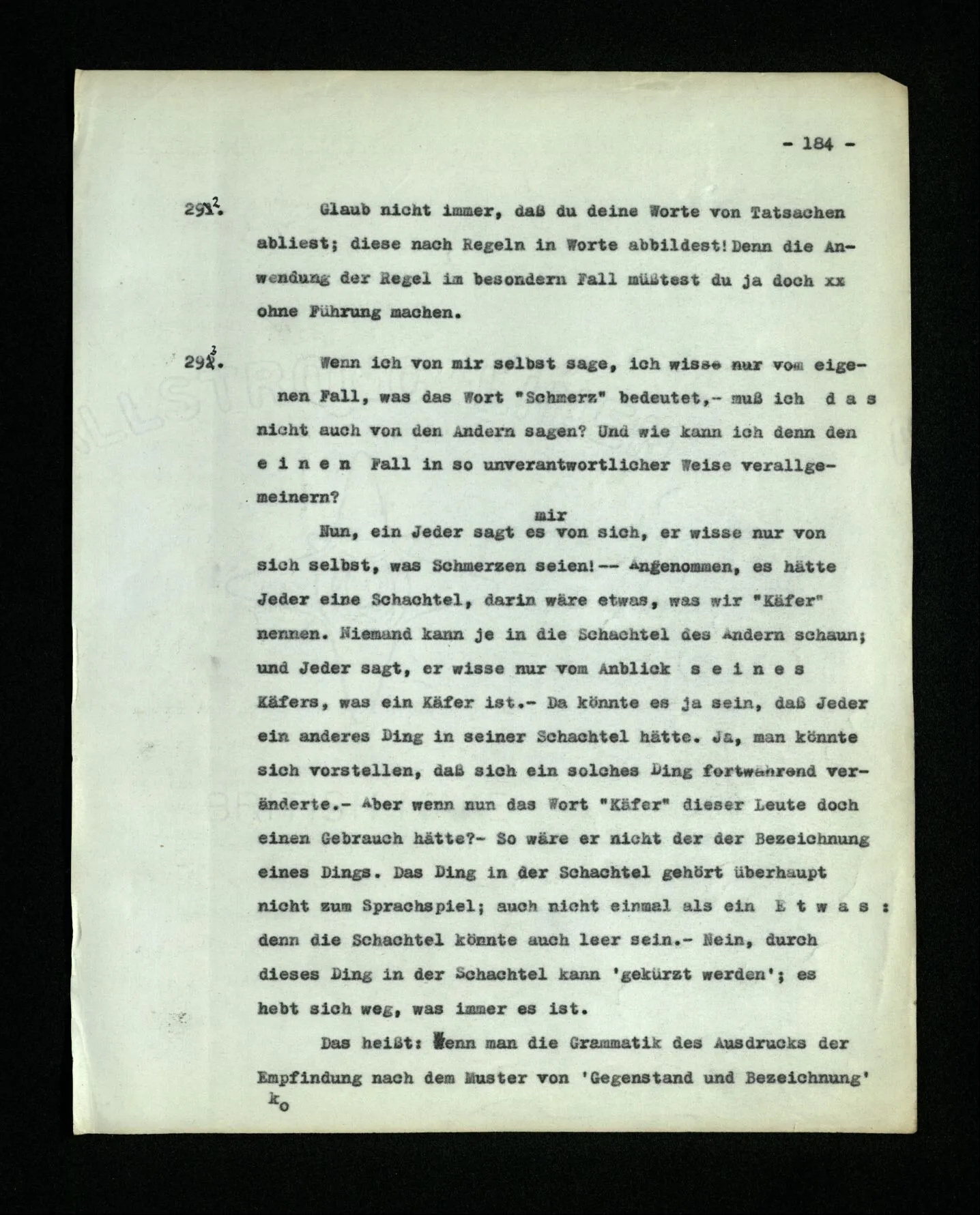 – Es ist interessant, die Mannigfaltigkeit der Werkzeuge der Sprache und ihrer Verwendungsweisen, die Mannigfaltigkeit der Wort- und Satzarten, mit dem zu vergleichen, was Logiker über den Bau der Sprache gesagt haben. (Und auch der Verfasser der Logisch-philosophischen Abhandlung.)