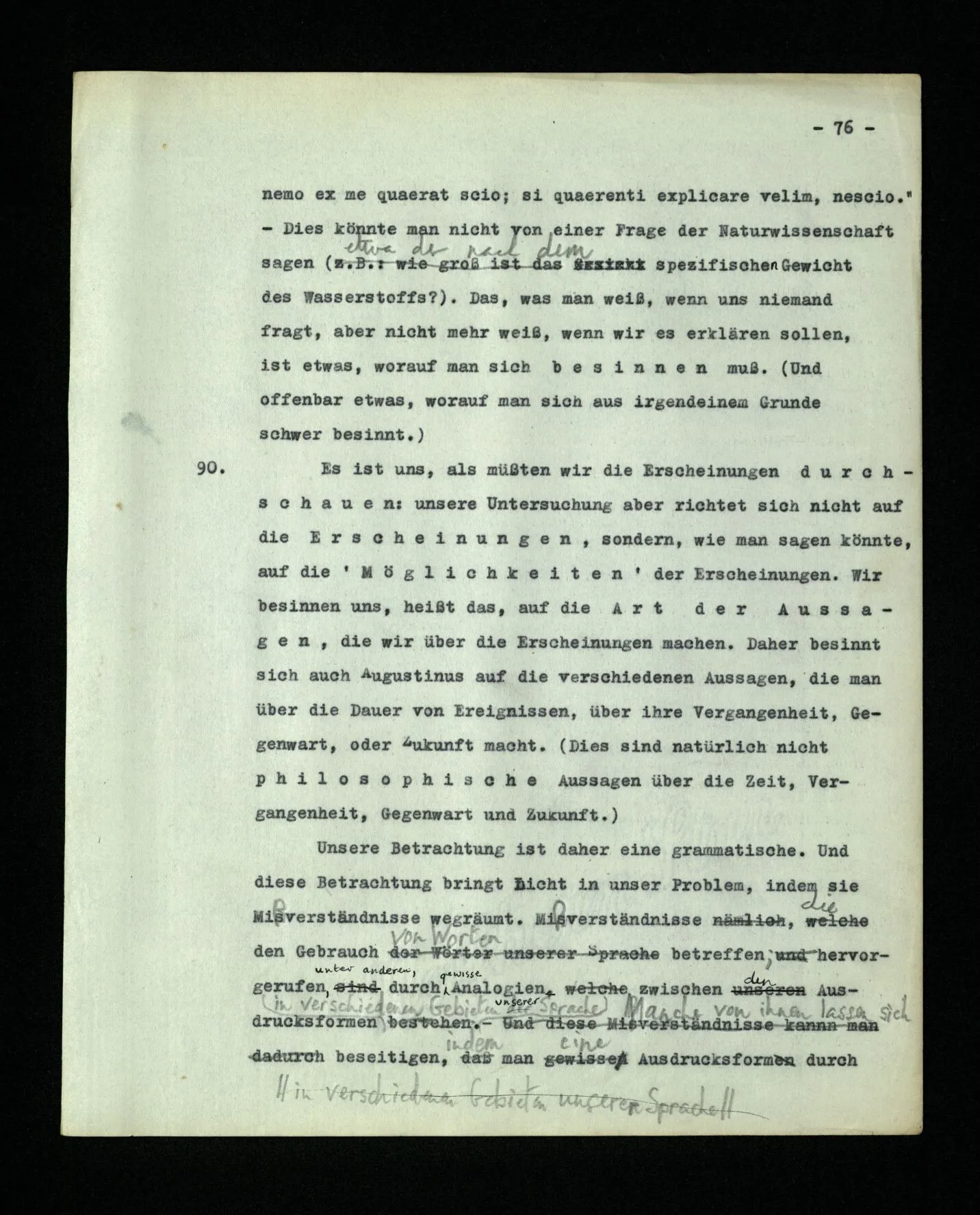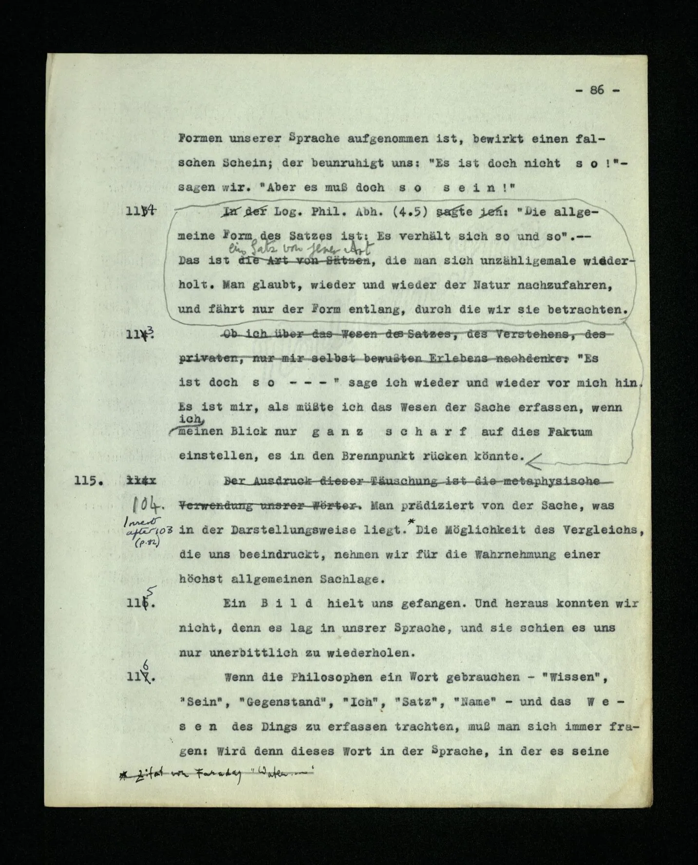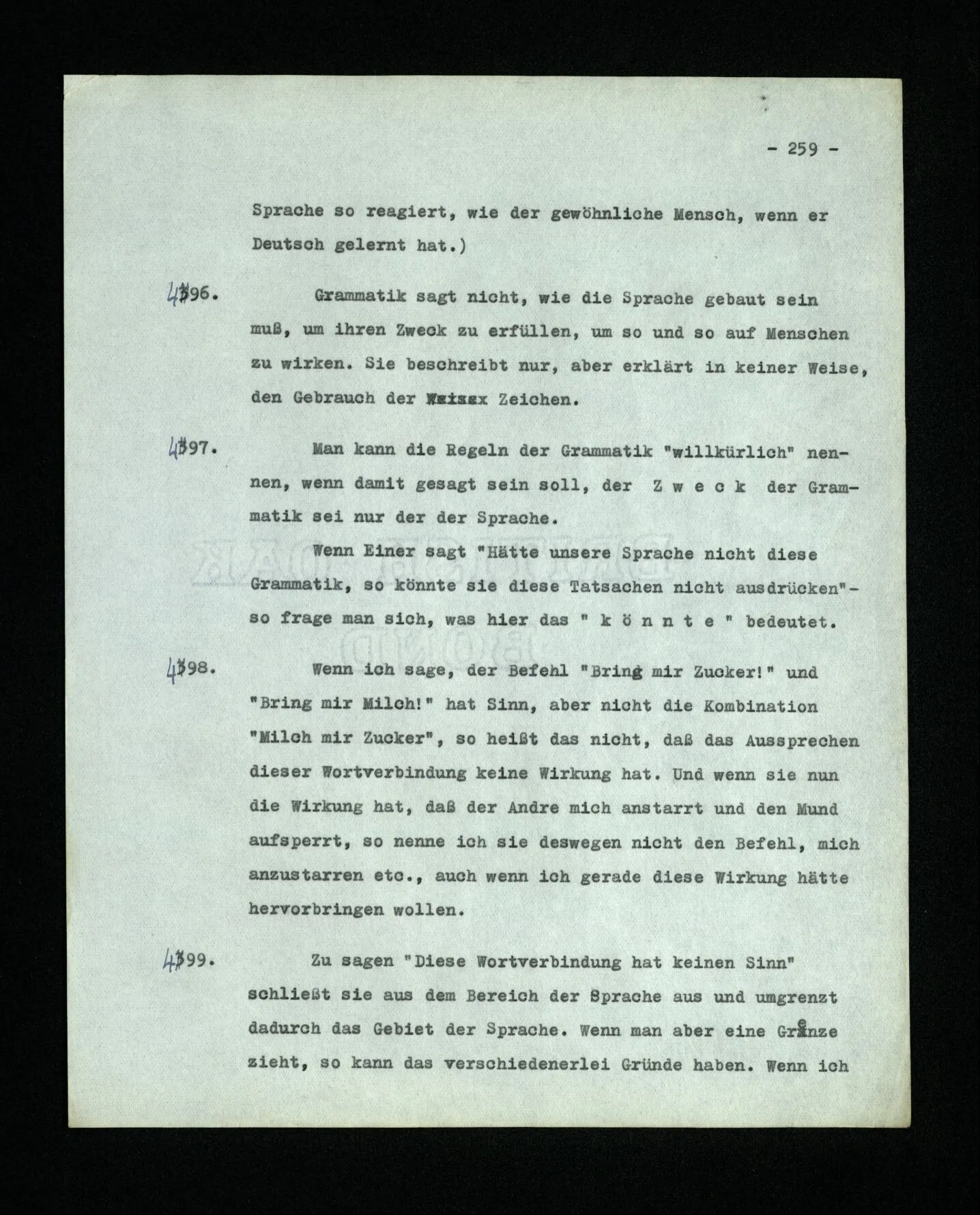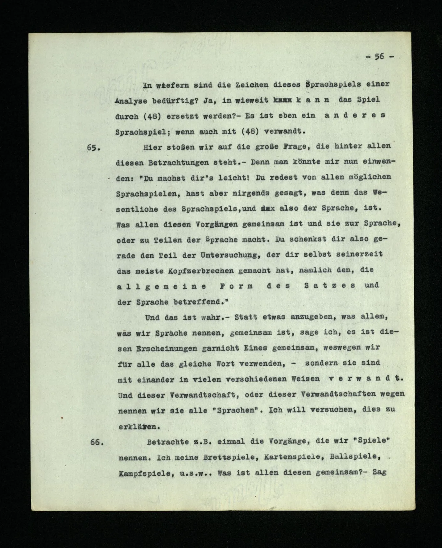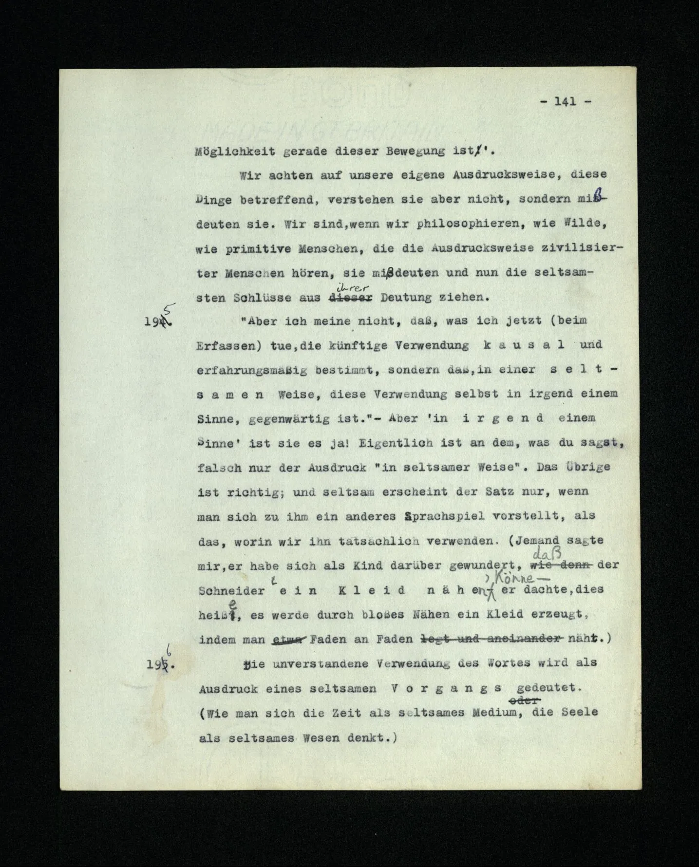 – Es ist interessant, die Mannigfaltigkeit der Werkzeuge der Sprache und ihrer Verwendungsweisen, die Mannigfaltigkeit der Wort- und Satzarten, mit dem zu vergleichen, was Logiker über den Bau der Sprache gesagt haben. (Und auch der Verfasser der Logisch-philosophischen Abhandlung.)
