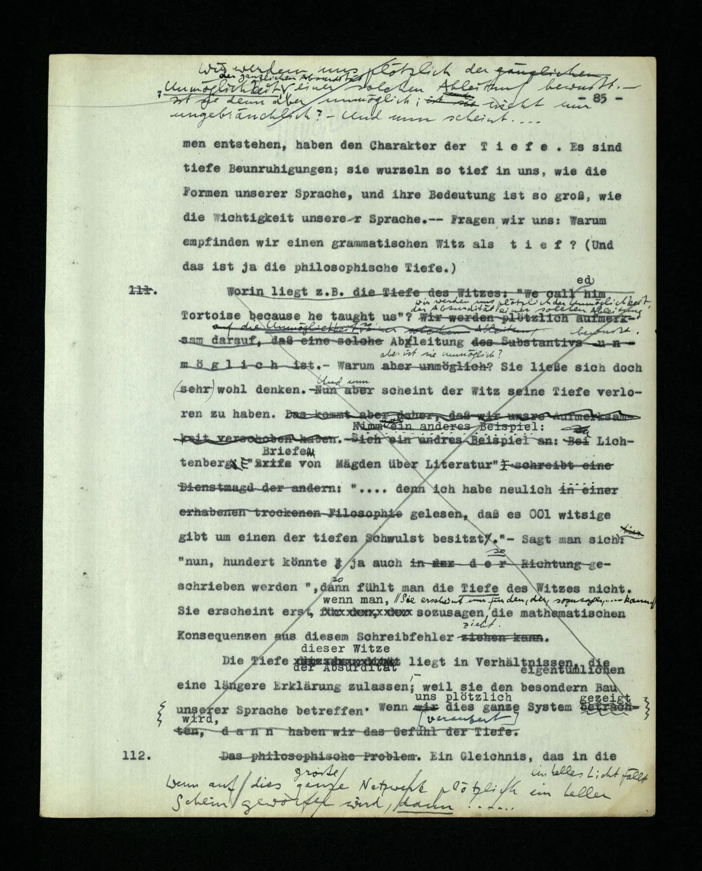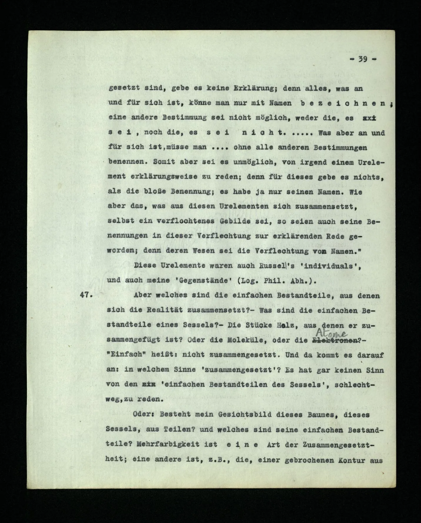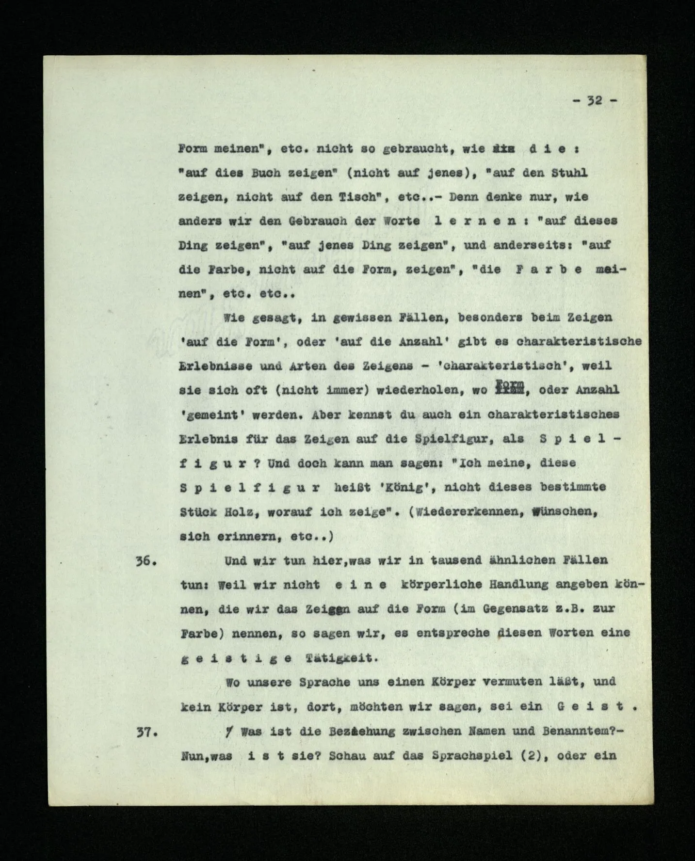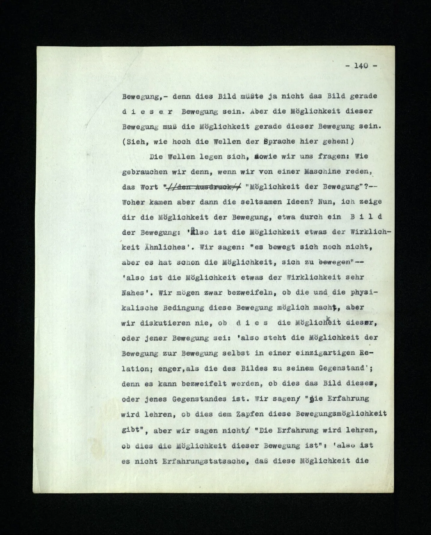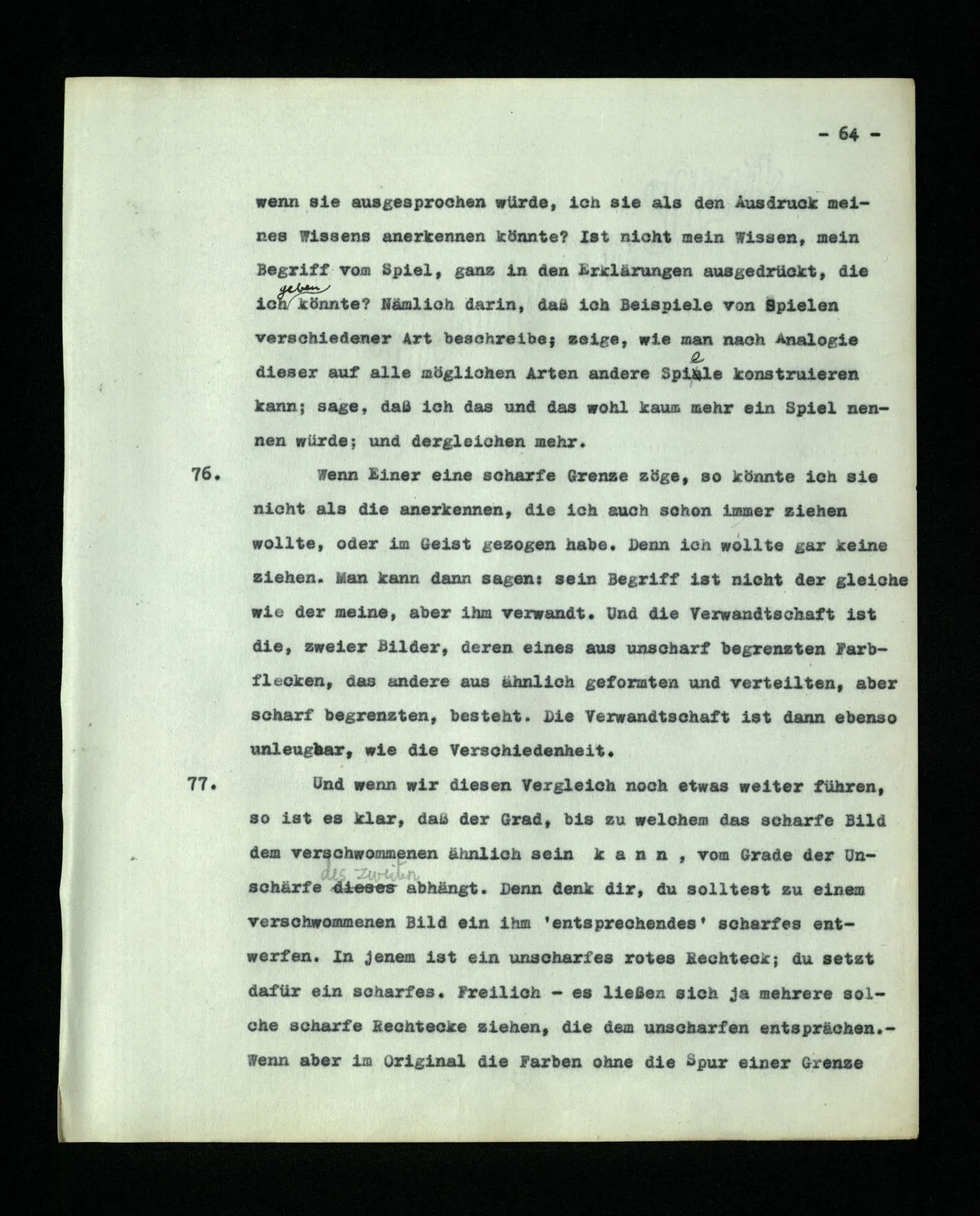 – Es ist interessant, die Mannigfaltigkeit der Werkzeuge der Sprache und ihrer Verwendungsweisen, die Mannigfaltigkeit der Wort- und Satzarten, mit dem zu vergleichen, was Logiker über den Bau der Sprache gesagt haben. (Und auch der Verfasser der Logisch-philosophischen Abhandlung.)