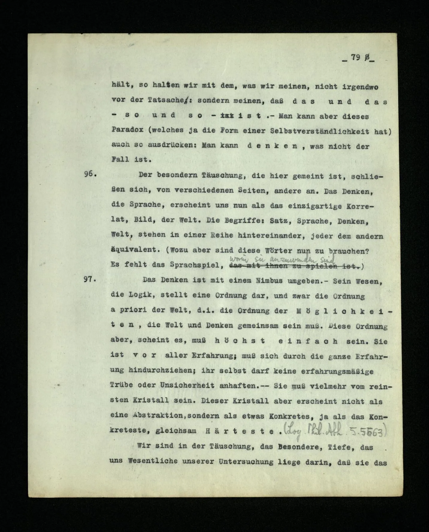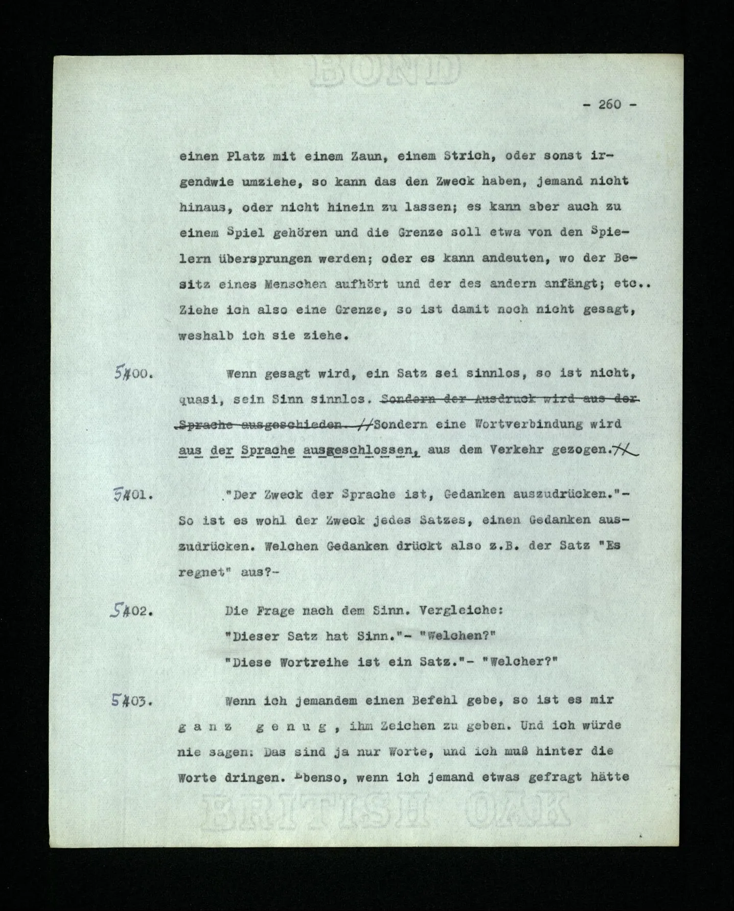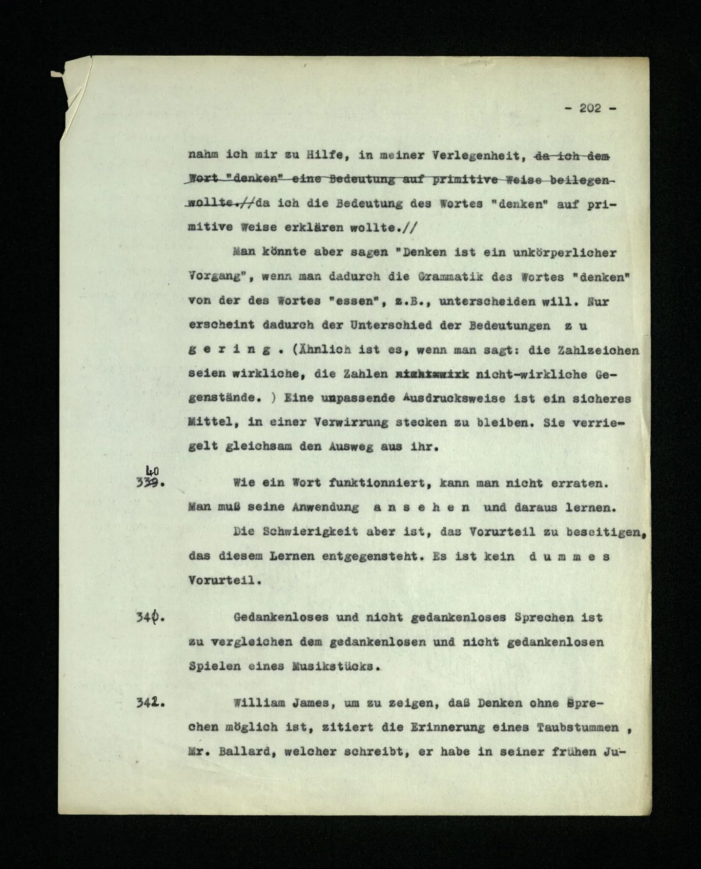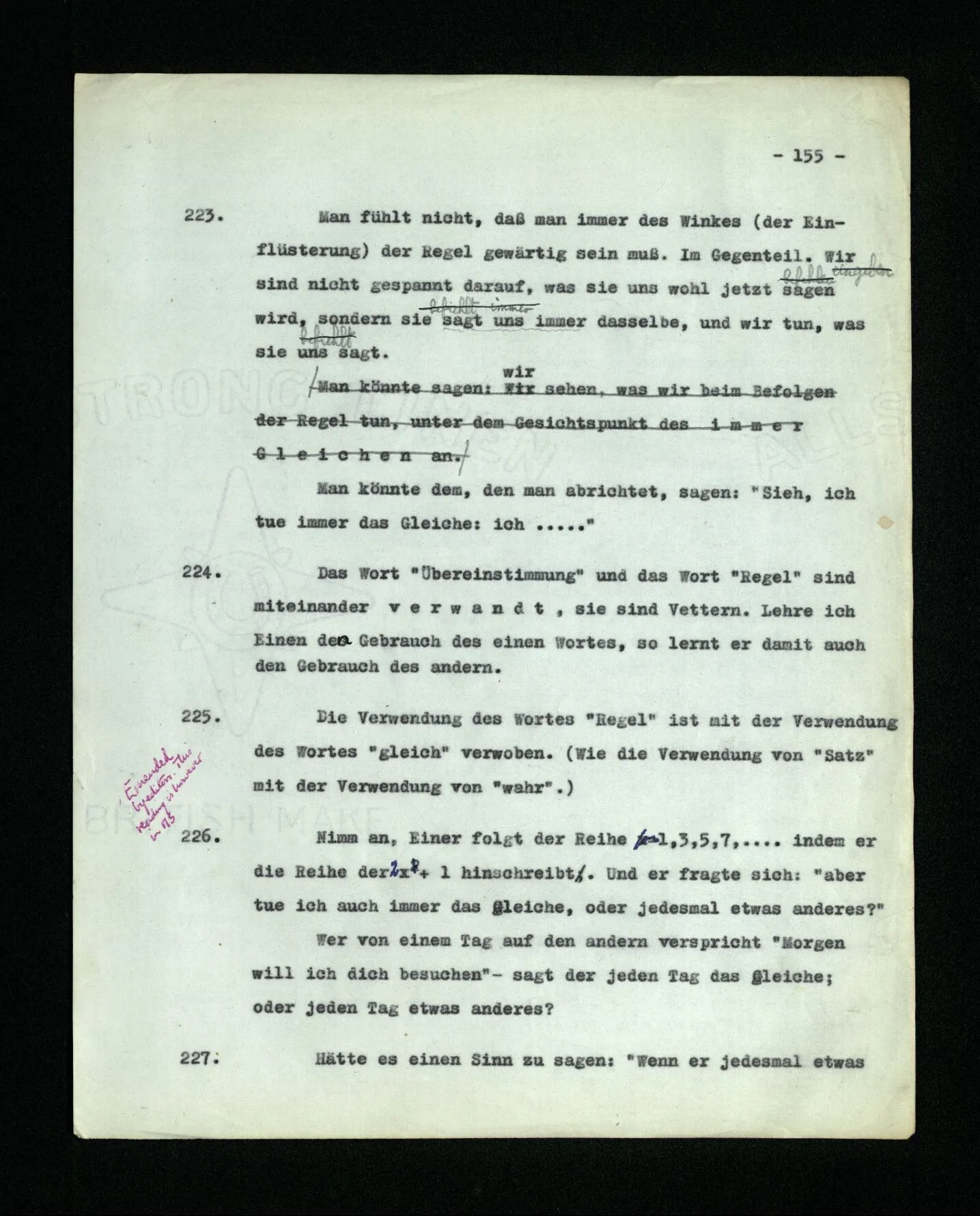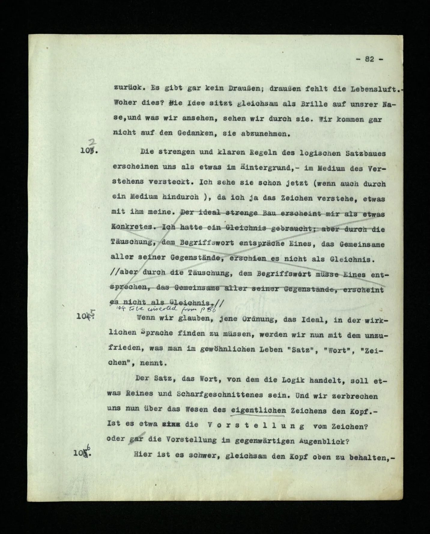 – Es ist interessant, die Mannigfaltigkeit der Werkzeuge der Sprache und ihrer Verwendungsweisen, die Mannigfaltigkeit der Wort- und Satzarten, mit dem zu vergleichen, was Logiker über den Bau der Sprache gesagt haben. (Und auch der Verfasser der Logisch-philosophischen Abhandlung.)