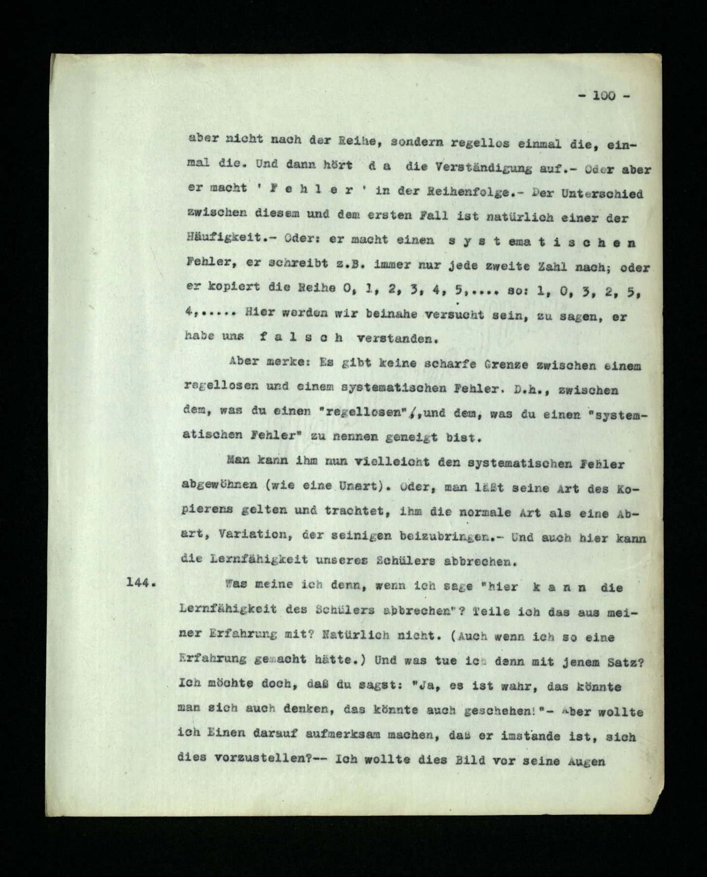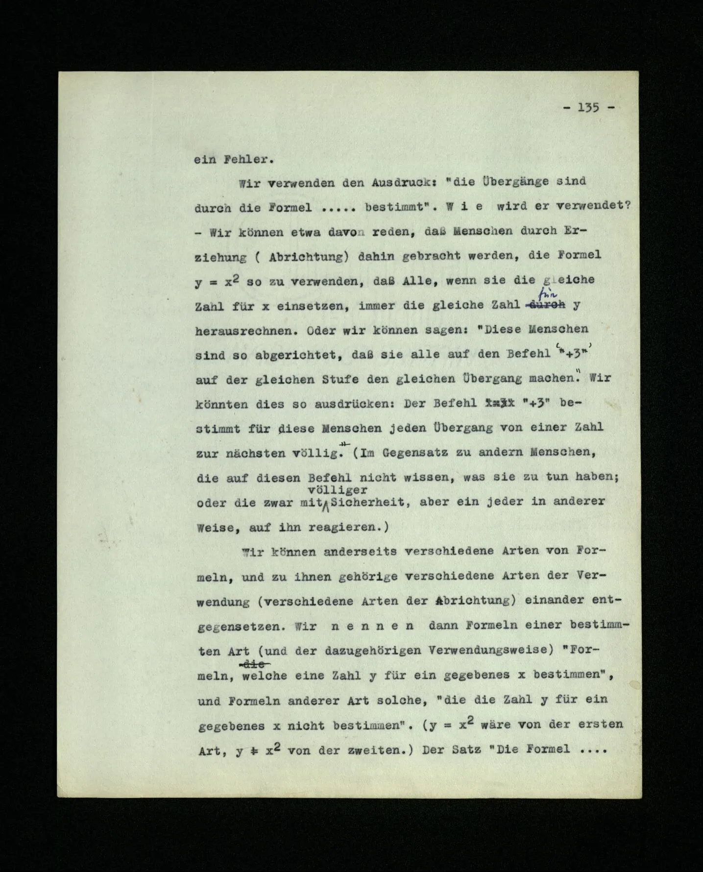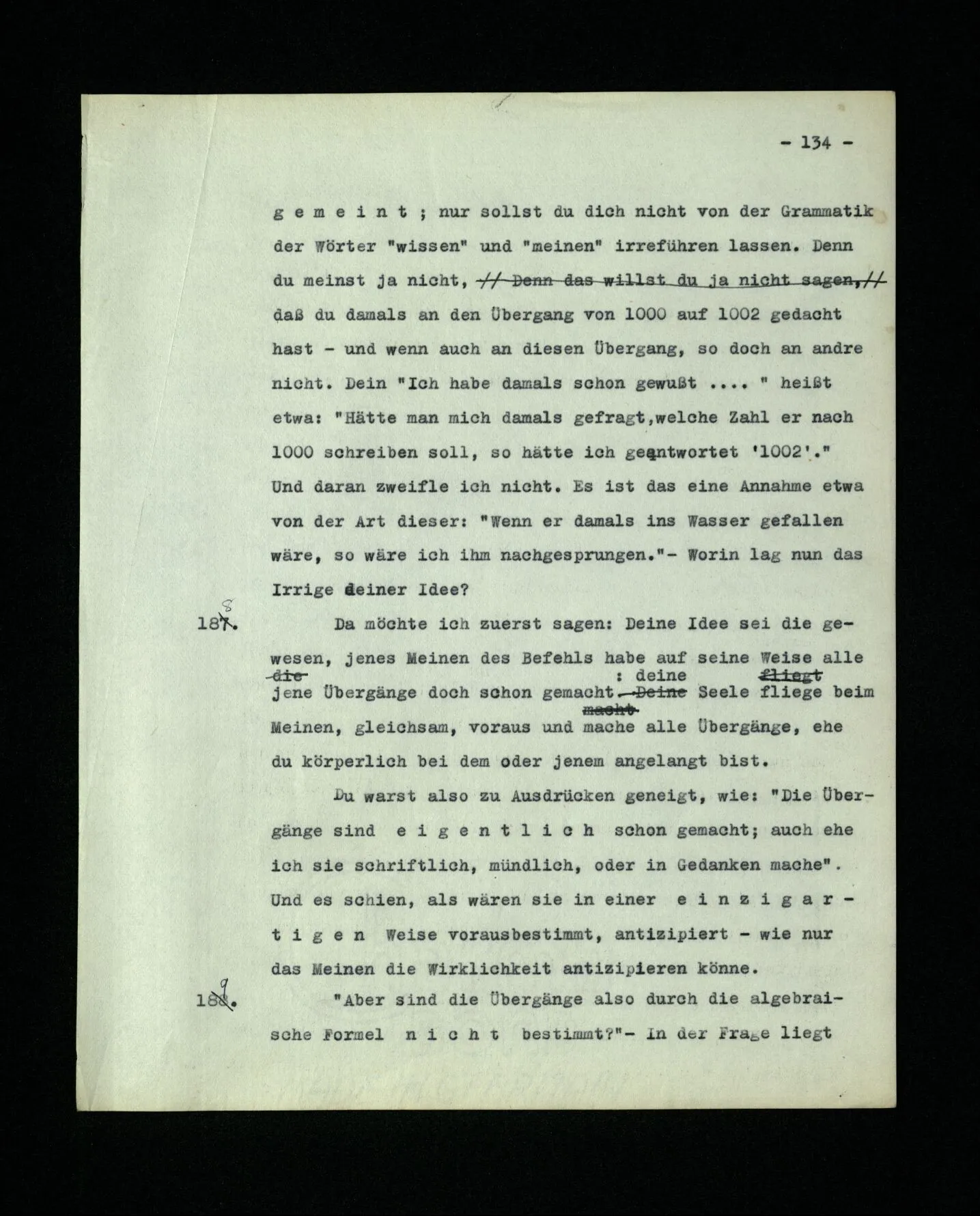 693. “Wenn ich Einen die Bildung der Reihe … lehre, meine ich doch, er solle an der hundertsten Stelle … schreiben.” – Ganz richtig: du meinst es. Und offenbar, ohne notwendigerweise auch nur daran zu denken. Das zeigt dir, wie verschieden die Grammatik des Zeitworts “meinen” von der des Zeitworts “denken” ist. Und nichts Verkehrteres, als Meinen eine geistige Tätigkeit nennen! Wenn man nämlich nicht darauf ausgeht, Verwirrung zu erzeugen. (Man könnte auch von einer Tätigkeit der Butter reden, wenn sie im Preise steigt; und wenn dadurch keine Probleme erzeugt werden, so ist es harmlos.)