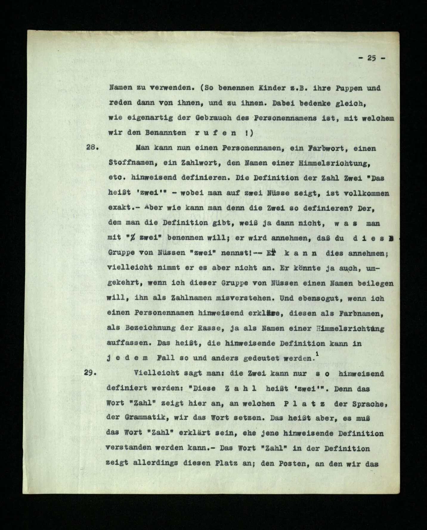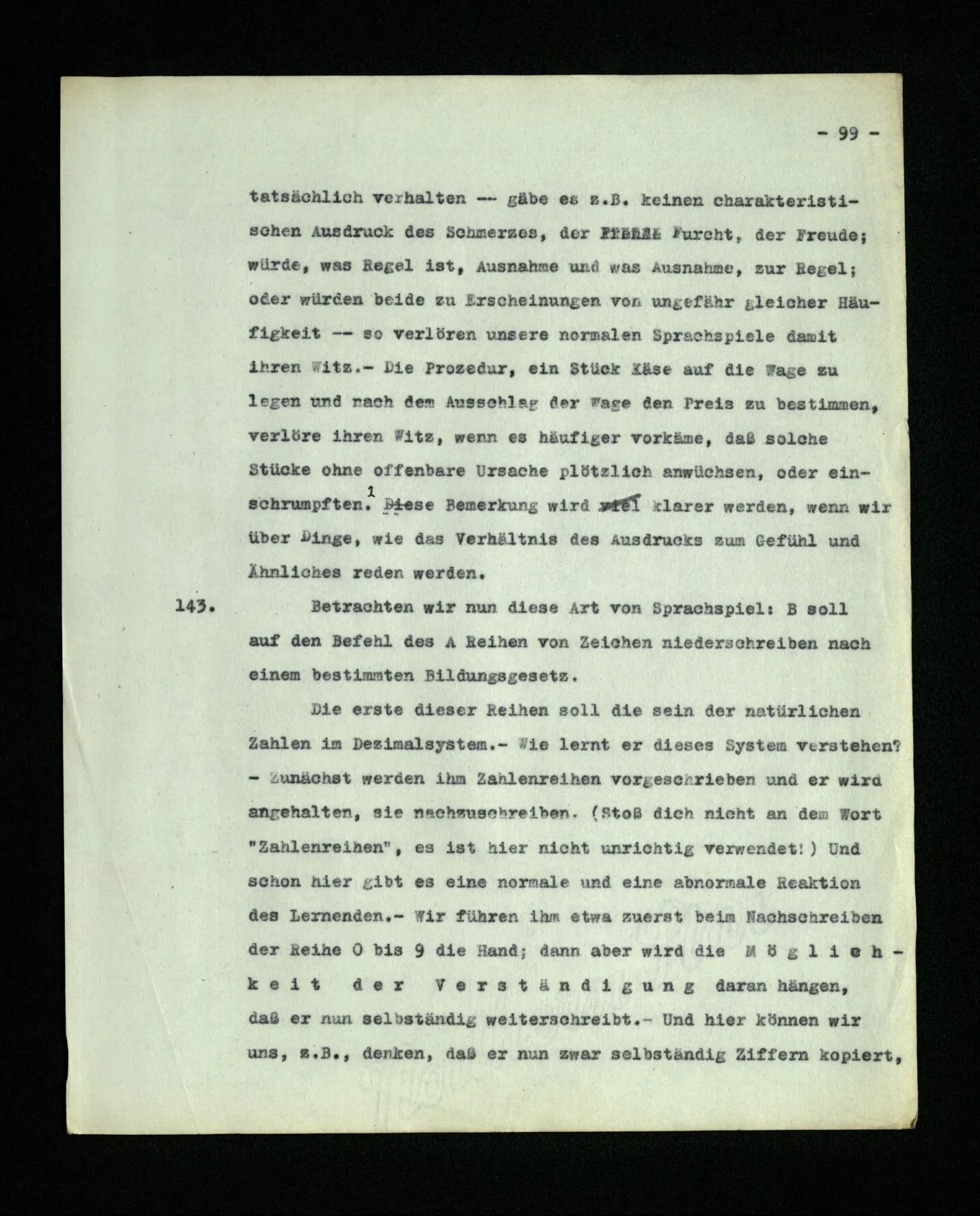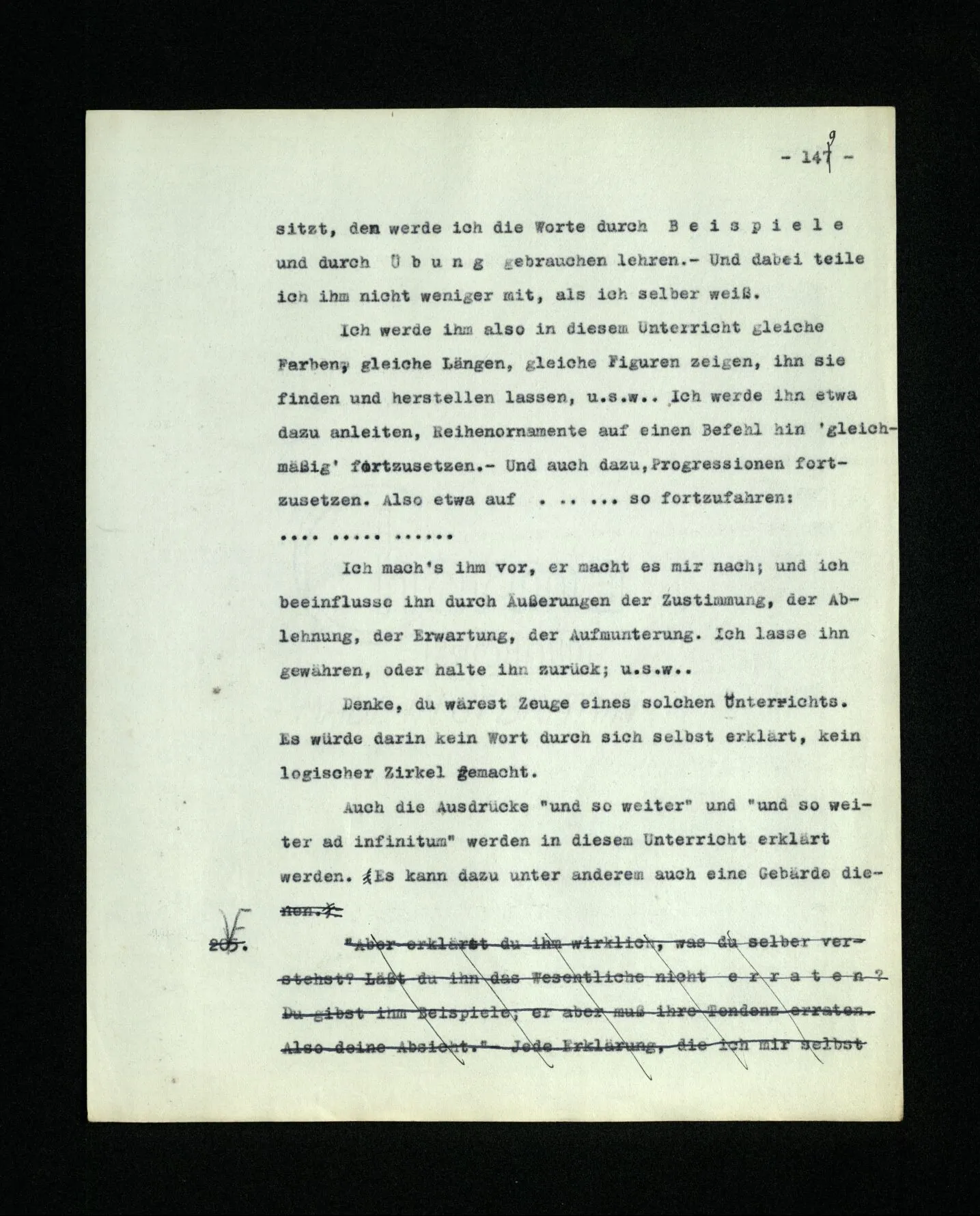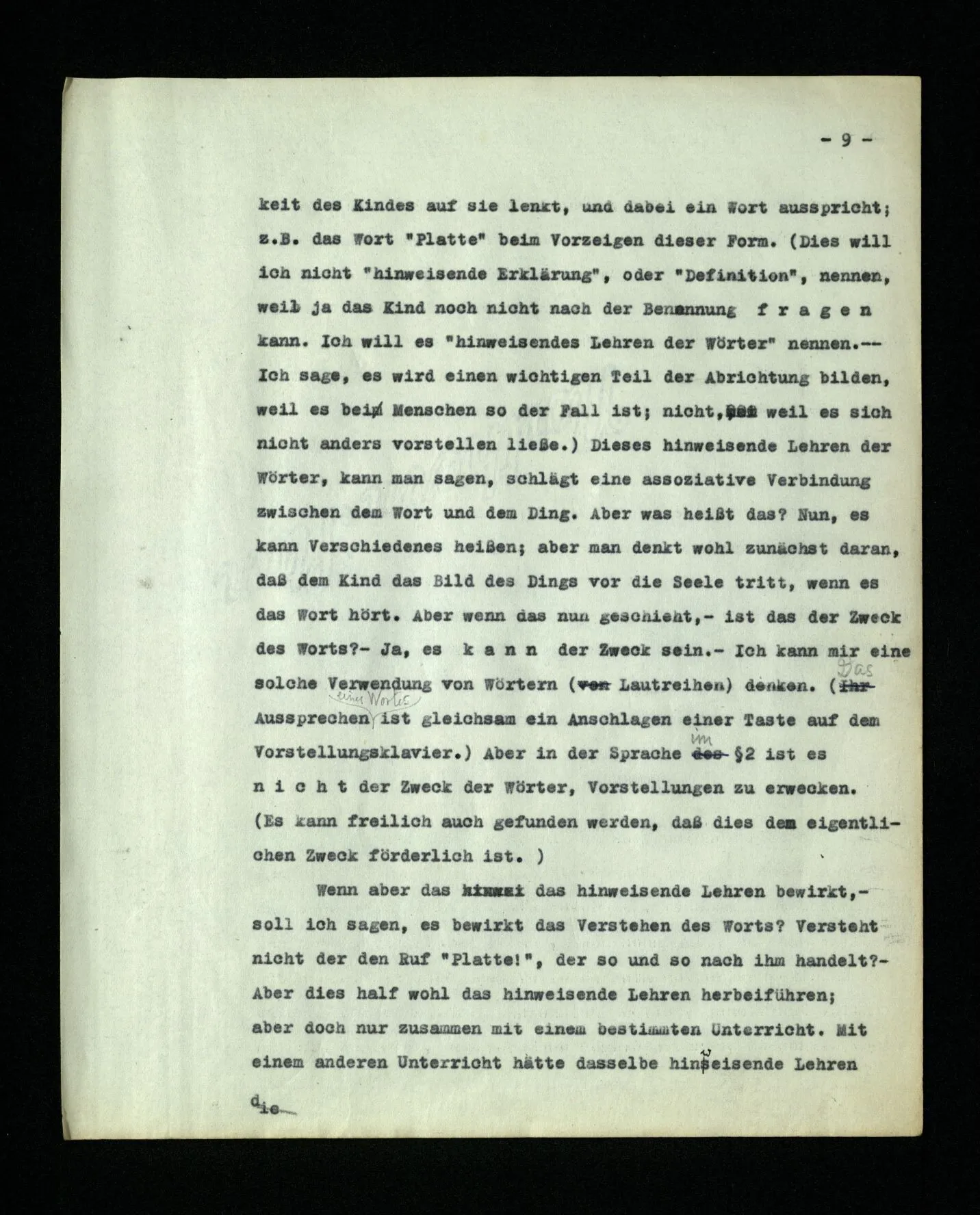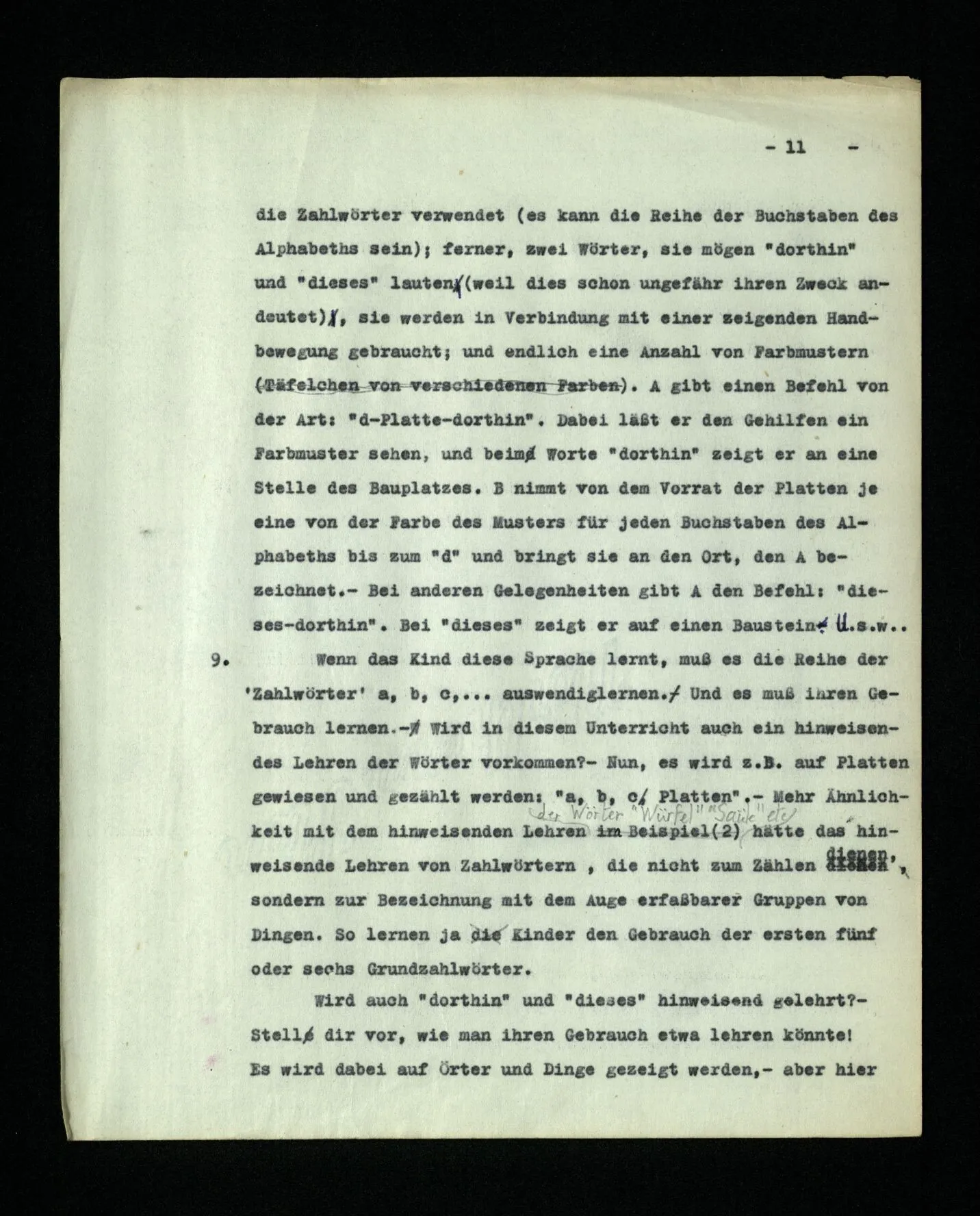9. Wenn das Kind diese Sprache lernt, muß es die Reihe der ‘Zahlwörter’ “a, b, c,…” auswendiglernen. – Und es muß ihren Gebrauch lernen. Wird in diesem Unterricht auch ein hinweisendes Lehren der Wörter vorkommen? – Nun, es wird z.B. auf Platten gewiesen und gezählt werden: “a, b, c, Platten”. – Mehr Ähnlichkeit mit dem hinweisenden Lehren der Wörter “Würfel”, “Säule” etc. hätte das hinweisende Lehren von Zahlwörtern, die nicht zum Zählen dienen, sondern zur Bezeichnung mit dem Auge erfaßbarer Gruppen von Dingen. So lernen ja Kinder den Gebrauch der ersten fünf oder sechs Grundzahlwörter. Wird auch “dorthin” und “dieses” hinweisend gelehrt? – Stell dir vor, wie man ihren Gebrauch etwa lehren könnte! Es wird dabei auf Örter und Dinge gezeigt werden,– aber hier geschieht ja dieses Zeigen auch im Gebrauch der Wörter und nicht nur beim Lernen des Gebrauchs. –