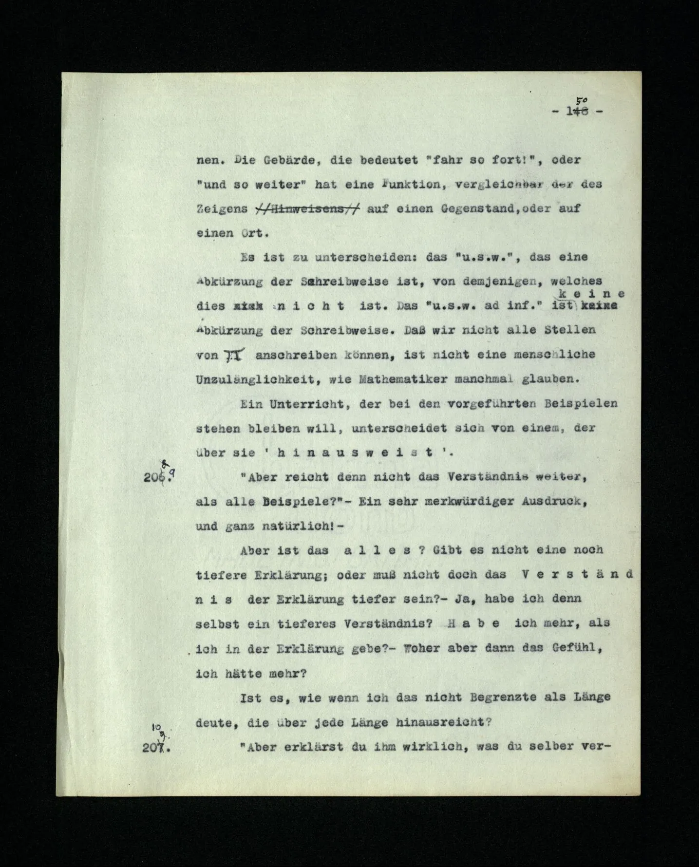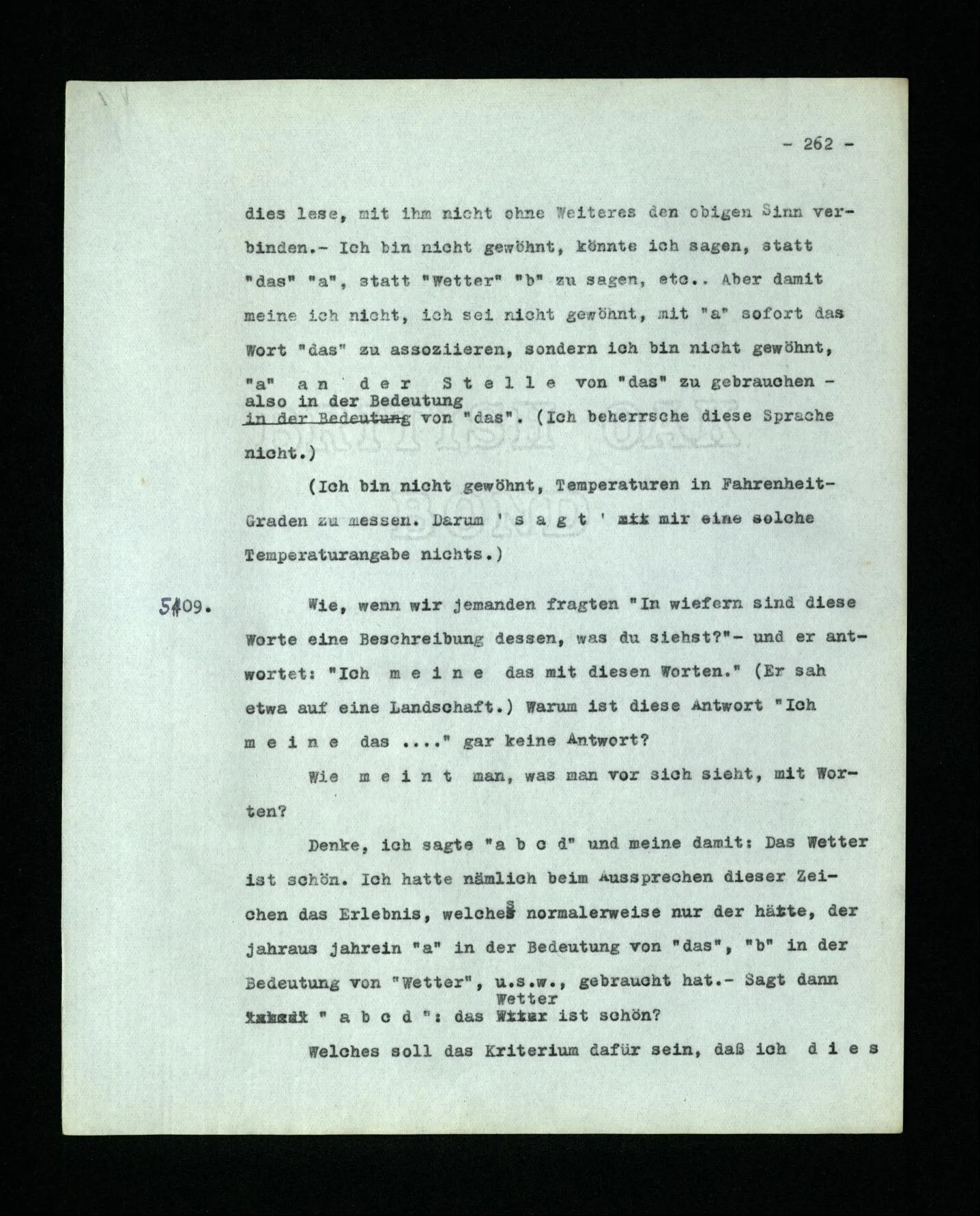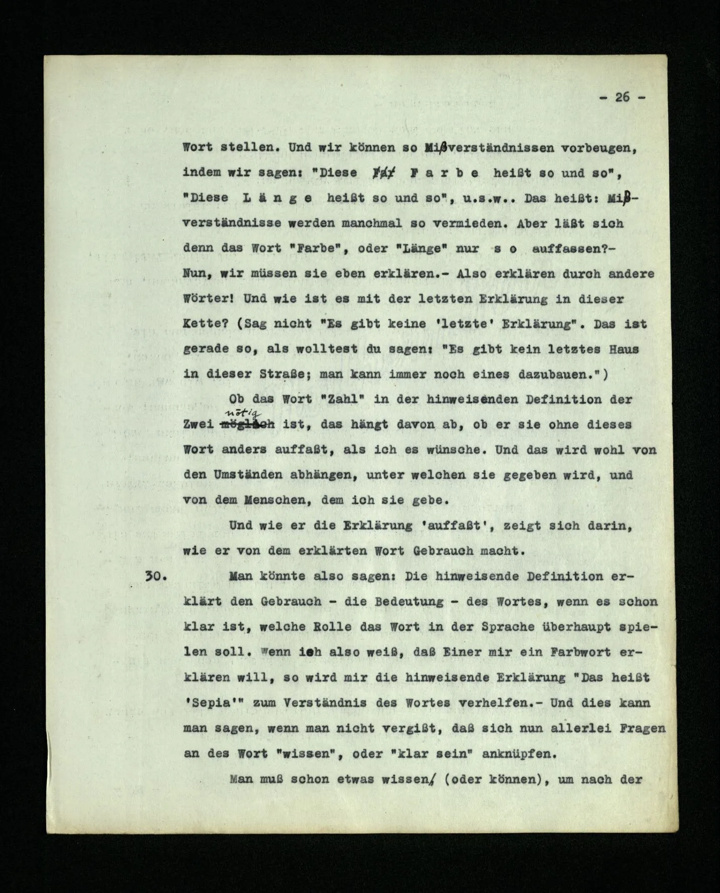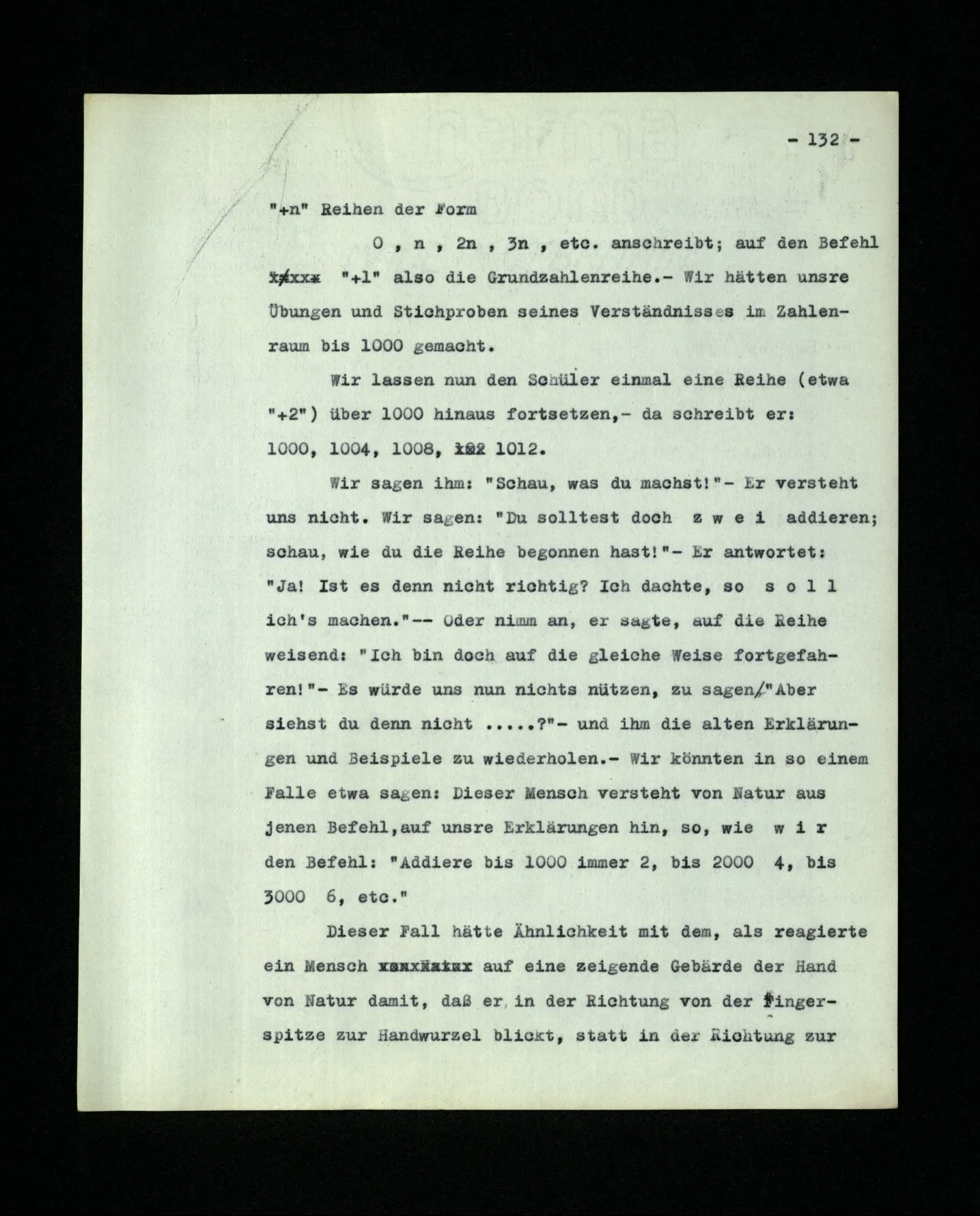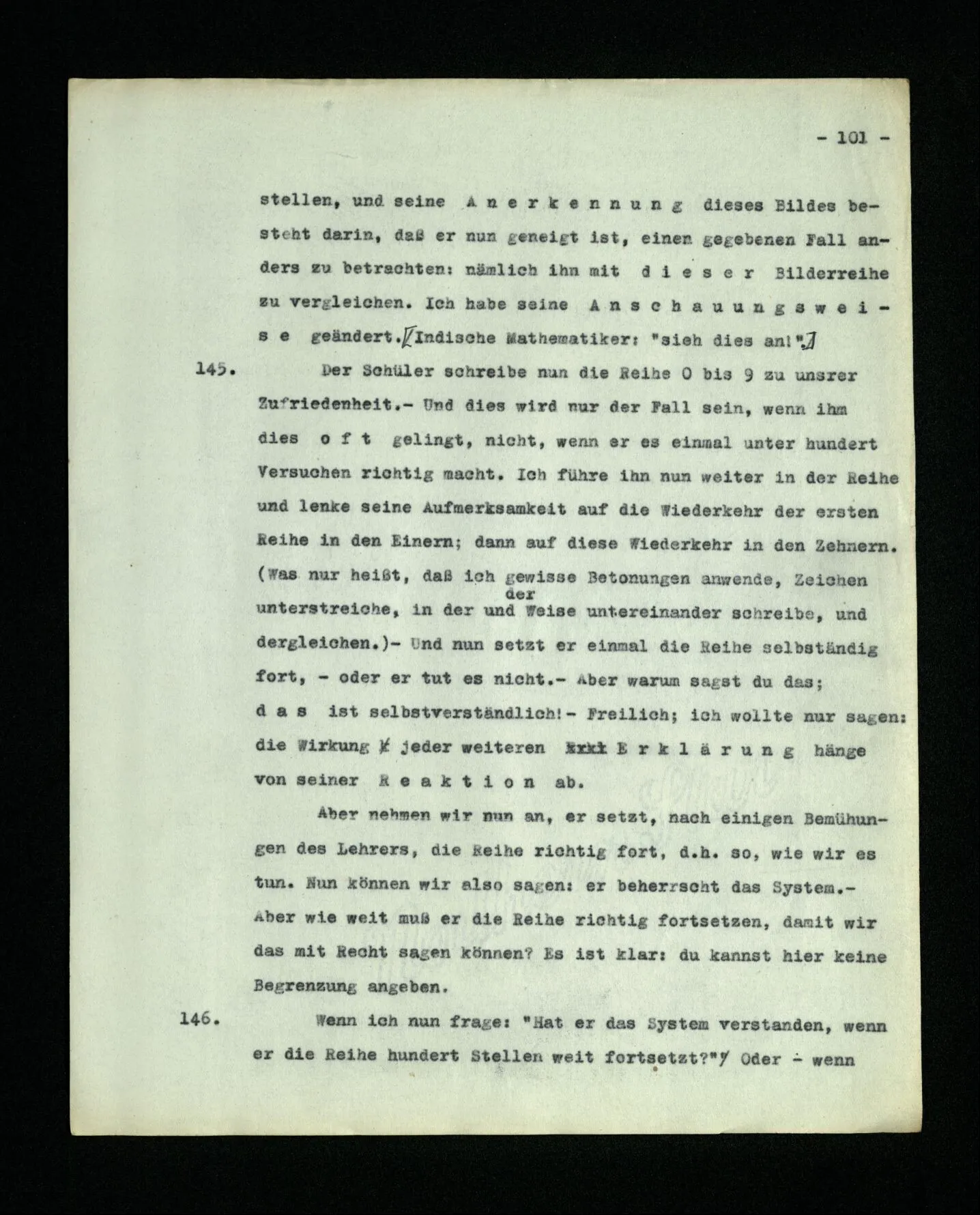 9. Wenn das Kind diese Sprache lernt, muß es die Reihe der ‘Zahlwörter’ “a, b, c,…” auswendiglernen. – Und es muß ihren Gebrauch lernen. Wird in diesem Unterricht auch ein hinweisendes Lehren der Wörter vorkommen? – Nun, es wird z.B. auf Platten gewiesen und gezählt werden: “a, b, c, Platten”. – Mehr Ähnlichkeit mit dem hinweisenden Lehren der Wörter “Würfel”, “Säule” etc. hätte das hinweisende Lehren von Zahlwörtern, die nicht zum Zählen dienen, sondern zur Bezeichnung mit dem Auge erfaßbarer Gruppen von Dingen. So lernen ja Kinder den Gebrauch der ersten fünf oder sechs Grundzahlwörter. Wird auch “dorthin” und “dieses” hinweisend gelehrt? – Stell dir vor, wie man ihren Gebrauch etwa lehren könnte! Es wird dabei auf Örter und Dinge gezeigt werden,– aber hier geschieht ja dieses Zeigen auch im Gebrauch der Wörter und nicht nur beim Lernen des Gebrauchs. –