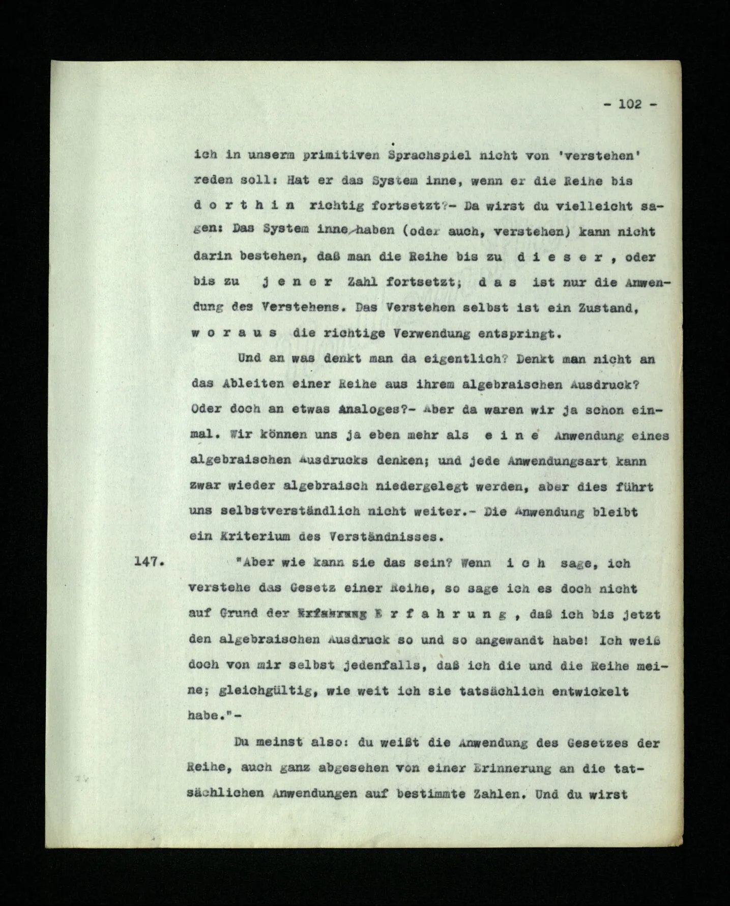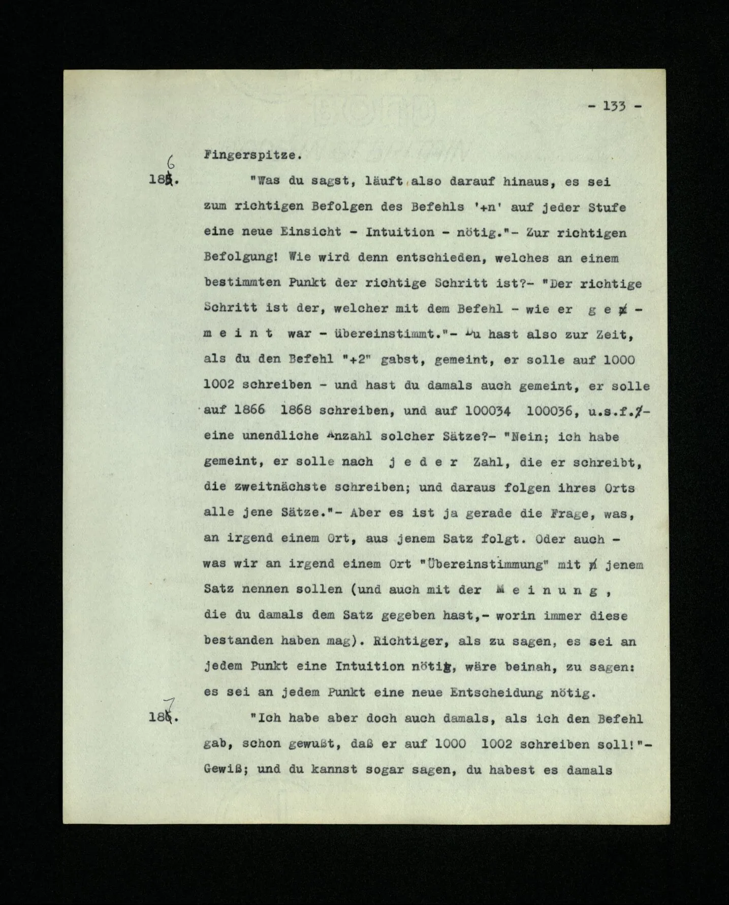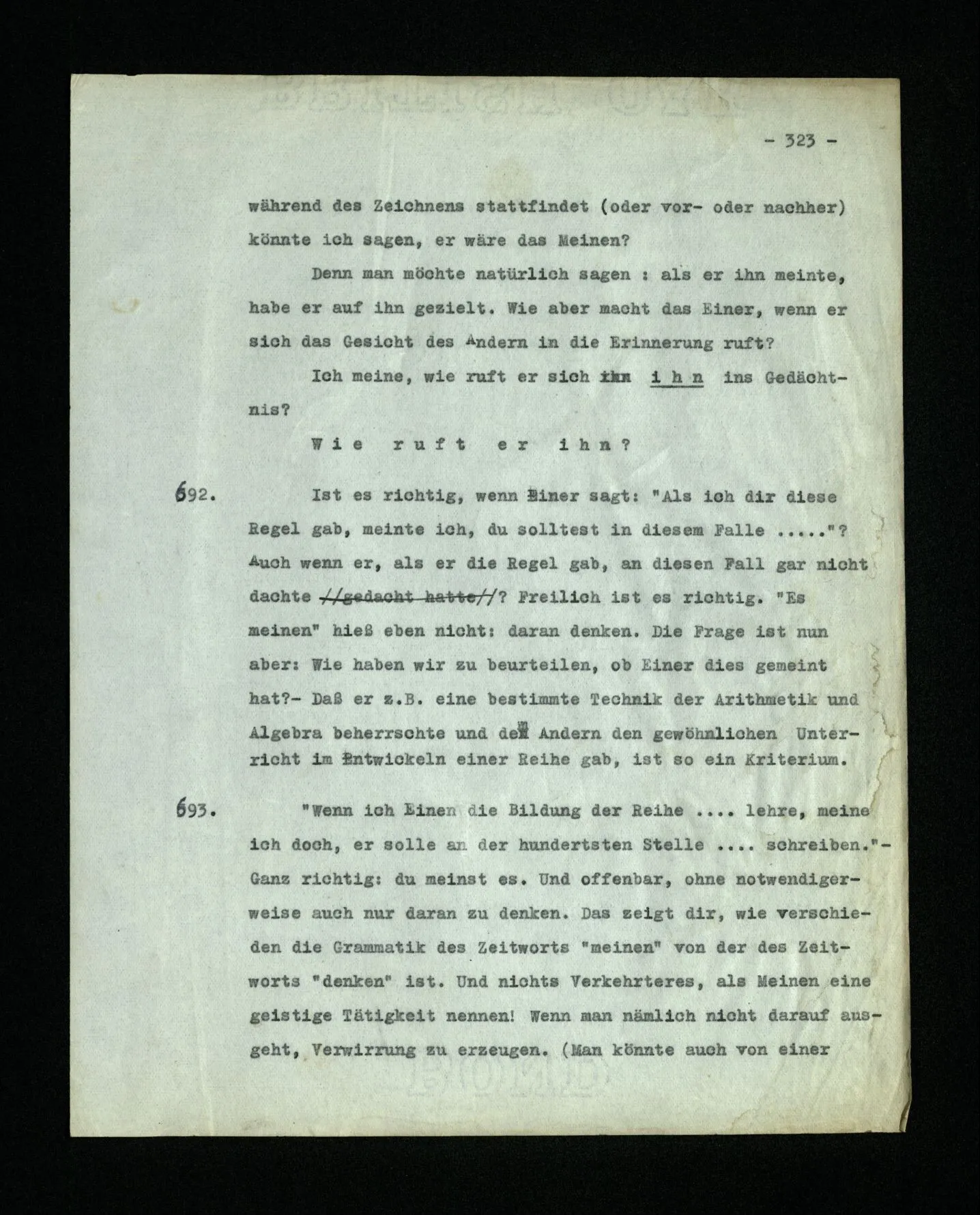 692. Ist es richtig, wenn Einer sagt: “Als ich dir diese Regel gab, meinte ich, du solltest in diesem Falle …”? Auch wenn er, als er die Regel gab, an diesen Fall gar nicht dachte? Freilich ist es richtig. “Es meinen” hieß eben nicht: daran denken. Die Frage ist nun aber: Wie haben wir zu beurteilen, ob Einer dies gemeint hat? – Daß er z.B. eine bestimmte Technik der Arithmetik und Algebra beherrschte und dem Andern den gewöhnlichen Unterricht im Entwickeln einer Reihe gab, ist so ein Kriterium.