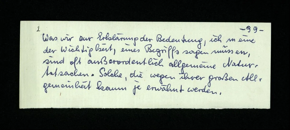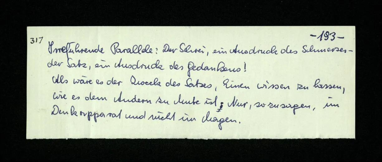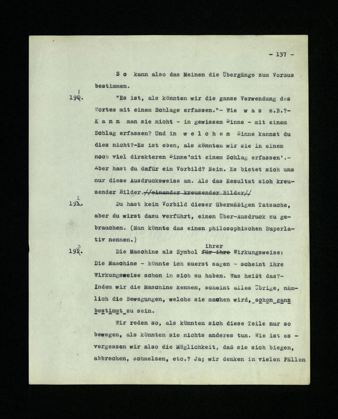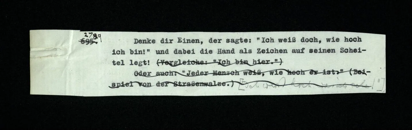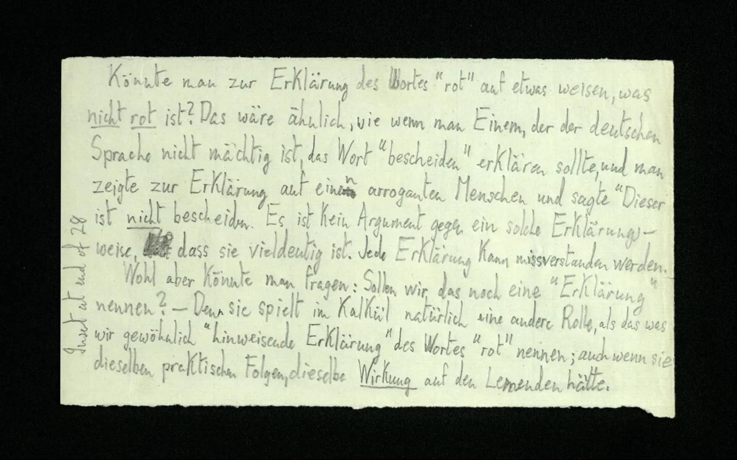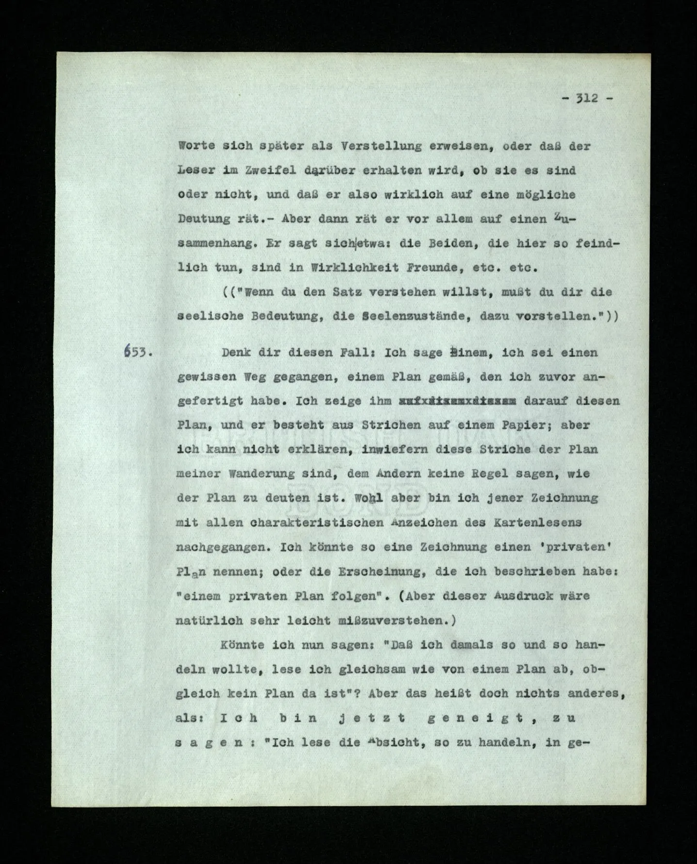 652. “Er maß ihn mit feindseligem Blick und sagte …” Der Leser der Erzählung versteht dies; er hat keinen Zweifel in seiner Seele. Nun sagst du: “Wohl, er denkt sich die Bedeutung hinzu, er errät sie.” – Im allgemeinen: Nein. Im allgemeinen denkt er sich nichts hinzu, errät nichts. – Es ist aber auch möglich, daß der feindselige Blick und die Worte sich später als Verstellung erweisen, oder daß der Leser im Zweifel darüber erhalten wird, ob sie es sind oder nicht, und daß er also wirklich auf eine mögliche Deutung rät. – Aber dann rät er vor allem auf einen Zusammenhang. Er sagt sich etwa: die Beiden, die hier so feindlich tun, sind in Wirklichkeit Freunde, etc. etc. ((“Wenn du den Satz verstehen willst, mußt du dir die seelische Bedeutung, die Seelenzustände, dazu vorstellen.”))