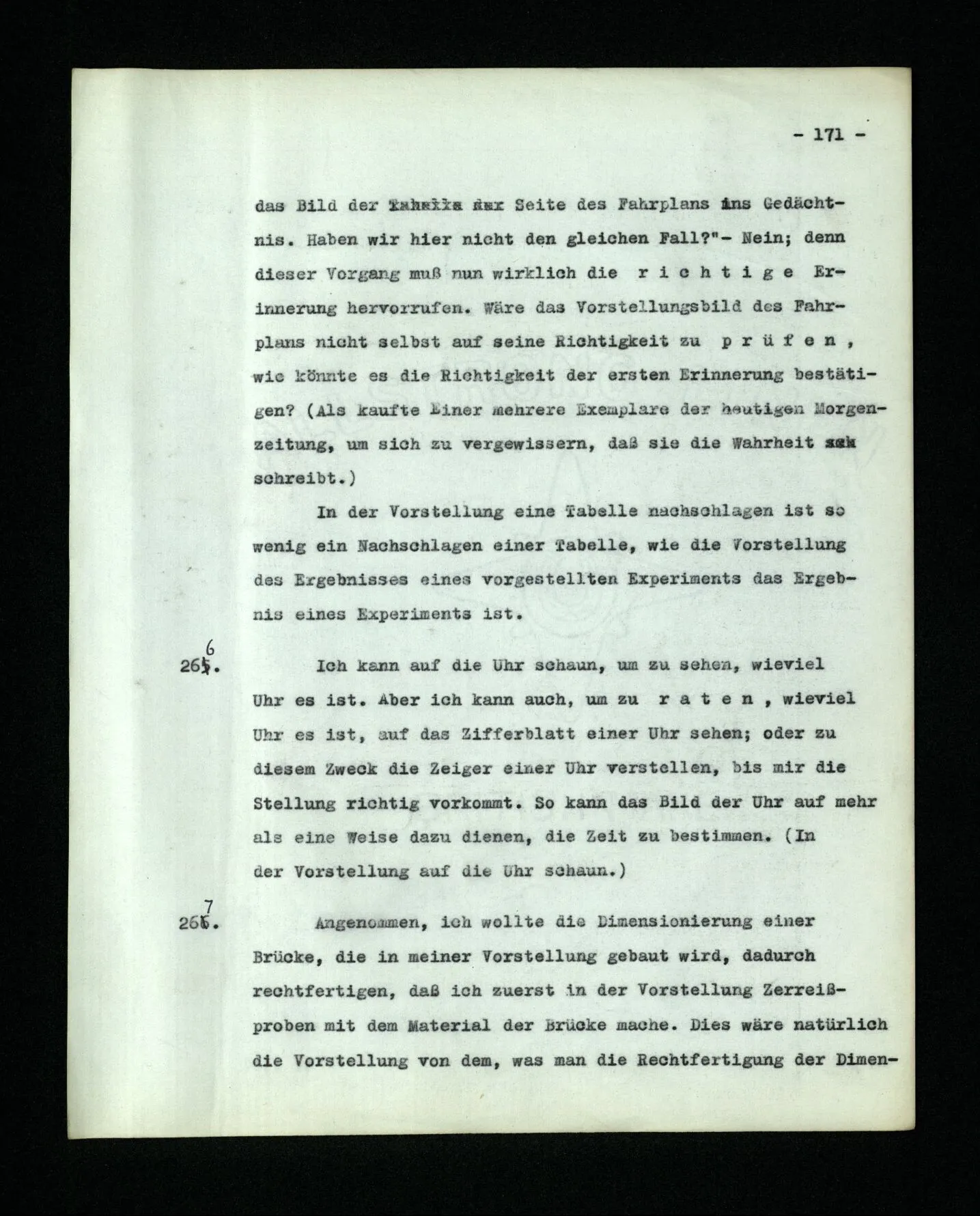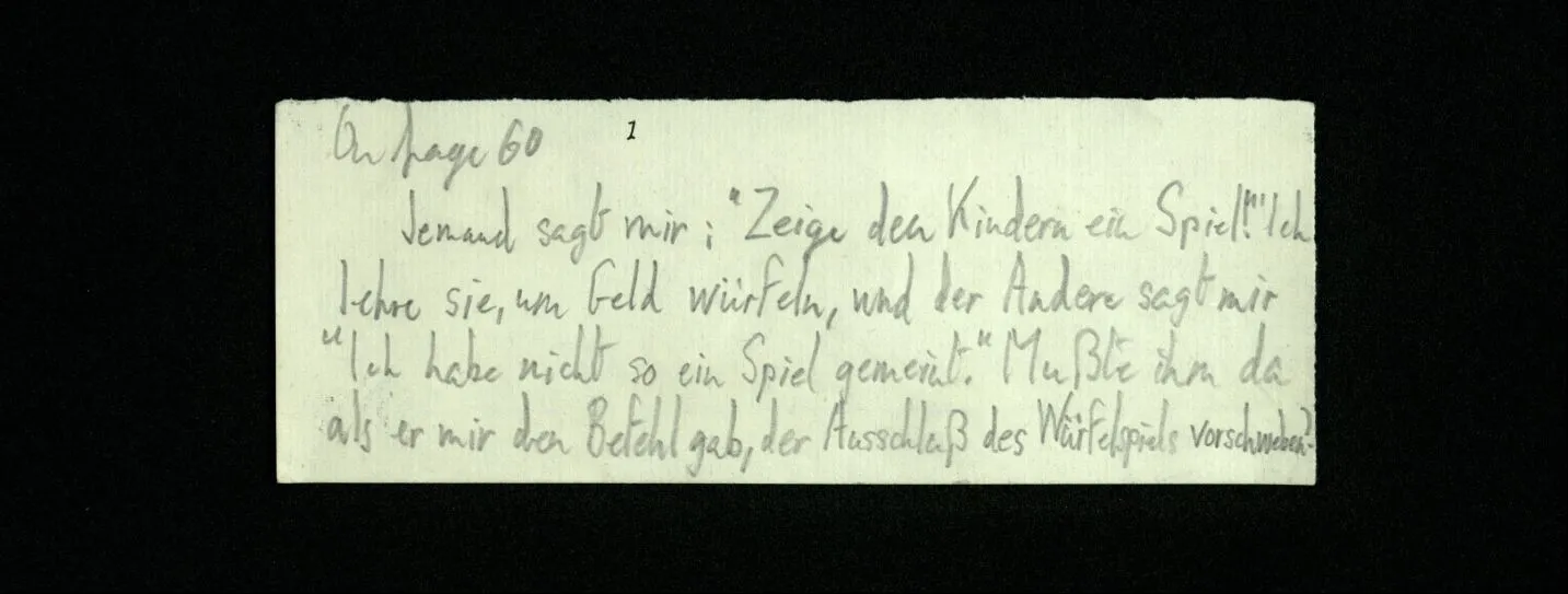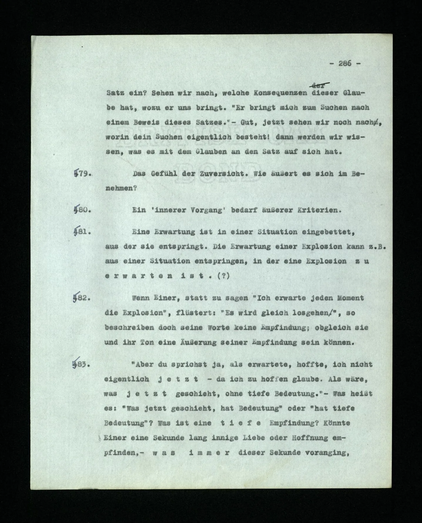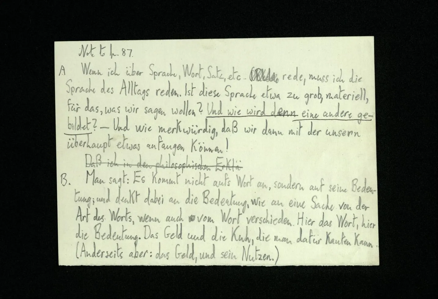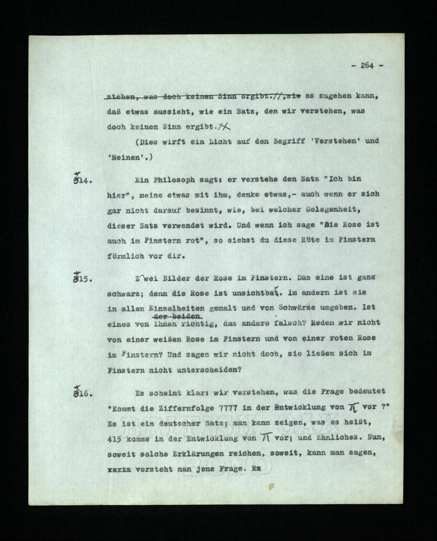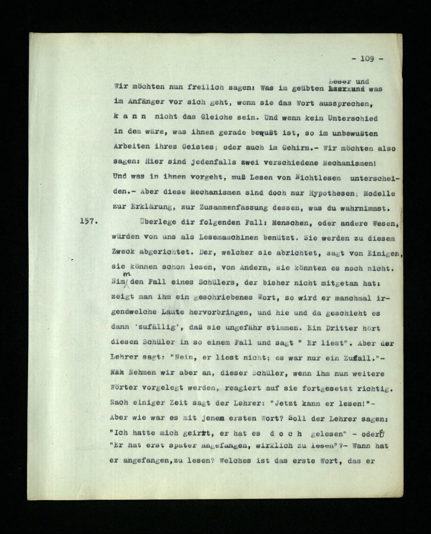 652. “Er maß ihn mit feindseligem Blick und sagte …” Der Leser der Erzählung versteht dies; er hat keinen Zweifel in seiner Seele. Nun sagst du: “Wohl, er denkt sich die Bedeutung hinzu, er errät sie.” – Im allgemeinen: Nein. Im allgemeinen denkt er sich nichts hinzu, errät nichts. – Es ist aber auch möglich, daß der feindselige Blick und die Worte sich später als Verstellung erweisen, oder daß der Leser im Zweifel darüber erhalten wird, ob sie es sind oder nicht, und daß er also wirklich auf eine mögliche Deutung rät. – Aber dann rät er vor allem auf einen Zusammenhang. Er sagt sich etwa: die Beiden, die hier so feindlich tun, sind in Wirklichkeit Freunde, etc. etc. ((“Wenn du den Satz verstehen willst, mußt du dir die seelische Bedeutung, die Seelenzustände, dazu vorstellen.”))