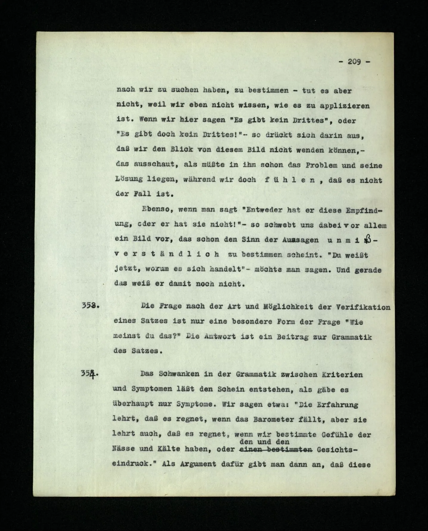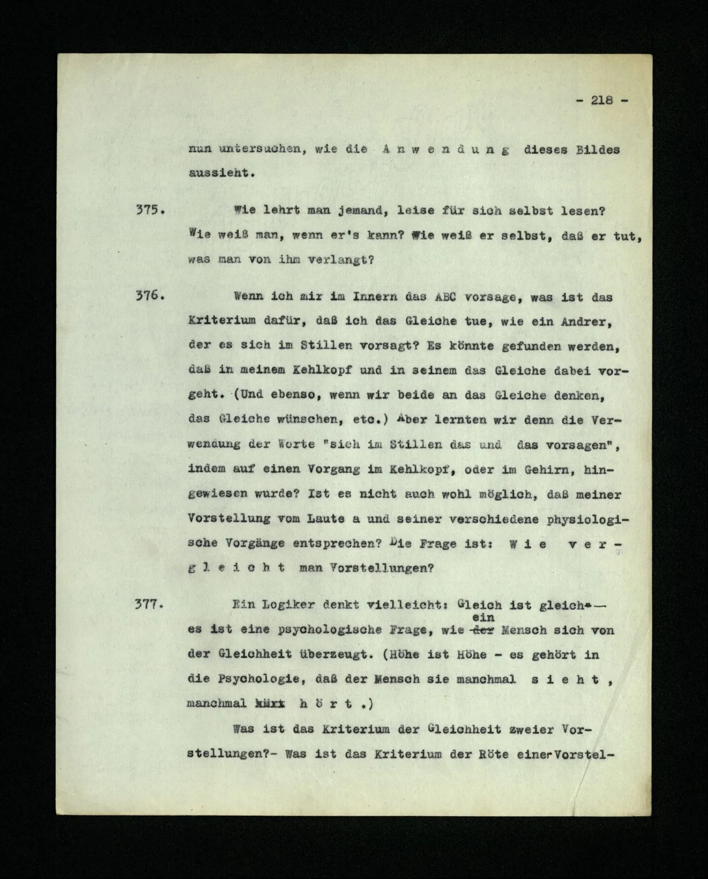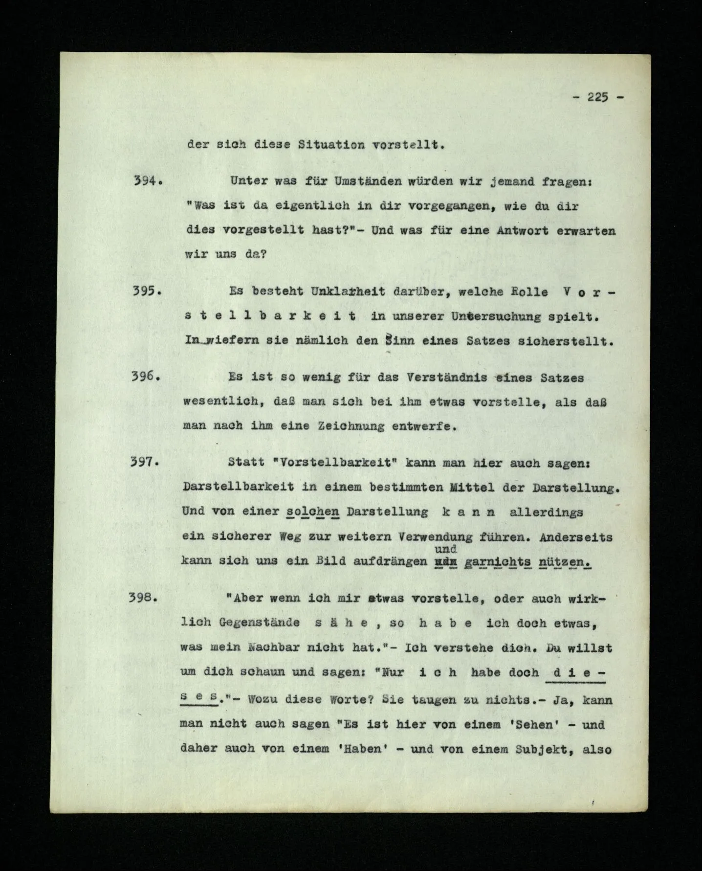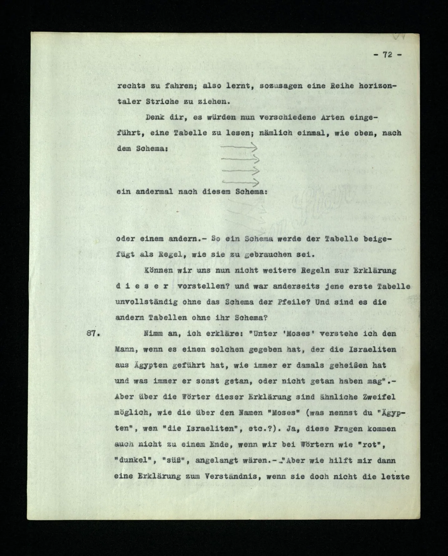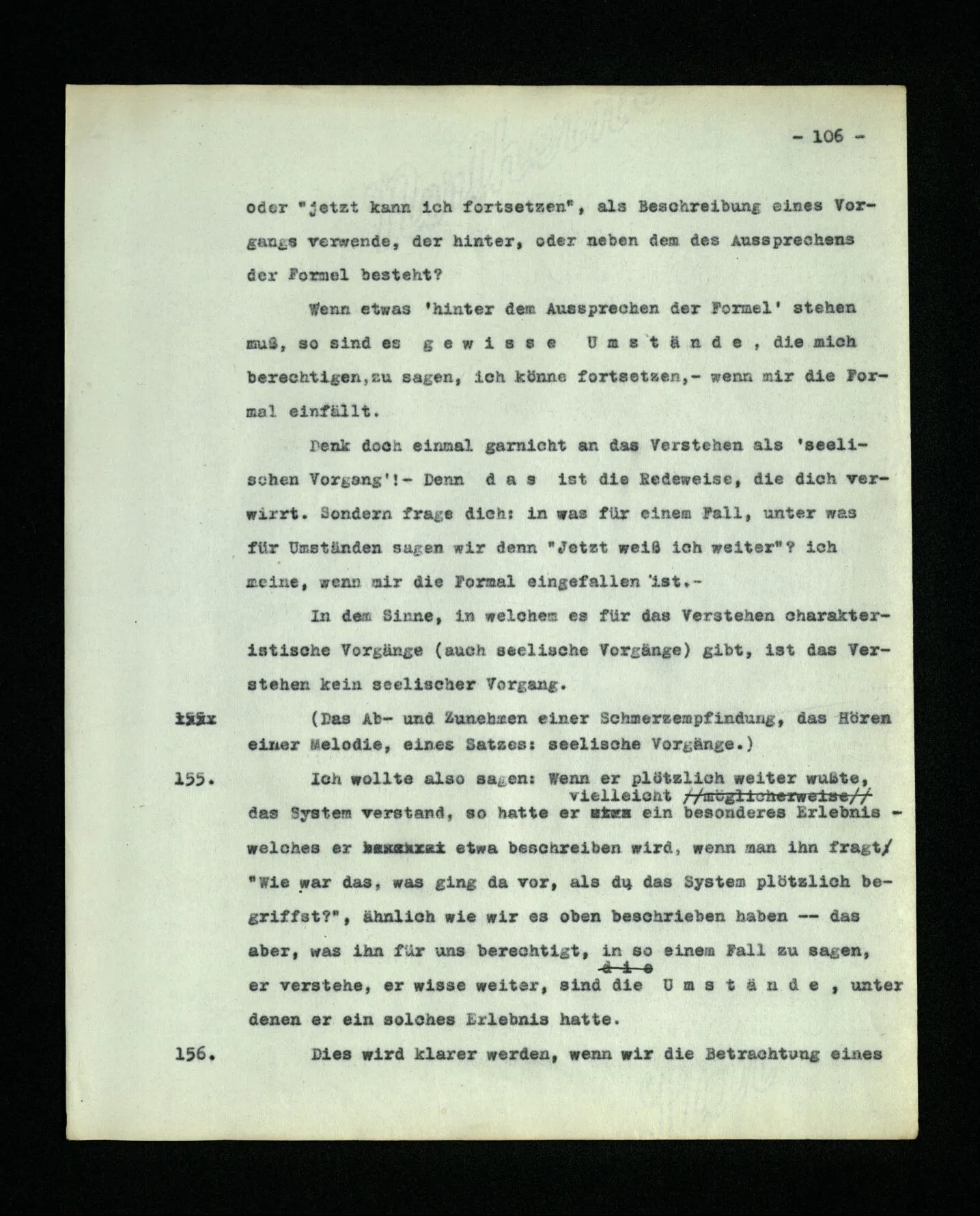 652. “Er maß ihn mit feindseligem Blick und sagte …” Der Leser der Erzählung versteht dies; er hat keinen Zweifel in seiner Seele. Nun sagst du: “Wohl, er denkt sich die Bedeutung hinzu, er errät sie.” – Im allgemeinen: Nein. Im allgemeinen denkt er sich nichts hinzu, errät nichts. – Es ist aber auch möglich, daß der feindselige Blick und die Worte sich später als Verstellung erweisen, oder daß der Leser im Zweifel darüber erhalten wird, ob sie es sind oder nicht, und daß er also wirklich auf eine mögliche Deutung rät. – Aber dann rät er vor allem auf einen Zusammenhang. Er sagt sich etwa: die Beiden, die hier so feindlich tun, sind in Wirklichkeit Freunde, etc. etc. ((“Wenn du den Satz verstehen willst, mußt du dir die seelische Bedeutung, die Seelenzustände, dazu vorstellen.”))