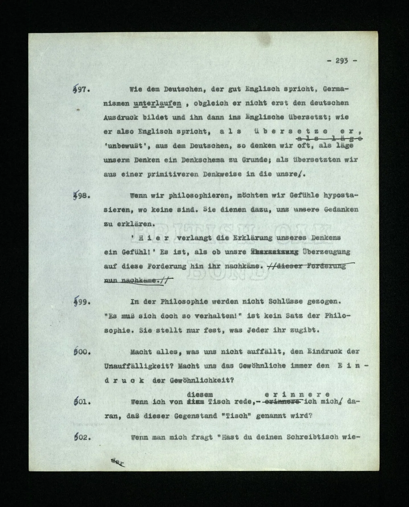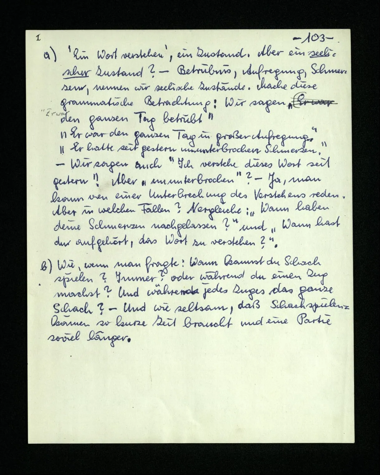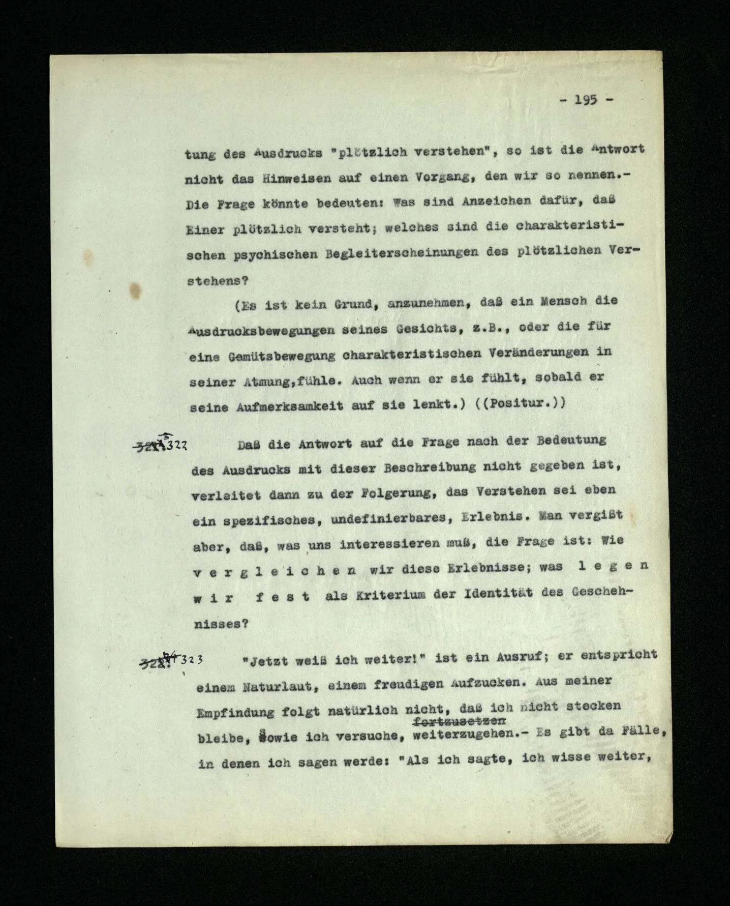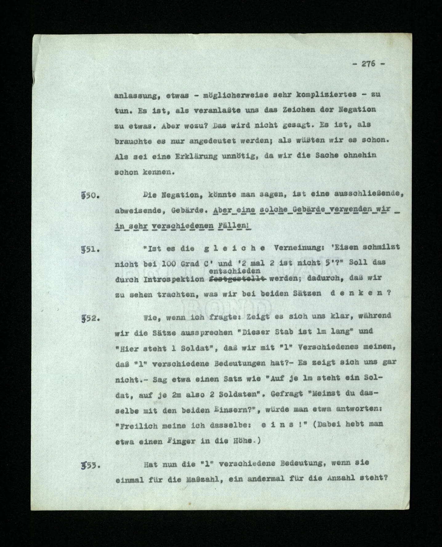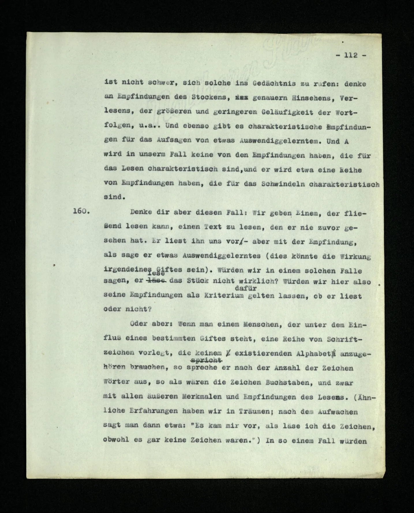 652. “Er maß ihn mit feindseligem Blick und sagte …” Der Leser der Erzählung versteht dies; er hat keinen Zweifel in seiner Seele. Nun sagst du: “Wohl, er denkt sich die Bedeutung hinzu, er errät sie.” – Im allgemeinen: Nein. Im allgemeinen denkt er sich nichts hinzu, errät nichts. – Es ist aber auch möglich, daß der feindselige Blick und die Worte sich später als Verstellung erweisen, oder daß der Leser im Zweifel darüber erhalten wird, ob sie es sind oder nicht, und daß er also wirklich auf eine mögliche Deutung rät. – Aber dann rät er vor allem auf einen Zusammenhang. Er sagt sich etwa: die Beiden, die hier so feindlich tun, sind in Wirklichkeit Freunde, etc. etc. ((“Wenn du den Satz verstehen willst, mußt du dir die seelische Bedeutung, die Seelenzustände, dazu vorstellen.”))