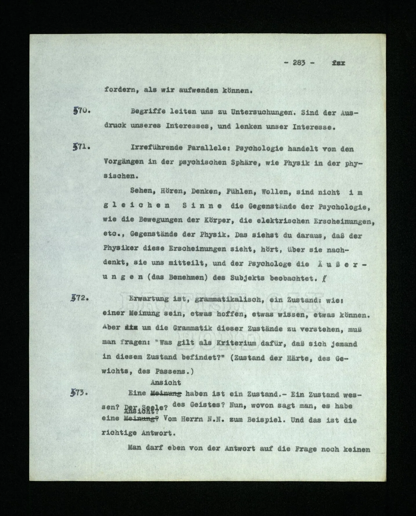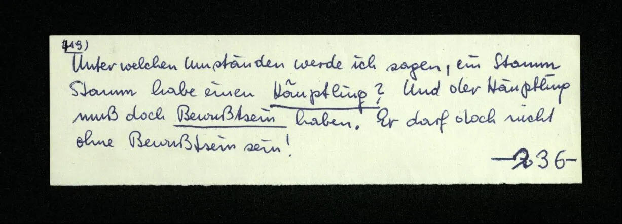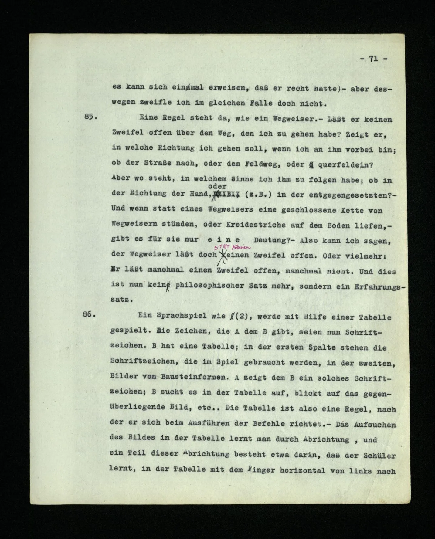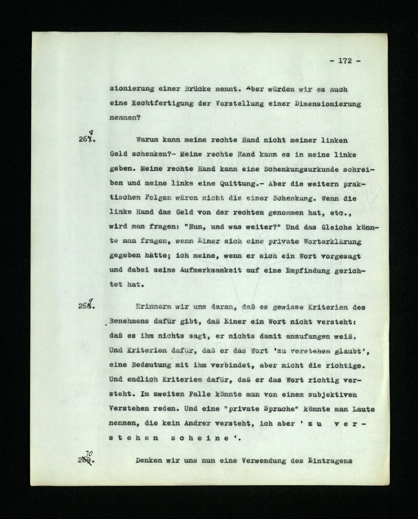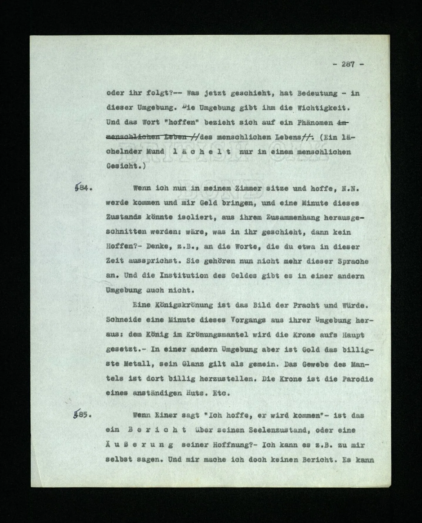 652. “Er maß ihn mit feindseligem Blick und sagte …” Der Leser der Erzählung versteht dies; er hat keinen Zweifel in seiner Seele. Nun sagst du: “Wohl, er denkt sich die Bedeutung hinzu, er errät sie.” – Im allgemeinen: Nein. Im allgemeinen denkt er sich nichts hinzu, errät nichts. – Es ist aber auch möglich, daß der feindselige Blick und die Worte sich später als Verstellung erweisen, oder daß der Leser im Zweifel darüber erhalten wird, ob sie es sind oder nicht, und daß er also wirklich auf eine mögliche Deutung rät. – Aber dann rät er vor allem auf einen Zusammenhang. Er sagt sich etwa: die Beiden, die hier so feindlich tun, sind in Wirklichkeit Freunde, etc. etc. ((“Wenn du den Satz verstehen willst, mußt du dir die seelische Bedeutung, die Seelenzustände, dazu vorstellen.”))