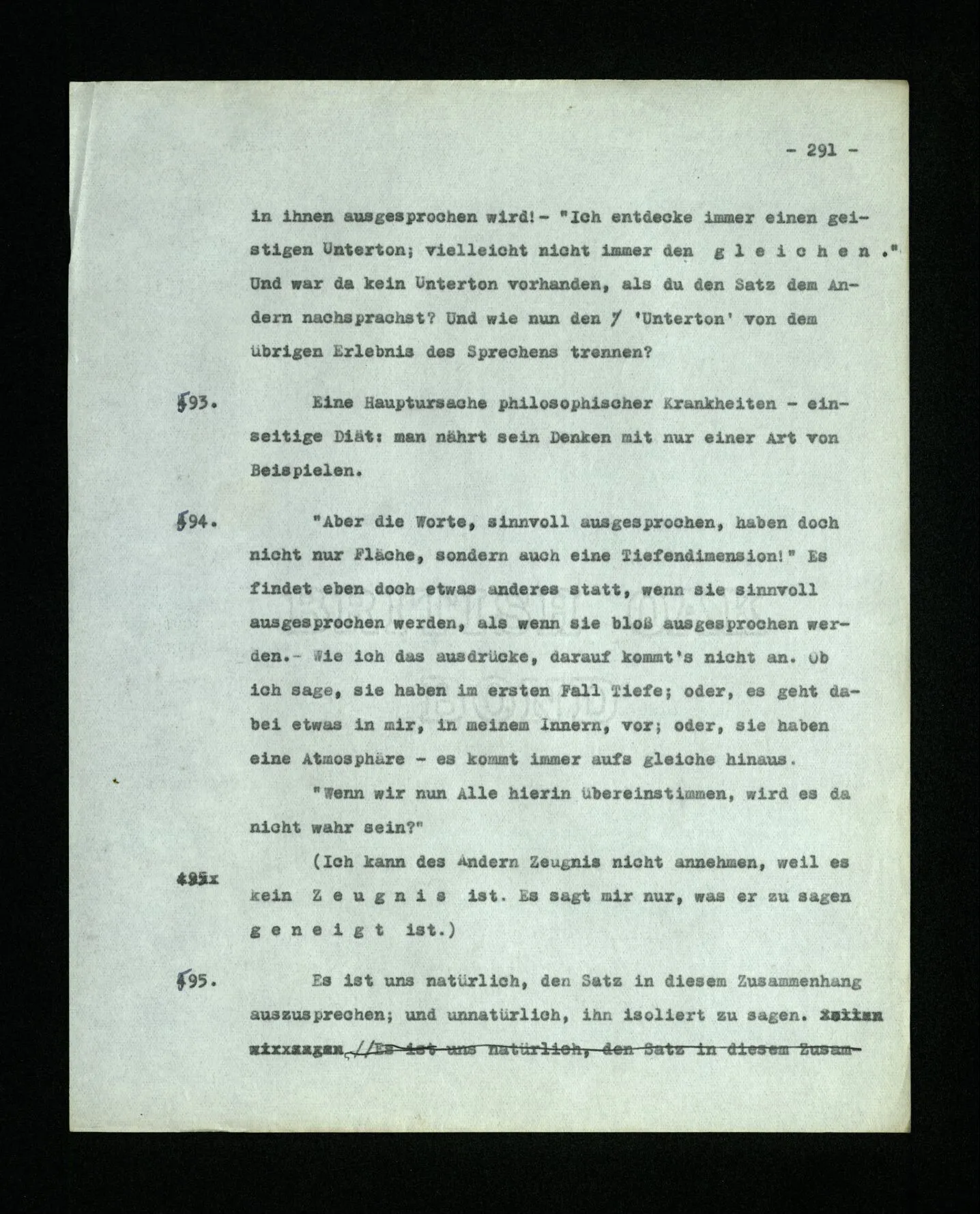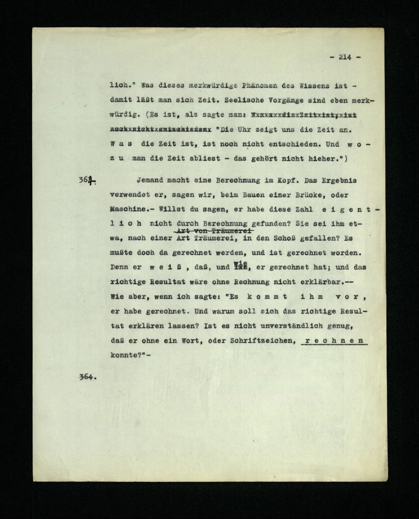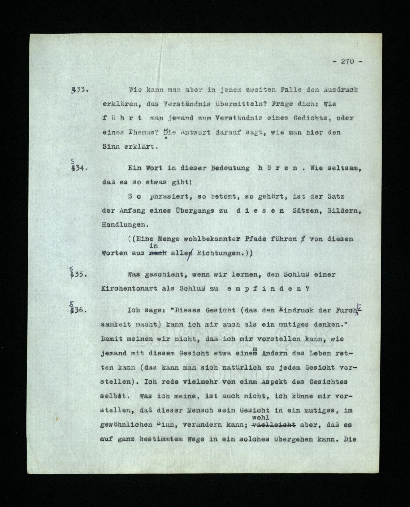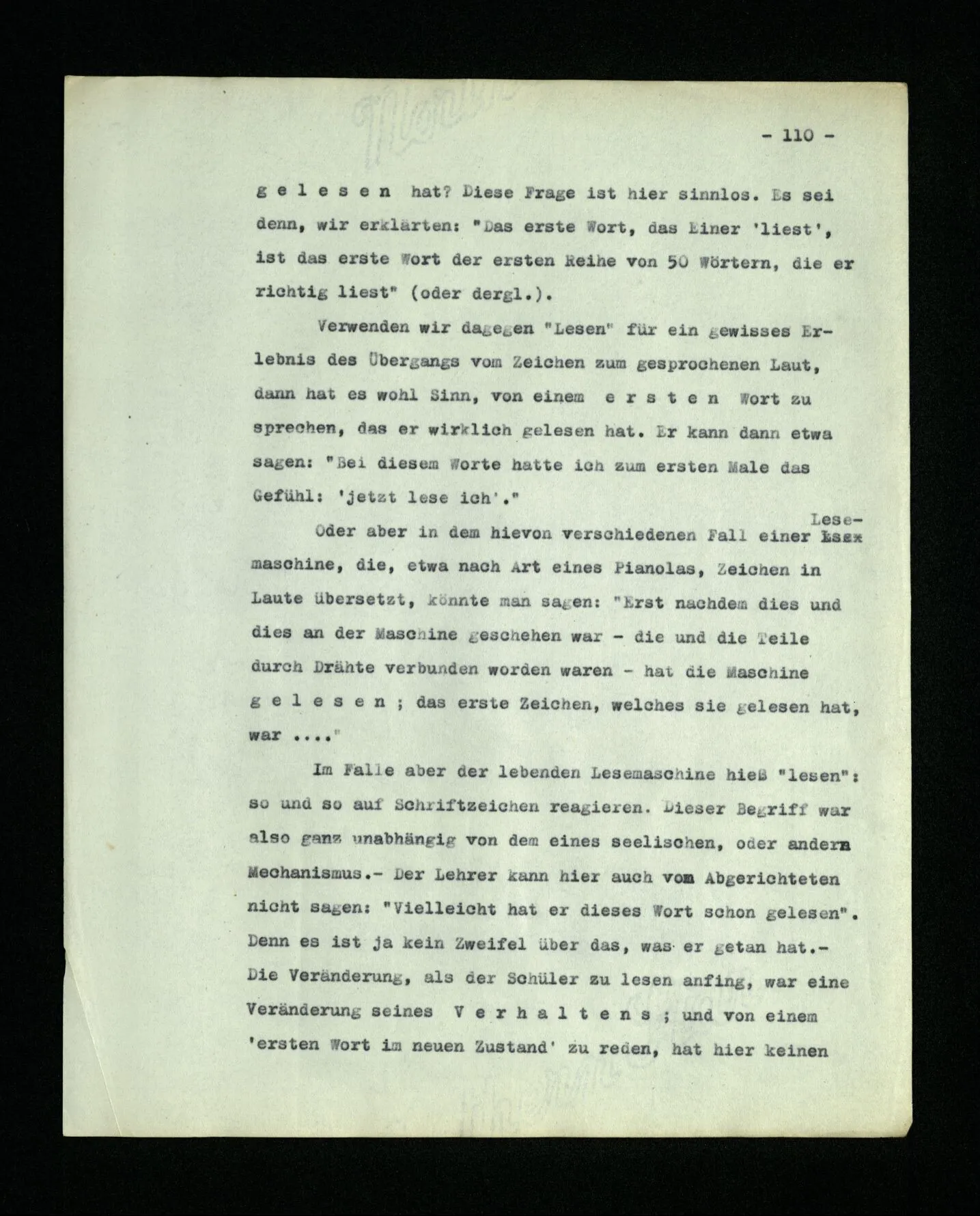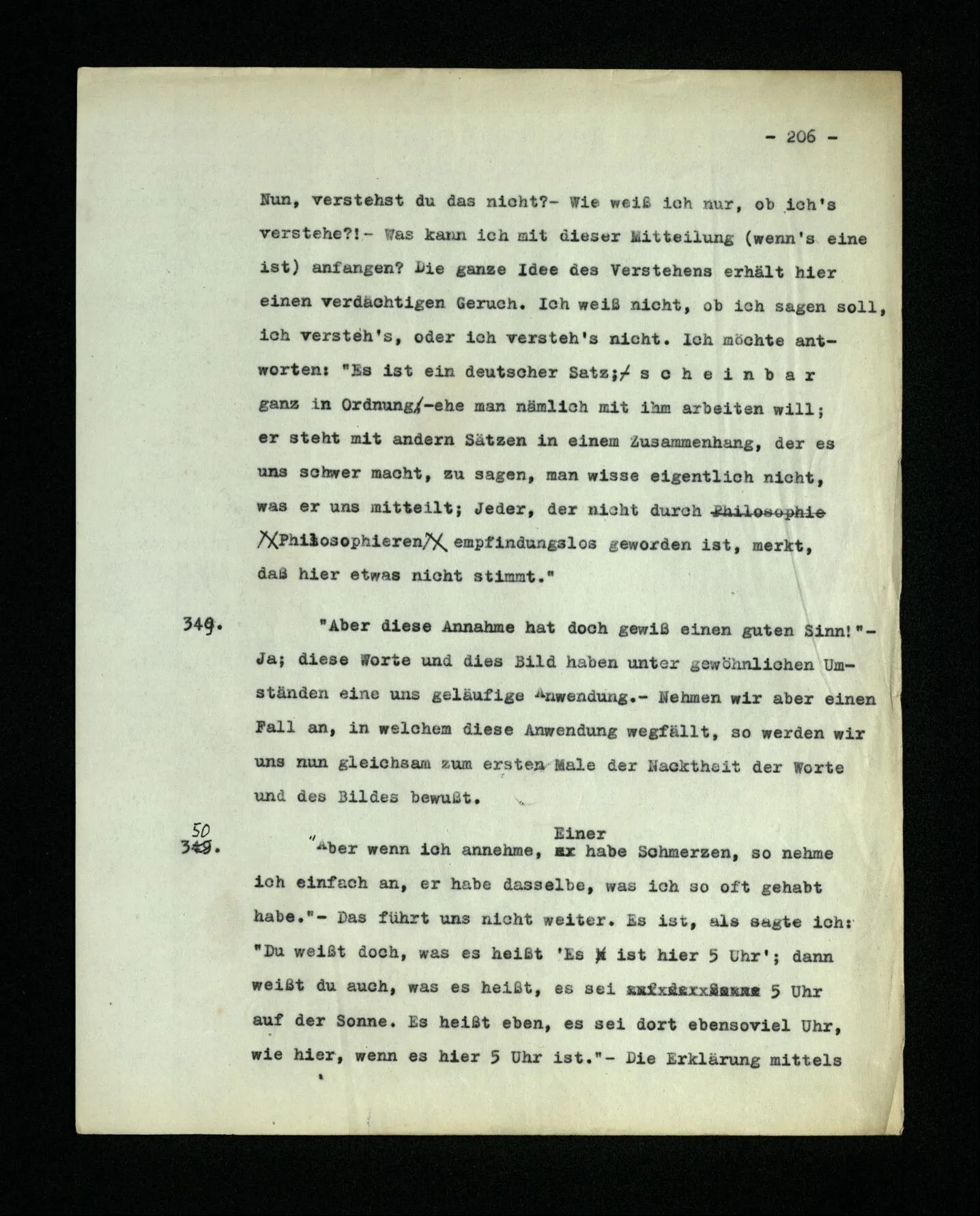 652. “Er maß ihn mit feindseligem Blick und sagte …” Der Leser der Erzählung versteht dies; er hat keinen Zweifel in seiner Seele. Nun sagst du: “Wohl, er denkt sich die Bedeutung hinzu, er errät sie.” – Im allgemeinen: Nein. Im allgemeinen denkt er sich nichts hinzu, errät nichts. – Es ist aber auch möglich, daß der feindselige Blick und die Worte sich später als Verstellung erweisen, oder daß der Leser im Zweifel darüber erhalten wird, ob sie es sind oder nicht, und daß er also wirklich auf eine mögliche Deutung rät. – Aber dann rät er vor allem auf einen Zusammenhang. Er sagt sich etwa: die Beiden, die hier so feindlich tun, sind in Wirklichkeit Freunde, etc. etc. ((“Wenn du den Satz verstehen willst, mußt du dir die seelische Bedeutung, die Seelenzustände, dazu vorstellen.”))