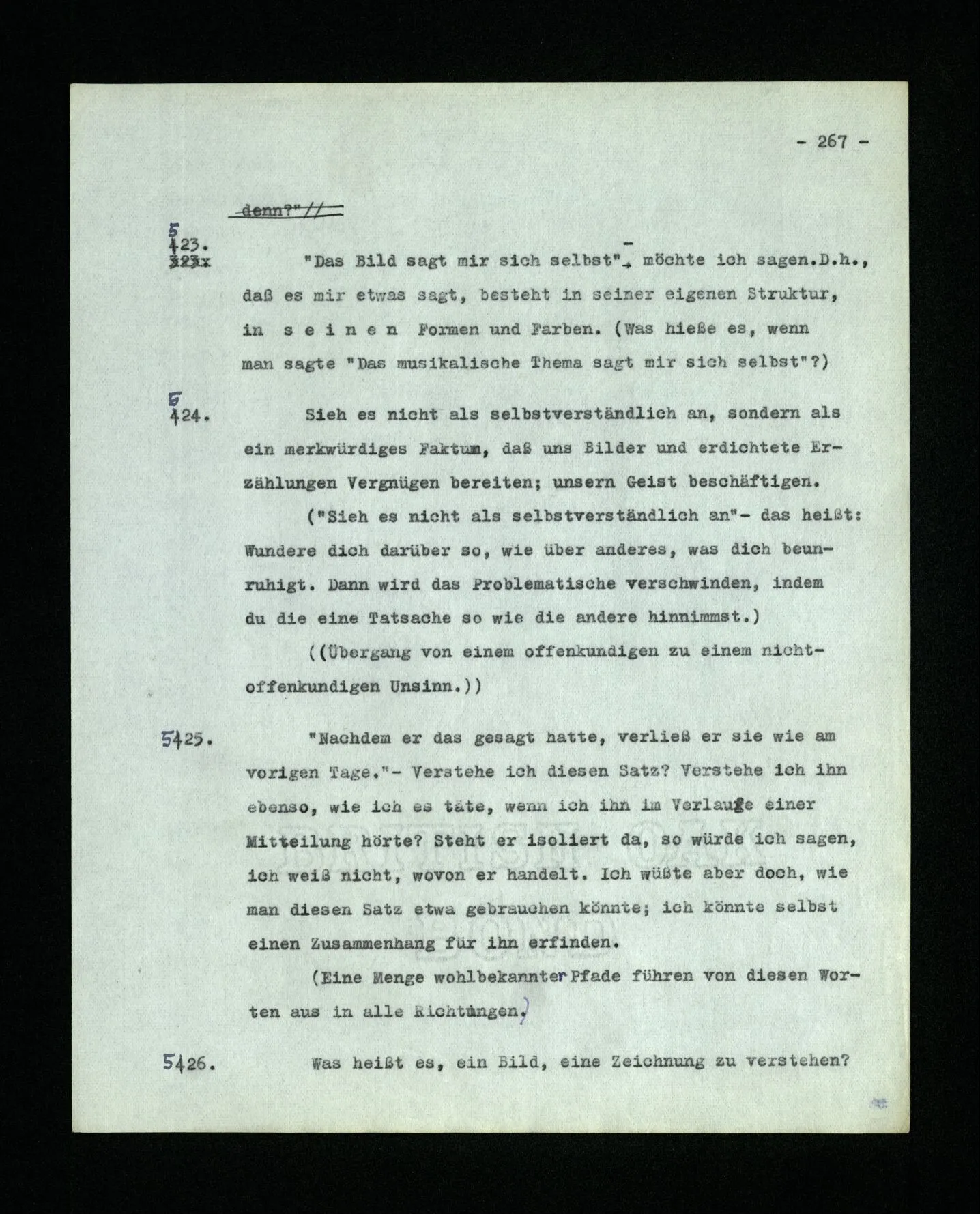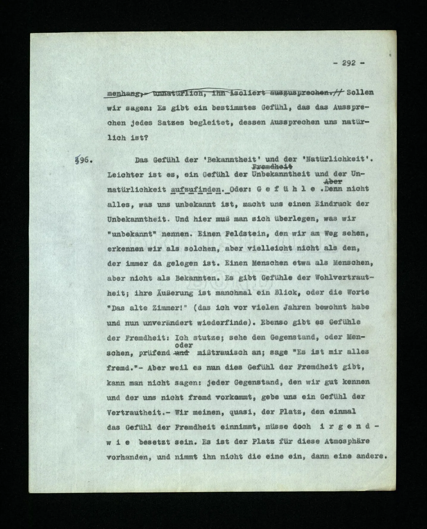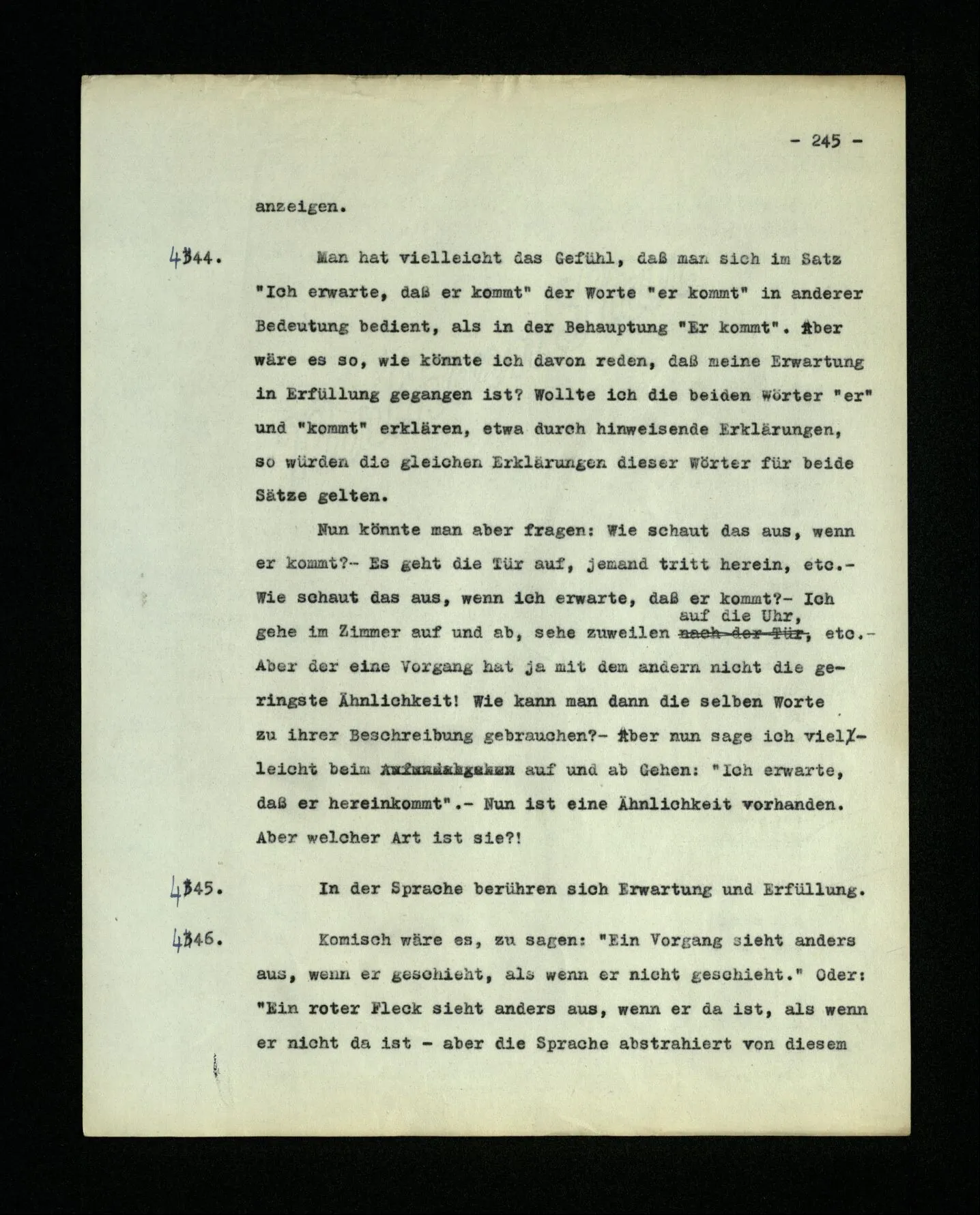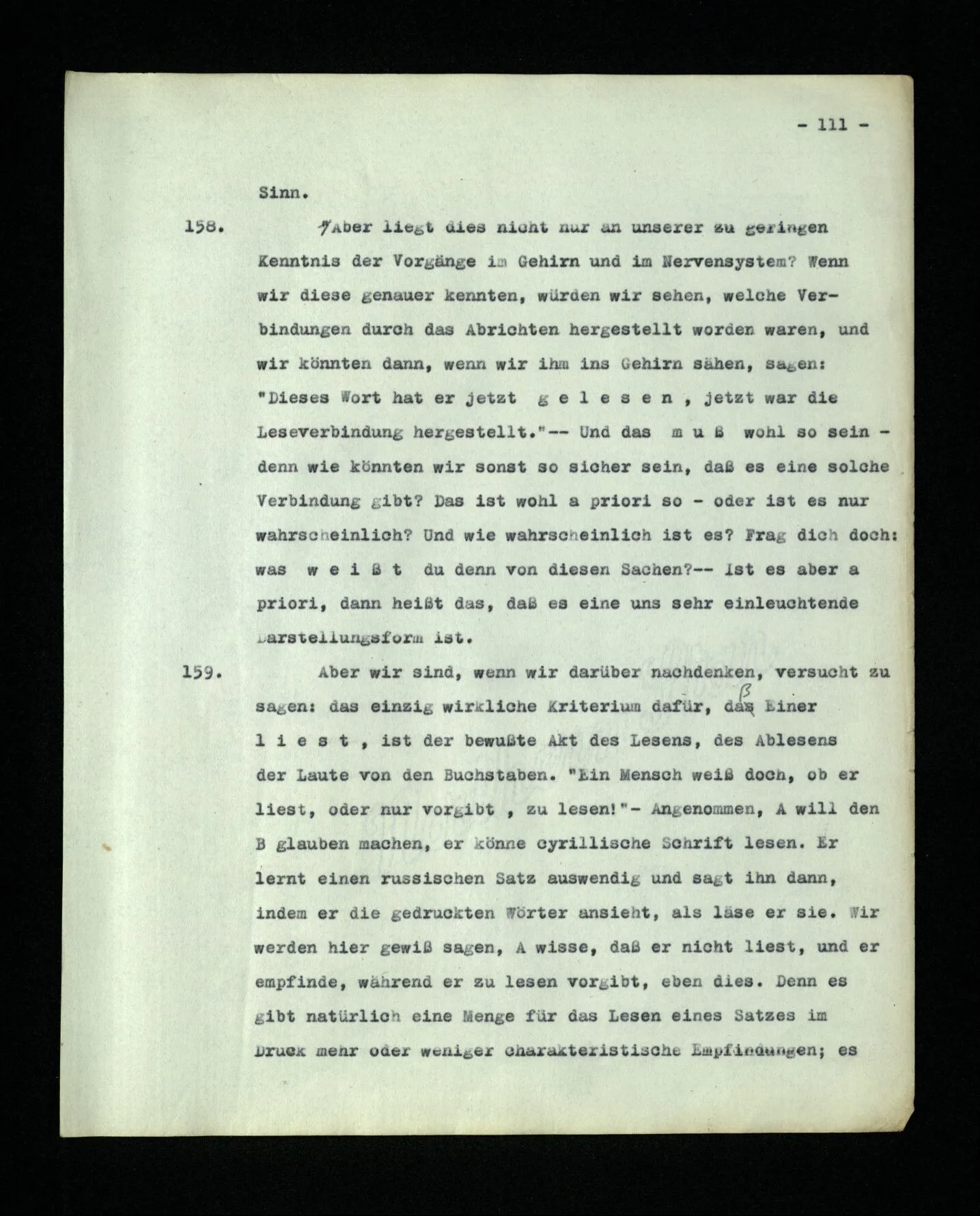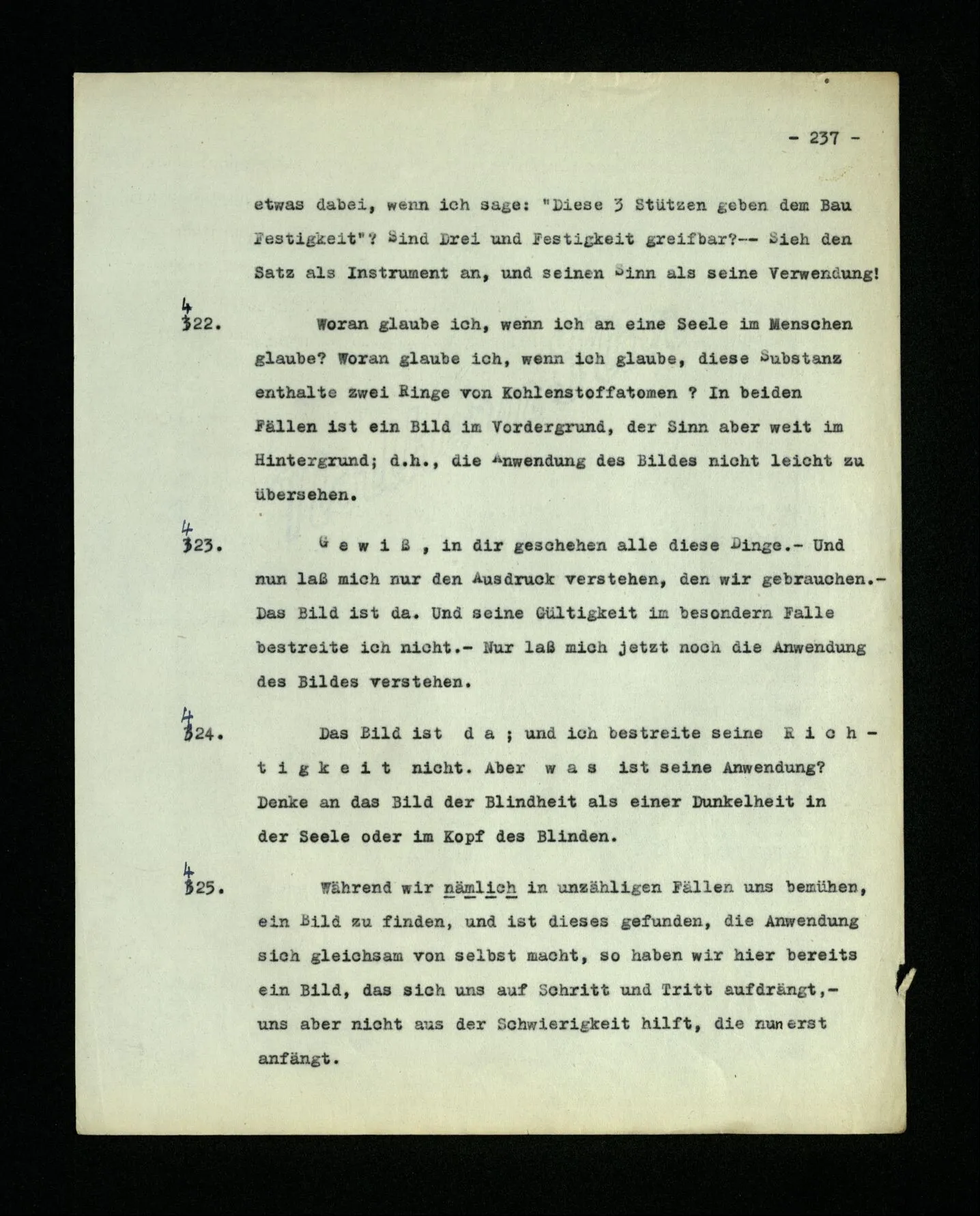 652. “Er maß ihn mit feindseligem Blick und sagte …” Der Leser der Erzählung versteht dies; er hat keinen Zweifel in seiner Seele. Nun sagst du: “Wohl, er denkt sich die Bedeutung hinzu, er errät sie.” – Im allgemeinen: Nein. Im allgemeinen denkt er sich nichts hinzu, errät nichts. – Es ist aber auch möglich, daß der feindselige Blick und die Worte sich später als Verstellung erweisen, oder daß der Leser im Zweifel darüber erhalten wird, ob sie es sind oder nicht, und daß er also wirklich auf eine mögliche Deutung rät. – Aber dann rät er vor allem auf einen Zusammenhang. Er sagt sich etwa: die Beiden, die hier so feindlich tun, sind in Wirklichkeit Freunde, etc. etc. ((“Wenn du den Satz verstehen willst, mußt du dir die seelische Bedeutung, die Seelenzustände, dazu vorstellen.”))