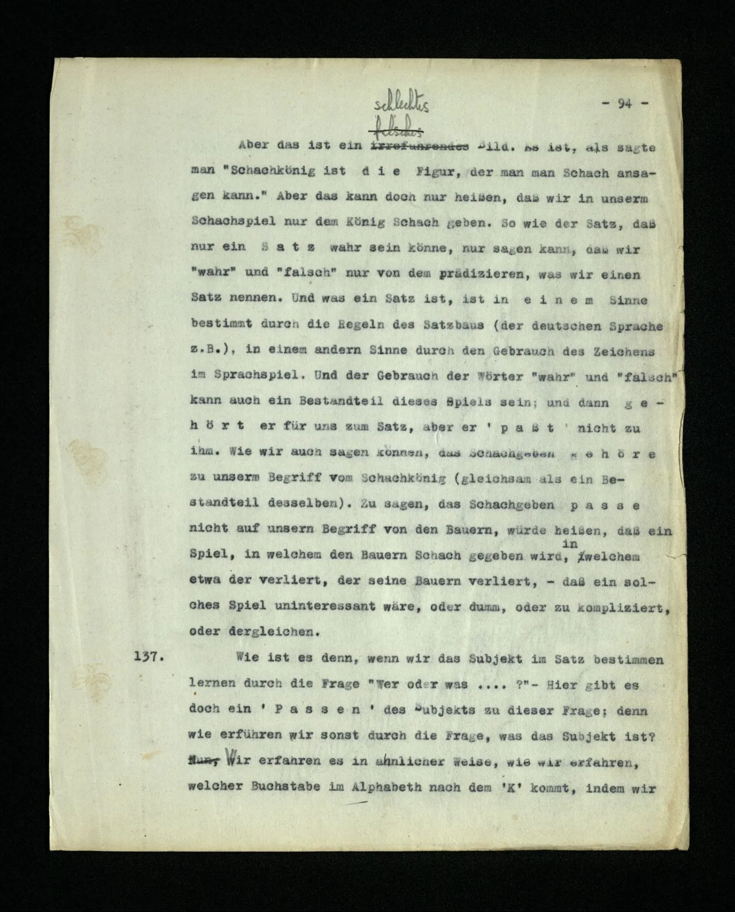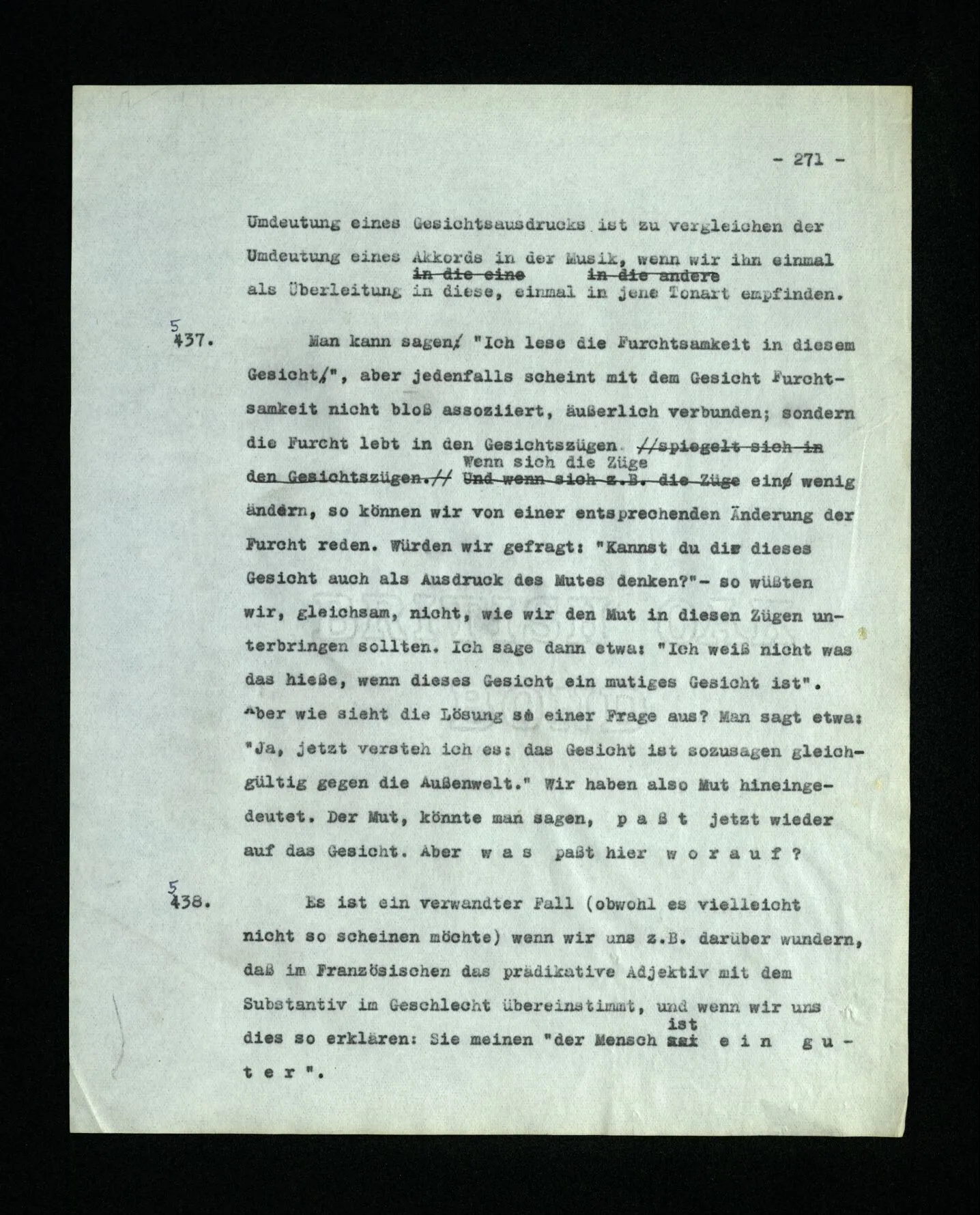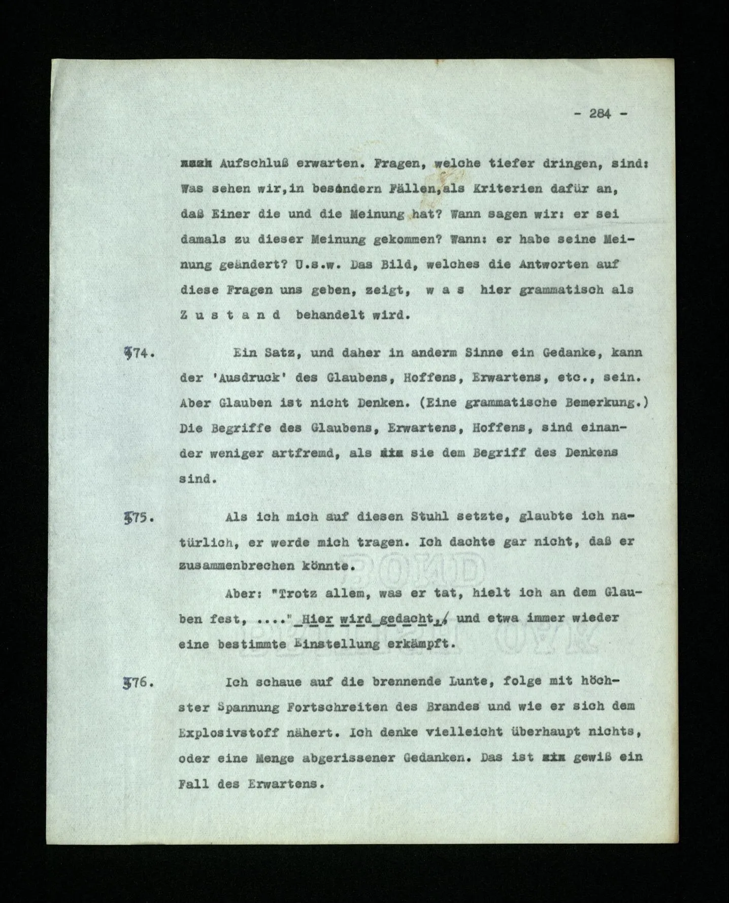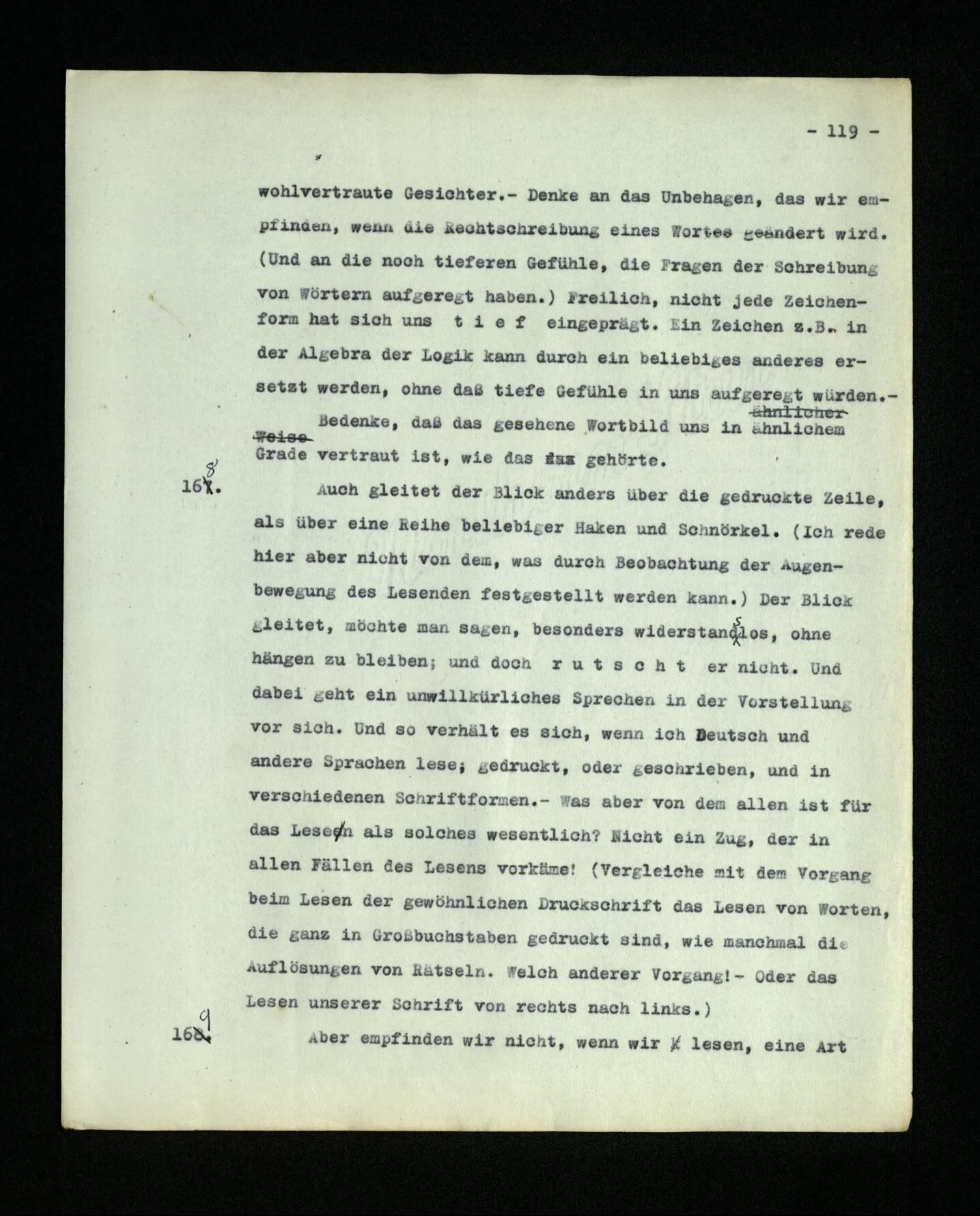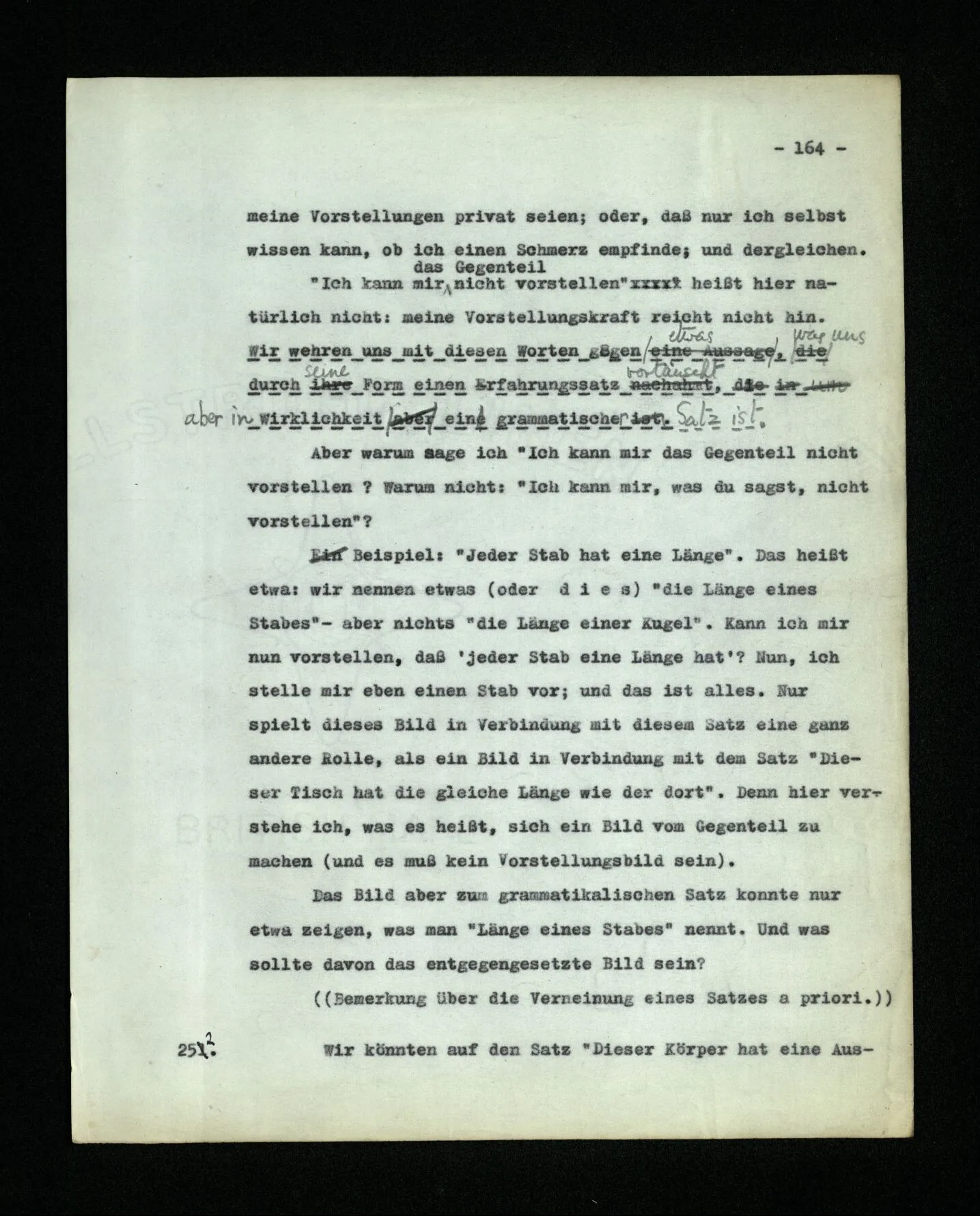 652. “Er maß ihn mit feindseligem Blick und sagte …” Der Leser der Erzählung versteht dies; er hat keinen Zweifel in seiner Seele. Nun sagst du: “Wohl, er denkt sich die Bedeutung hinzu, er errät sie.” – Im allgemeinen: Nein. Im allgemeinen denkt er sich nichts hinzu, errät nichts. – Es ist aber auch möglich, daß der feindselige Blick und die Worte sich später als Verstellung erweisen, oder daß der Leser im Zweifel darüber erhalten wird, ob sie es sind oder nicht, und daß er also wirklich auf eine mögliche Deutung rät. – Aber dann rät er vor allem auf einen Zusammenhang. Er sagt sich etwa: die Beiden, die hier so feindlich tun, sind in Wirklichkeit Freunde, etc. etc. ((“Wenn du den Satz verstehen willst, mußt du dir die seelische Bedeutung, die Seelenzustände, dazu vorstellen.”))